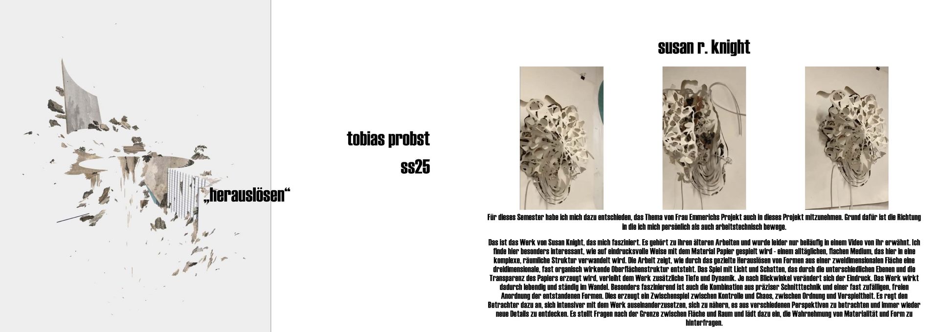 Das ist das Werk von Susan Knight, das mich fasziniert. Es gehört zu ihren älteren Arbeiten und wurde leider nur beiläufig in einem Video von ihr erwähnt. Ich finde hier besonders interessant, wie auf eindrucksvolle Weise mit dem Material Papier gespielt wird - einem alltäglichen, flachen Medium, das hier in eine komplexe, räumliche Struktur verwandelt wird. Die Arbeit zeigt, wie durch das gezielte Herauslösen von Formen aus einer zweidimensionalen Fläche eine dreidimensionale, fast organisch wirkende Oberflächenstruktur entsteht. Das Spiel mit Licht und Schatten, das durch die unterschiedlichen Ebenen und die Transparenz des Papiers erzeugt wird, verleiht dem Werk zusätzliche Tiefe und Dynamik. Je nach Blickwinkel verändert sich der Eindruck.