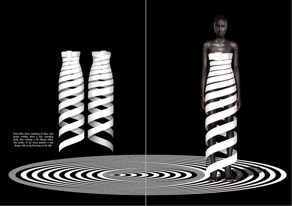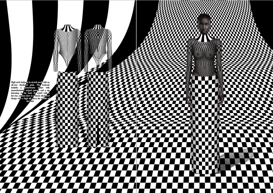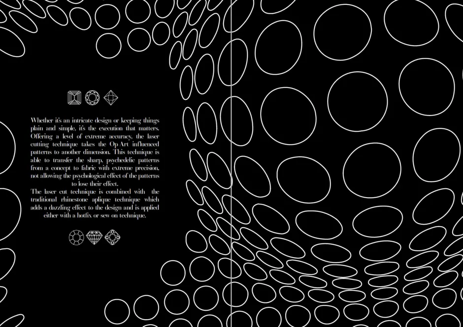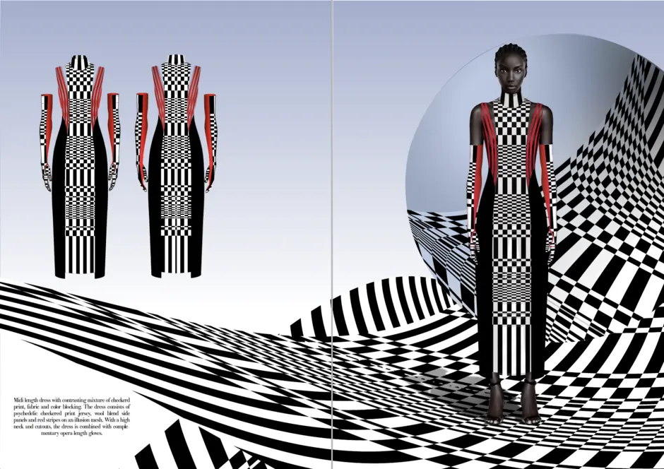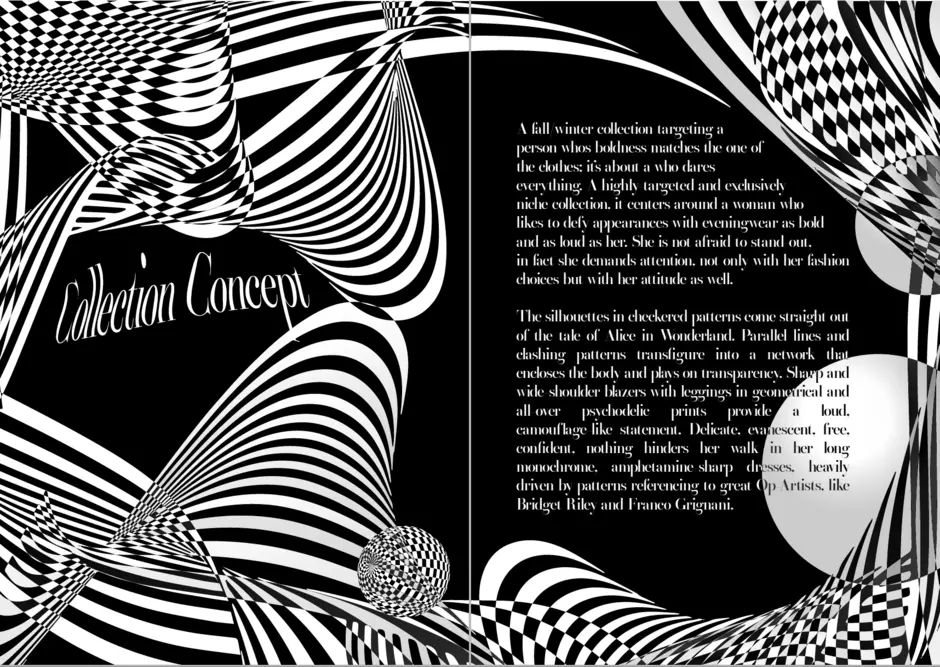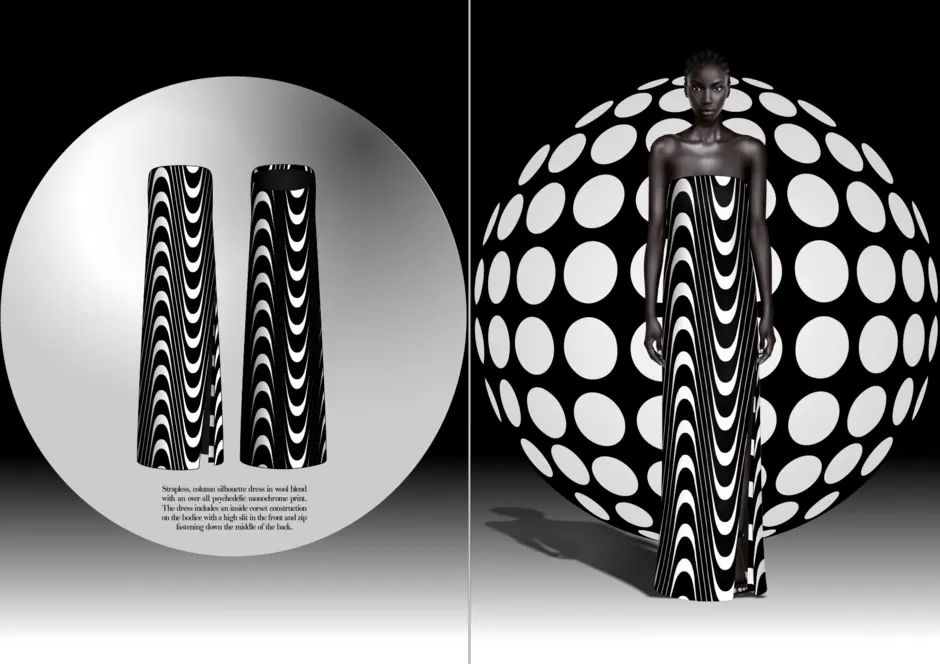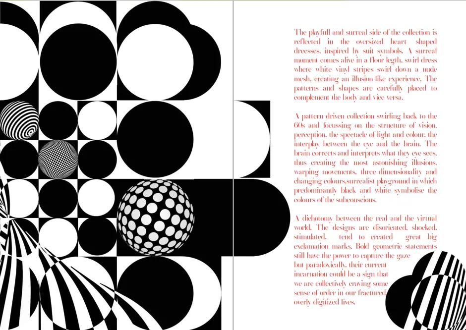 A pattern-driven collection swirling back to the 60s and focussing on the structure of vision, perception, the spectacle of light and colour, the interplay between the eye and the brain. The brain corrects and interprets what they eye sees, thus creating the most astonishing illusions, warping movements, three-dimensionality and changing colours.surrealist playground in which predominantly black and white symbolise the colours of the subconscious.
