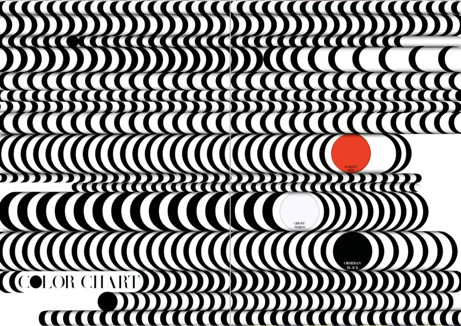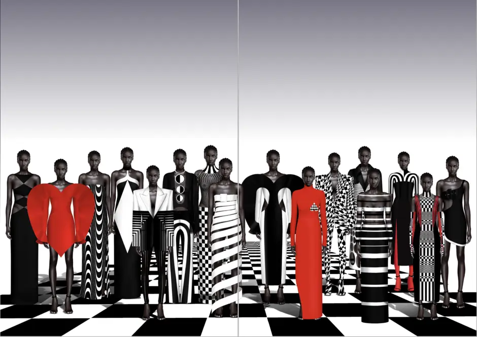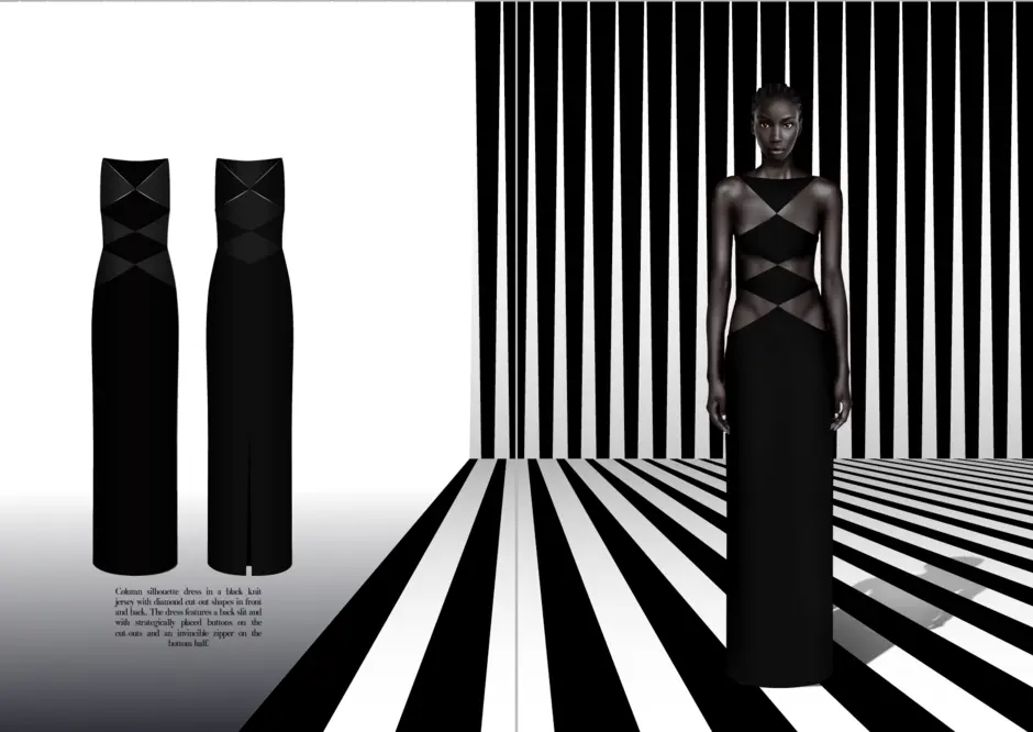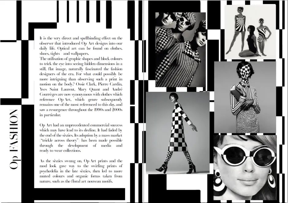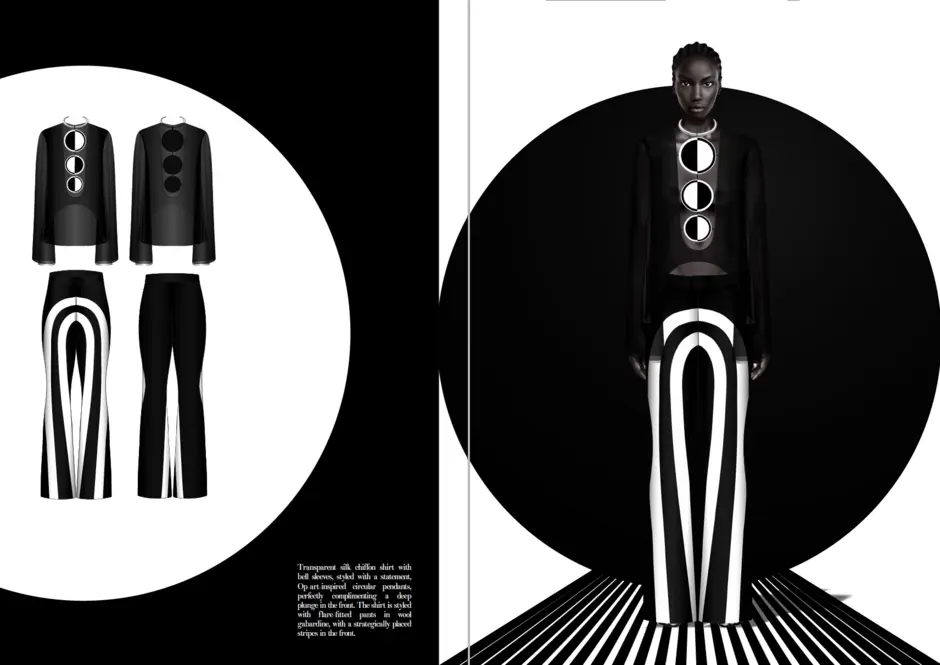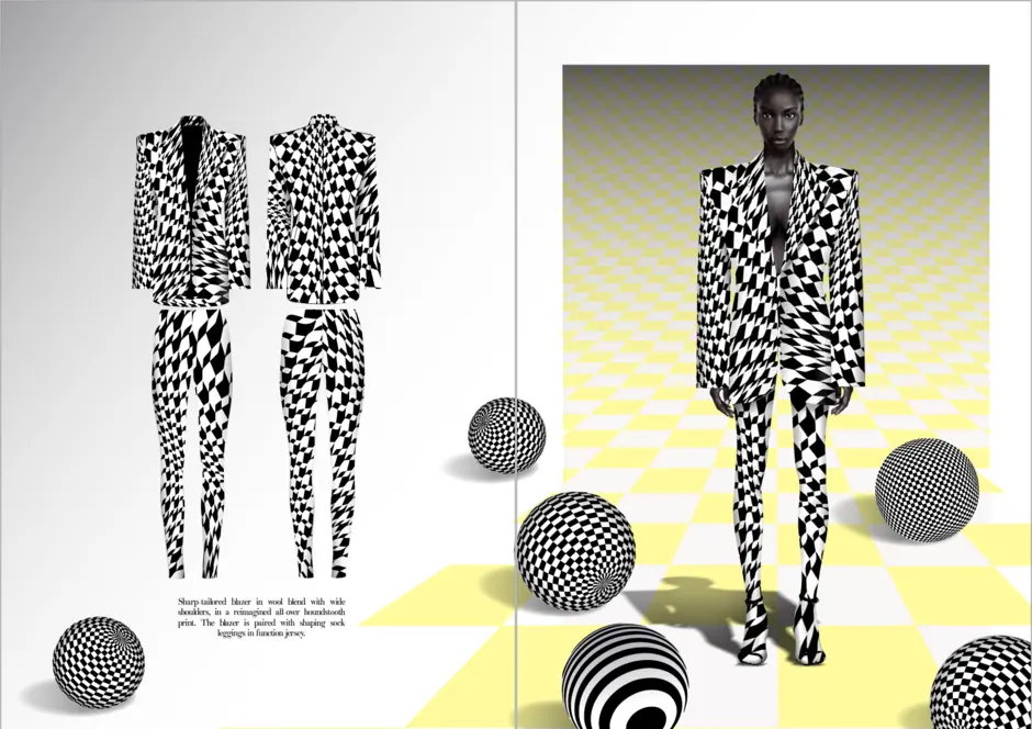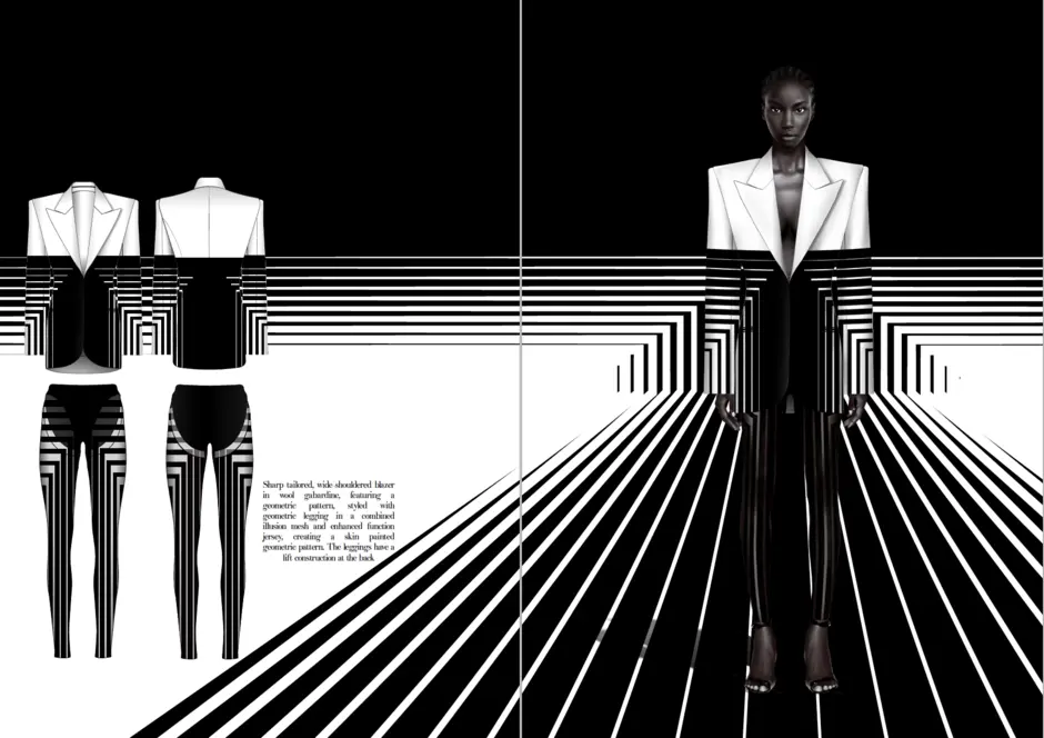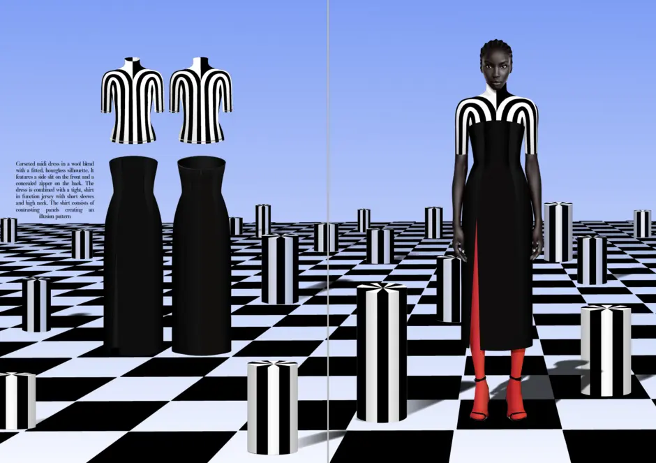A pattern-driven collection swirling back to the 60s and focussing on the structure of vision, perception, the spectacle of light and colour, the interplay between the eye and the brain. The brain corrects and interprets what they eye sees, thus creating the most astonishing illusions, warping movements, three-dimensionality and changing colours.surrealist playground in which predominantly black and white symbolise the colours of the subconscious.