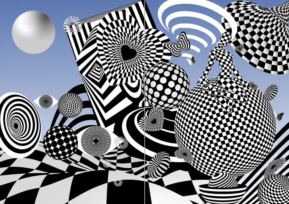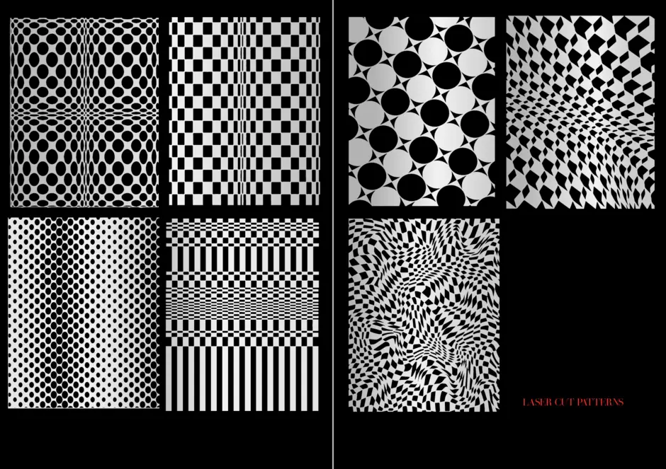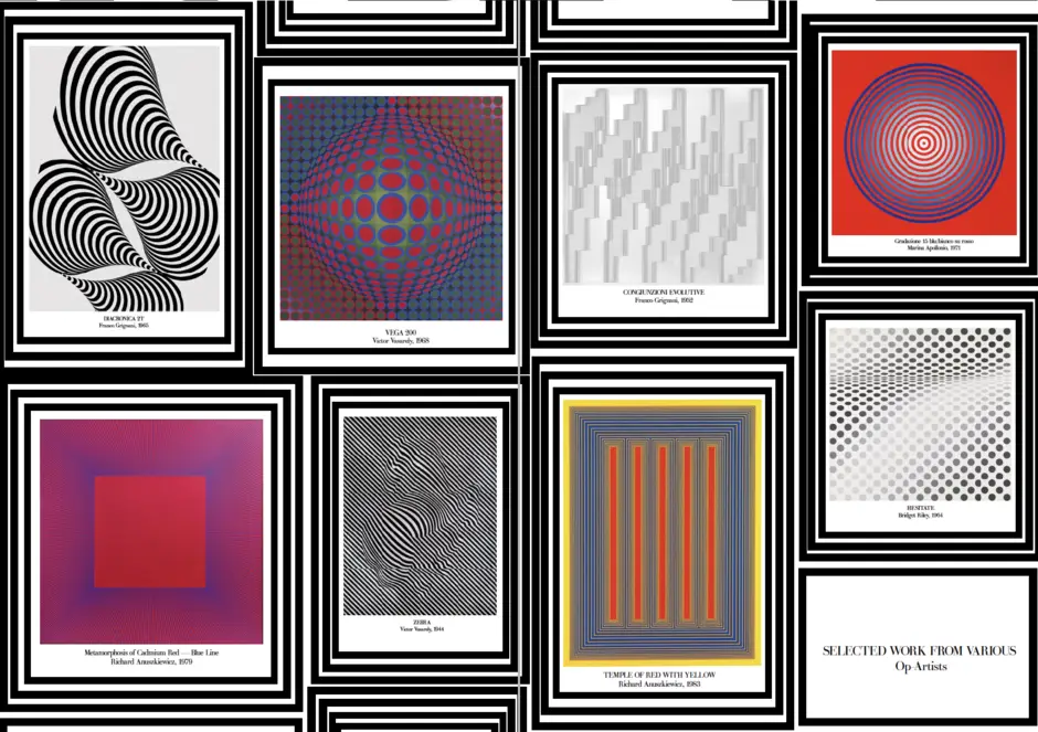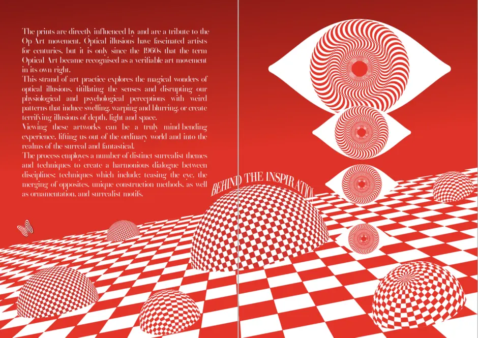 The prints are directly influenced by and are a tribute to the Op-Art movement. Optical illusions have fascinated artists for centuries, but it is only since the 1960s that the term Optical Art became recognised as a verifiable art movement in its own right. This strand of art practice explores the magical wonders of optical illusions, titillating the senses and disrupting our physiological and psychological perceptions with weird patterns that induce swelling, warping and blurring, or create terrifying illusions of depth, light and space.