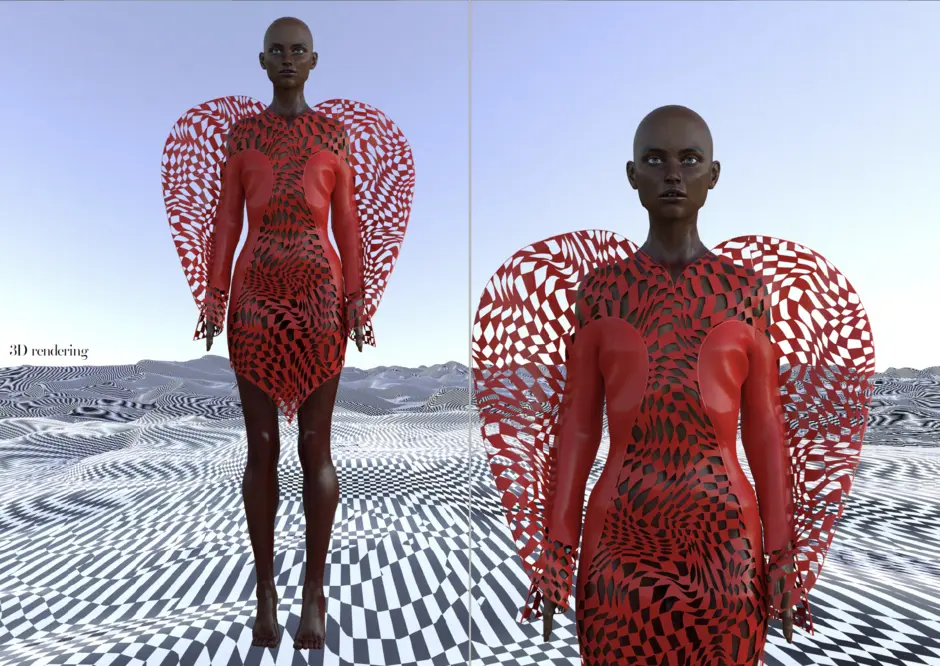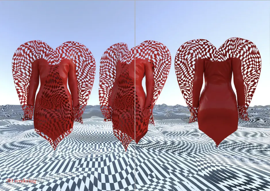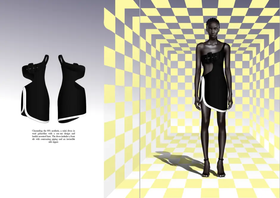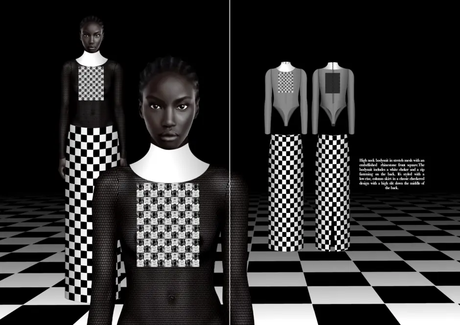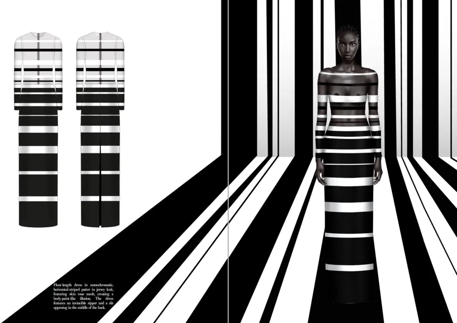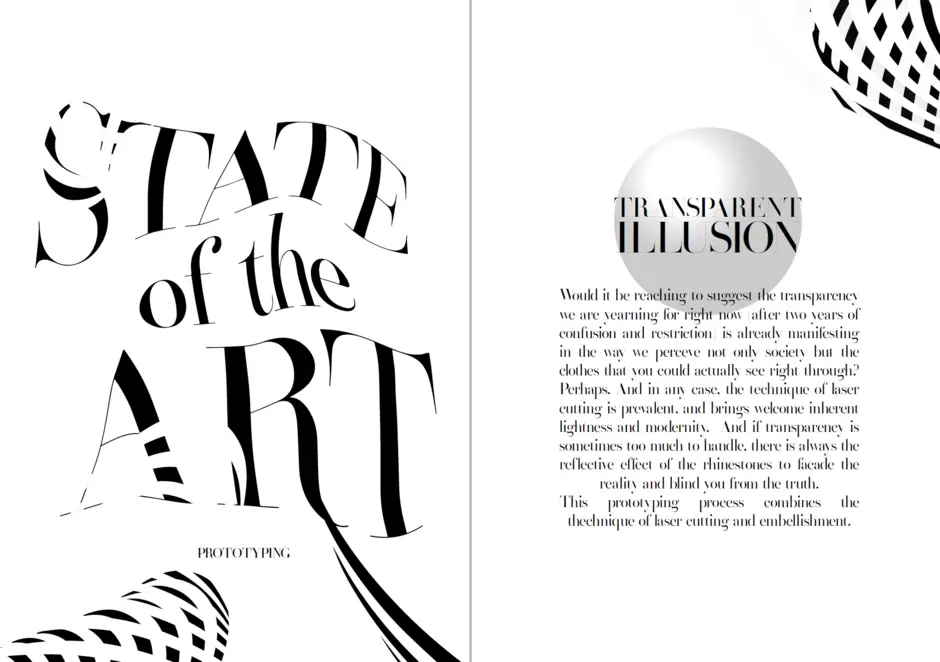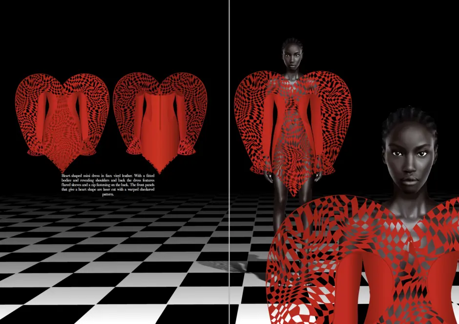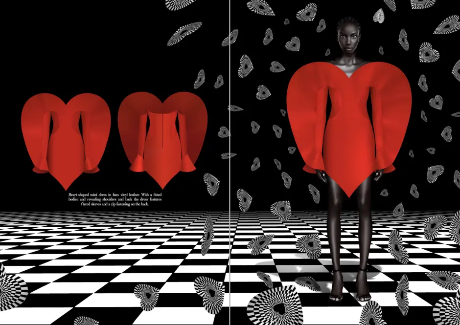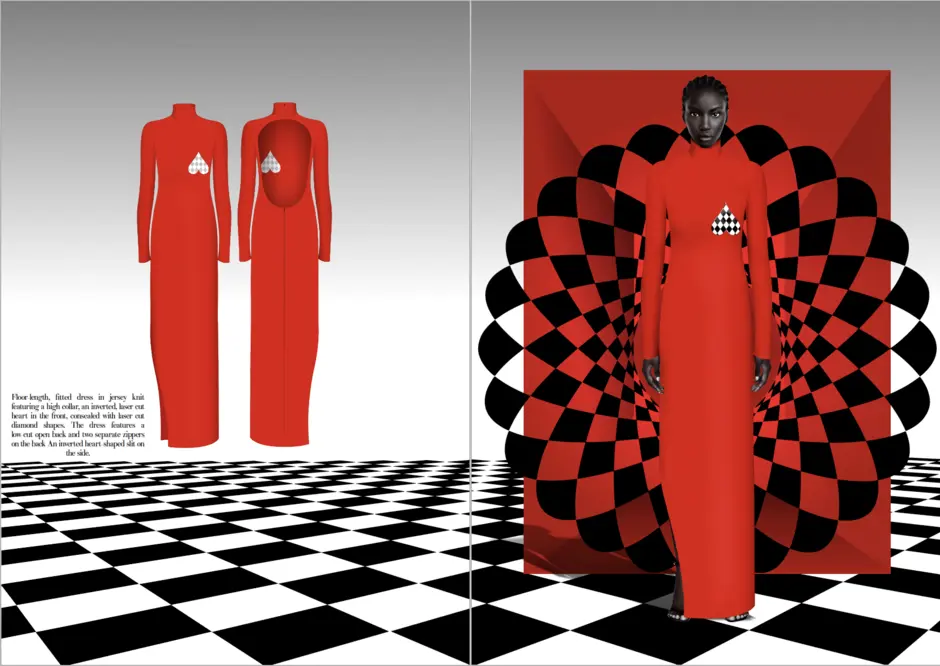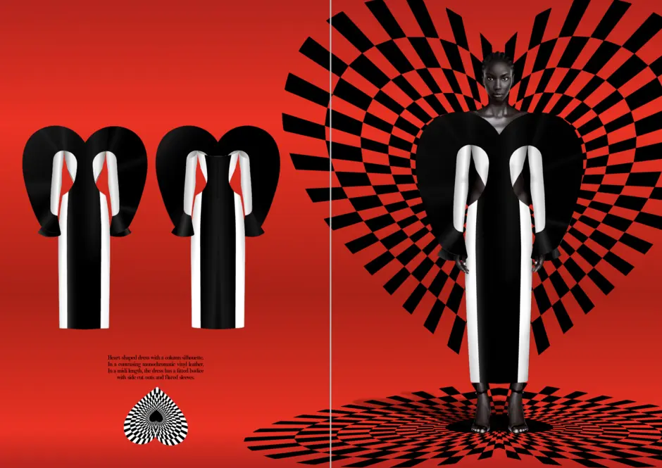 The playfull and surreal side of the collection is reflected in the oversized heart- shaped dreesses, inspired by suit symbols. A surreal moment comes alive in a floor-legth, swirl dress where white vinyl stripes swirl down a nude mesh, creating an illusion-like experience. The patterns and shapes are carefully placed to complement the body and vice versa.
