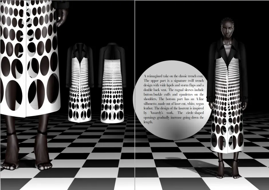 The silhouettes in checkered patterns come straight out of the tale of Alice in Wonderland. Parallel lines and clashing patterns transfigure into a network that encloses the body and plays on transparency. Sharp and wide-shoulder blazers with leggings in geometrical and all-over psychodelic prints provide a loud, camouflage-like statement. Delicate, evanescent, free, confident, nothing hinders her walk in her long monochrome, amphetamine-sharp dresses, heavily driven by patterns referencing to great Op-Artists, like Bridget Riley and Franco Grignani.