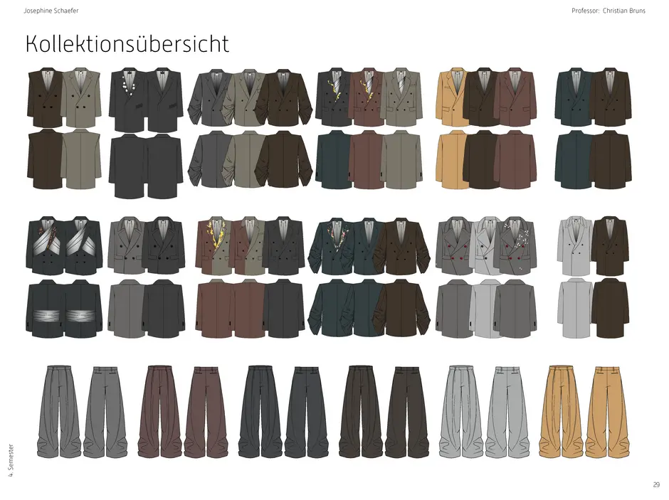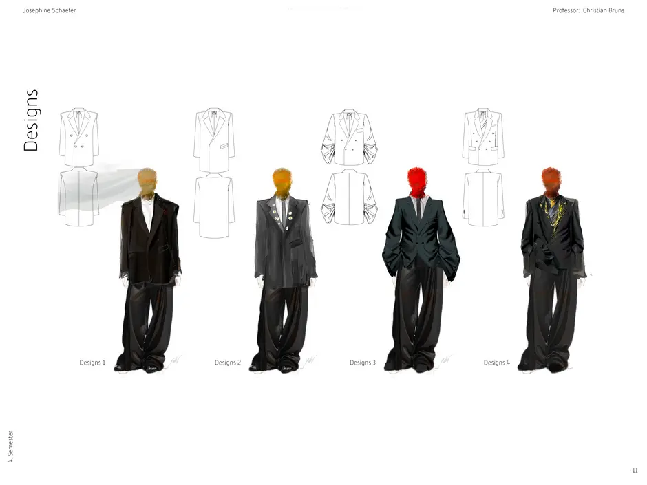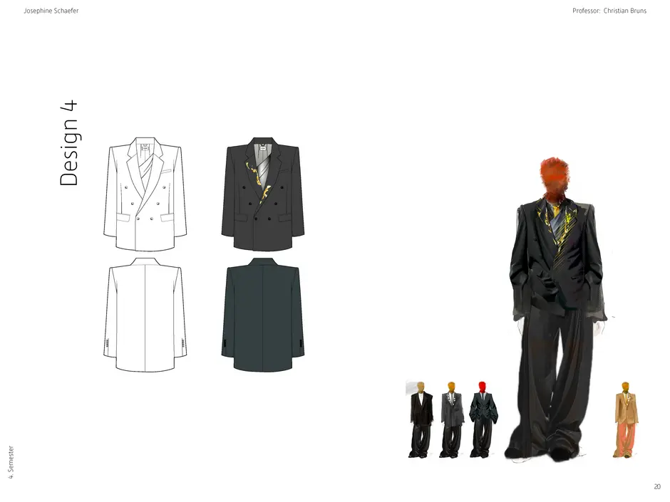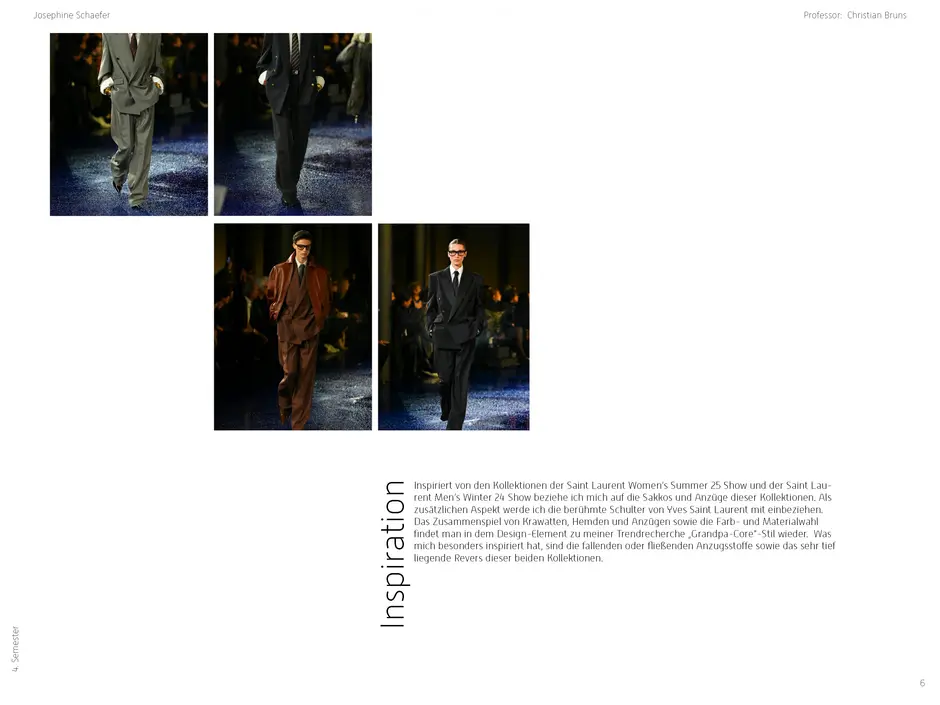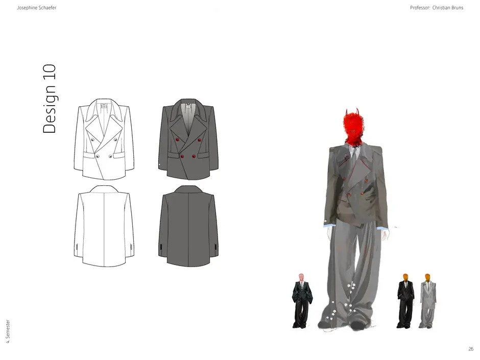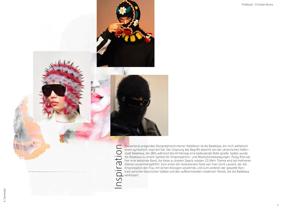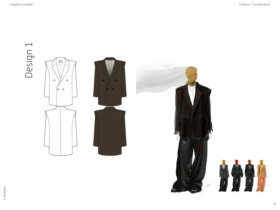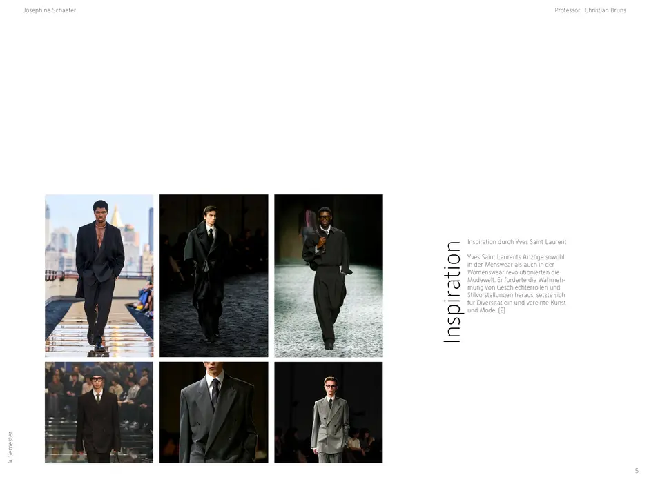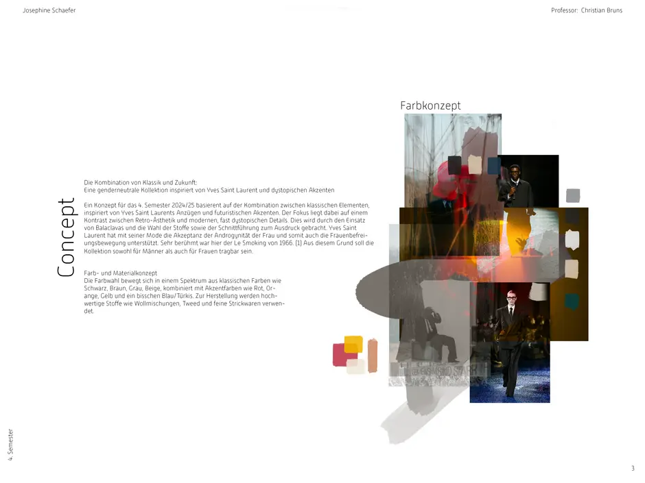 Ein Konzept für das 4. Semester 2024/25 basierent auf der Kombination zwischen klassischen Elementen, inspiriert von Yves Saint Laurents Anzügen und futuristischen Akzenten. Der Fokus liegt dabei auf einem Kontrast zwischen Retro-Ästhetik und modernen, fast dystopischen Details. Dies wird durch den Einsatz von Balaclavas und die Wahl der Stoffe sowie der Schnittführung zum Ausdruck gebracht. Yves Saint Laurent hat mit seiner Mode die Akzeptanz der Androgynität der Frau und somit auch die Frauenbefrei-ungsbewegung unterstützt. Sehr berühmt war hier der Le Smoking von 1966. (1) Aus diesem Grund soll die Kollektion sowohl für Männer als auch für Frauen tragbar sein.