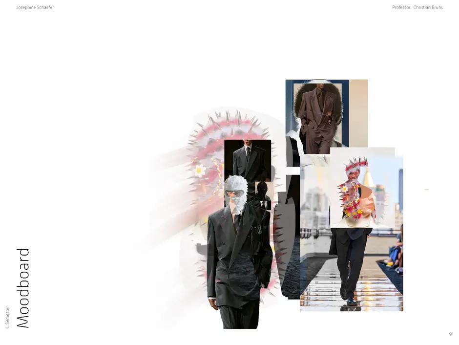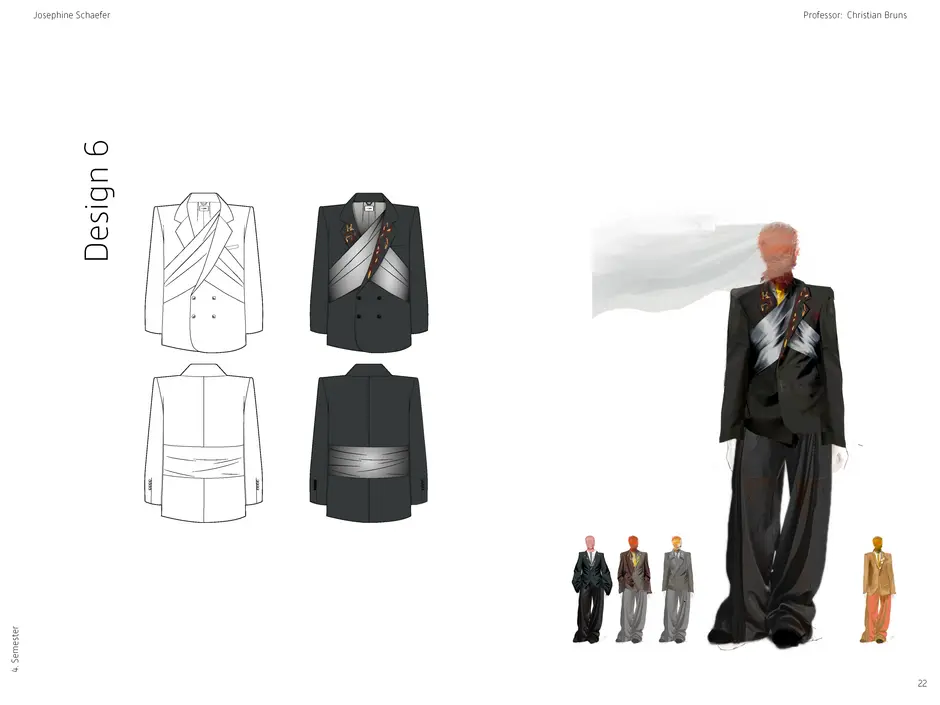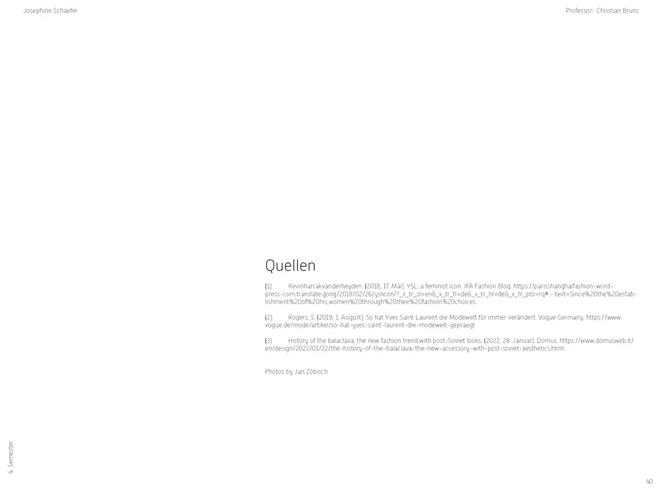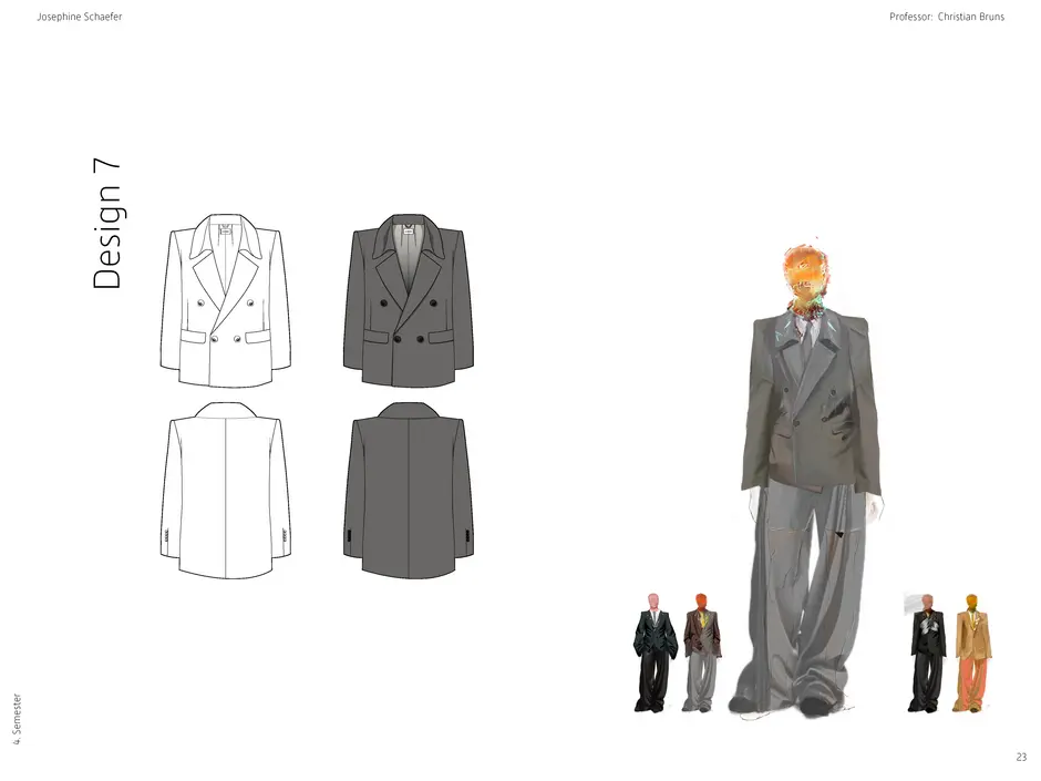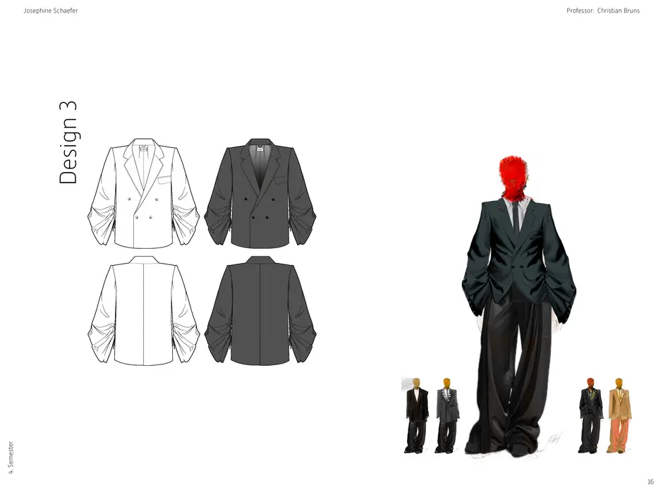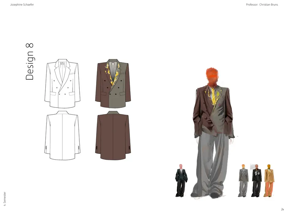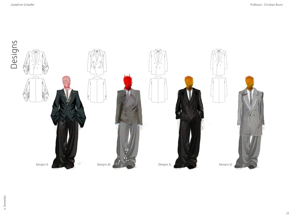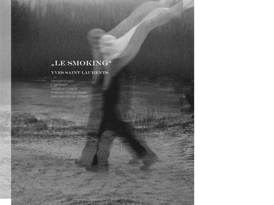 Ein Konzept für das 4. Semester 2024/25 basierent auf der Kombination zwischen klassischen Elementen, inspiriert von Yves Saint Laurents Anzügen und futuristischen Akzenten. Der Fokus liegt dabei auf einem Kontrast zwischen Retro-Ästhetik und modernen, fast dystopischen Details. Dies wird durch den Einsatz von Balaclavas und die Wahl der Stoffe sowie der Schnittführung zum Ausdruck gebracht. Yves Saint Laurent hat mit seiner Mode die Akzeptanz der Androgynität der Frau und somit auch die Frauenbefrei-ungsbewegung unterstützt. Sehr berühmt war hier der Le Smoking von 1966. (1) Aus diesem Grund soll die Kollektion sowohl für Männer als auch für Frauen tragbar sein.