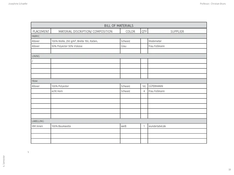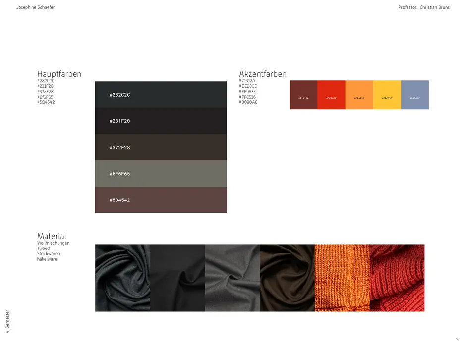 Die Farbwahl bewegt sich in einem Spektrum aus klassischen Farben wie Schwarz, Braun, Grau, Beige, kombiniert mit Akzentfarben wie Rot, Or-ange, Gelb und ein bisschen Blau/Türkis. Zur Herstellung werden hochwertige Stoffe wie Wollmischungen, Tweed und feine Strickwaren verwen-det.