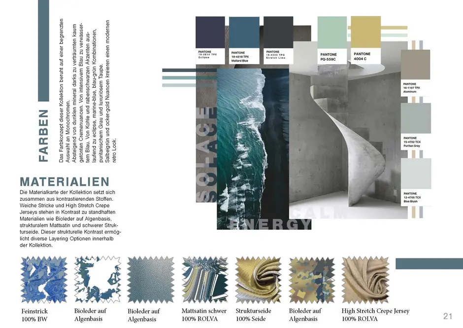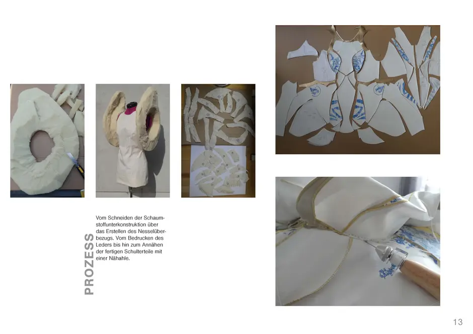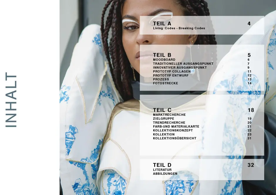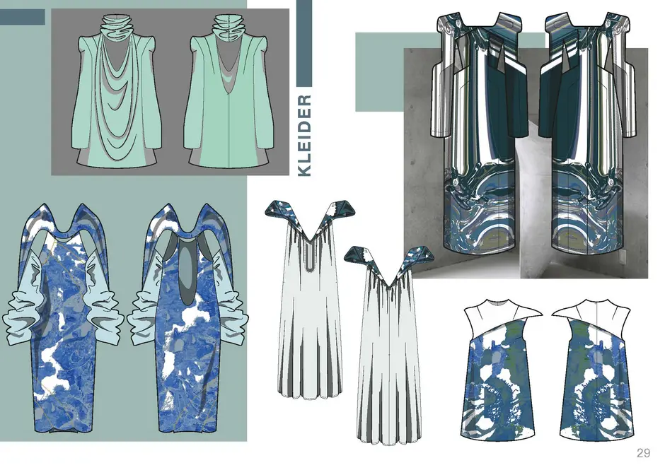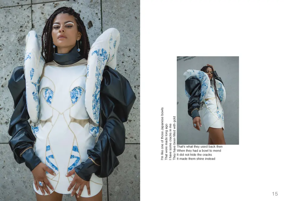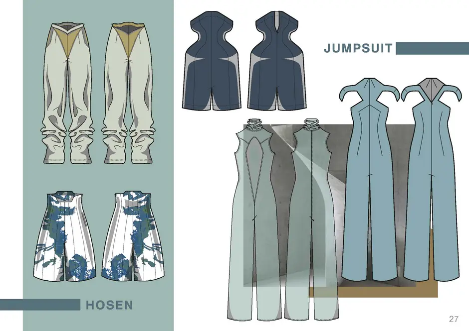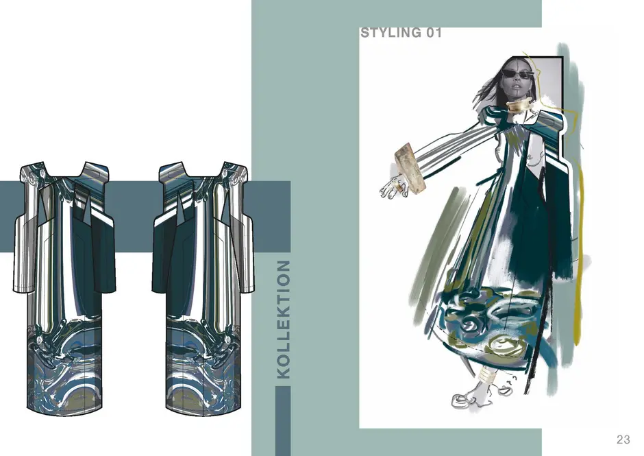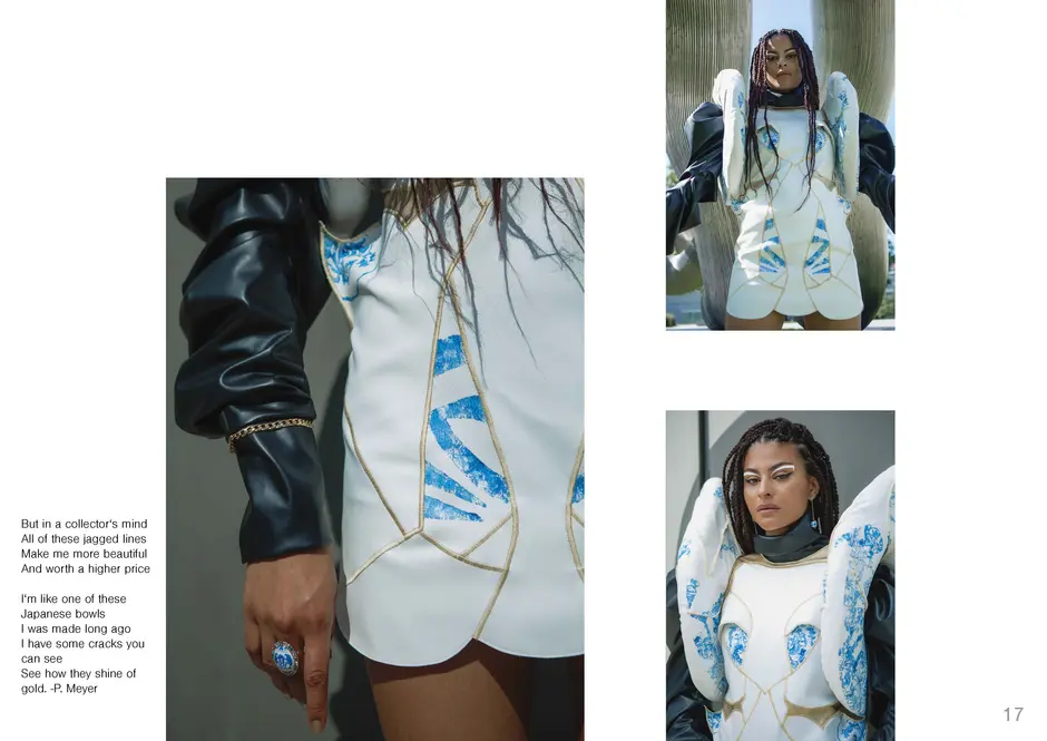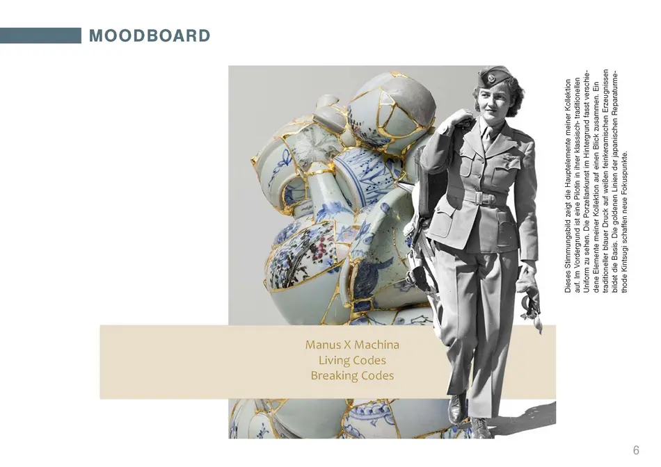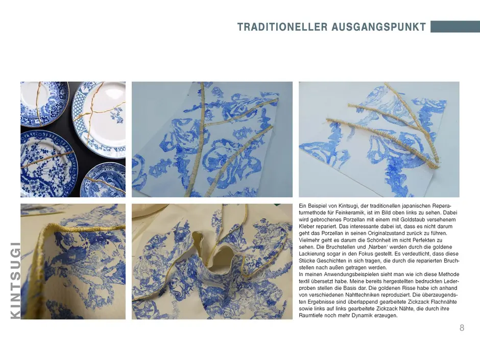 Um ein facettenreicheres Gesamtkonzept zu erhalten beschäftige ich mich zusätzlich mit verschiedenen traditionellen und innovativen Elementen, die meine Kollektion prägen. Mein traditioneller Ausgangspunkt basiert auf einer Holzstempel Druck Technik, bei welcher der Holzstempel selbst vorbereitend gesägt, gehobelt und geschnitzt wird und daraufhin mit diesem in Handarbeit Stoffe bedruckt werden. Ein zweiter traditioneller Ausgangspunkt ist Kintsugi, eine traditionelle japanische Reparaturmethode für Keramik. Hierbei werden fehlende Teile oder Bruchstellen mit Goldstaub versehenem Lack ergänzt.