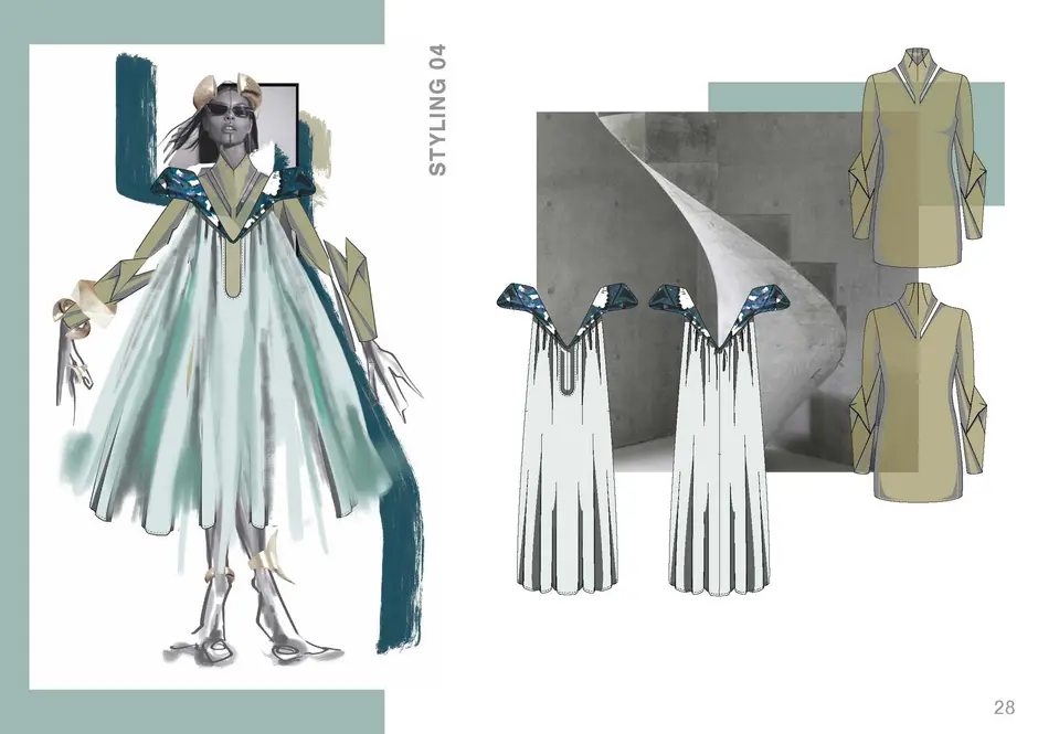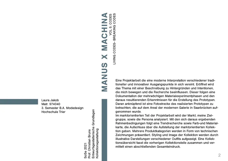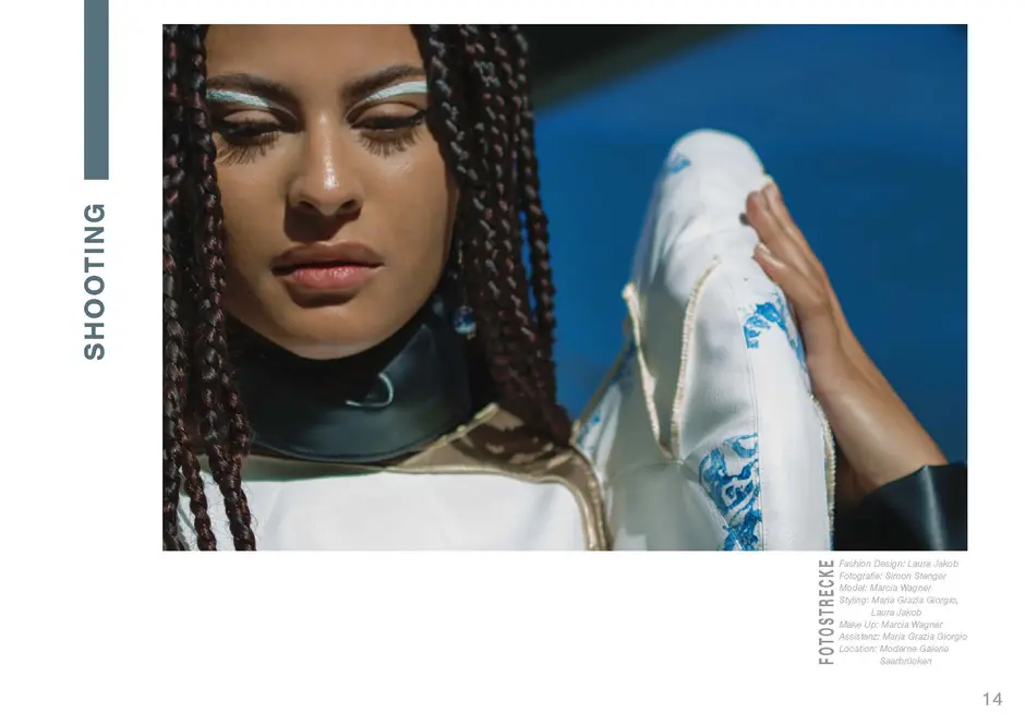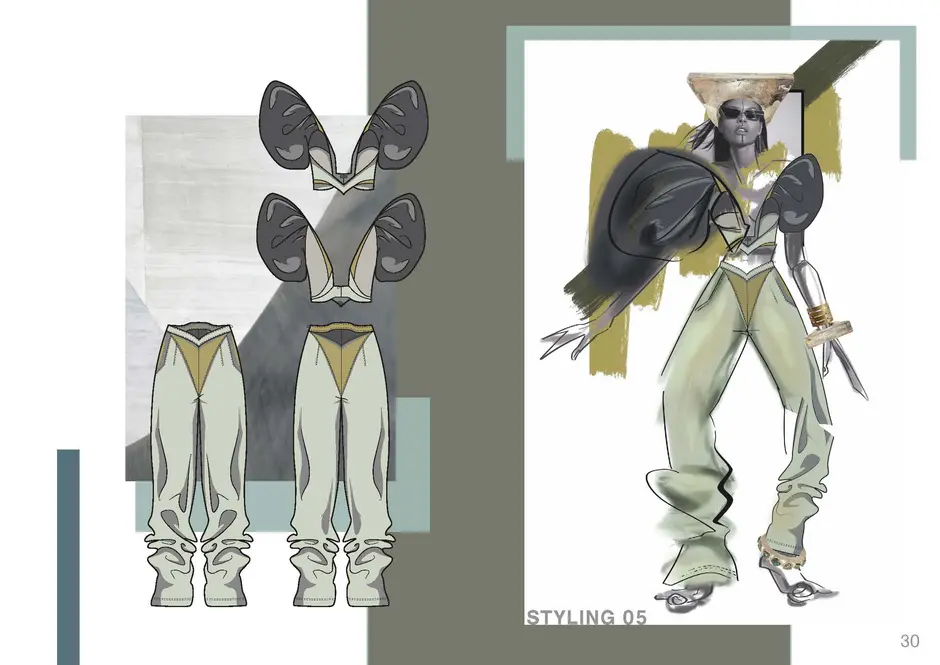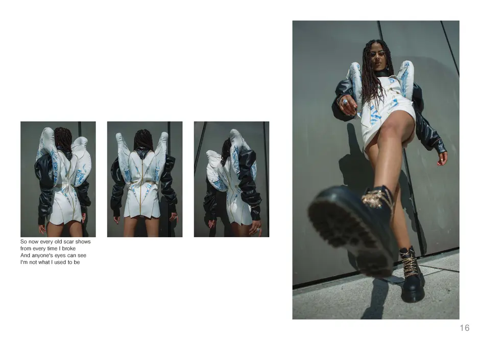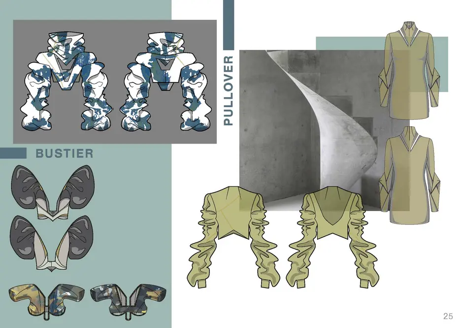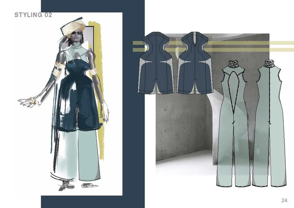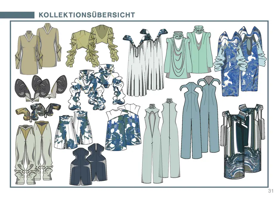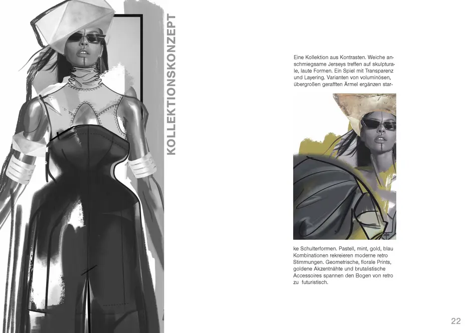 Einerseits betrachte ich Uniformen in der Arbeitswelt- von militärischen Uniformen und Business Attire bis hin zur selbstgewählten Uniform von Subkulturen.Von besonderem Interesse war hierbei die Uniform einer Fliegerpilotin. Ihre Uniform, bedingt durch den festen Stoff, vermittelt den Eindruck einer beinahe skulpturalen Form mit starker Taillen- und Schulterbetonung. Dem gegenüber steht die aus der Subkultur des Gothic entwickelte Health Goth und Street Goth Kultur. Ich bin interessiert daran die bestehende Ordnung aufzubrechen, zu dekonstruieren und verschiedene Elemente zu rekonstruieren, um ein neues Erscheinungsbild zu erreichen.