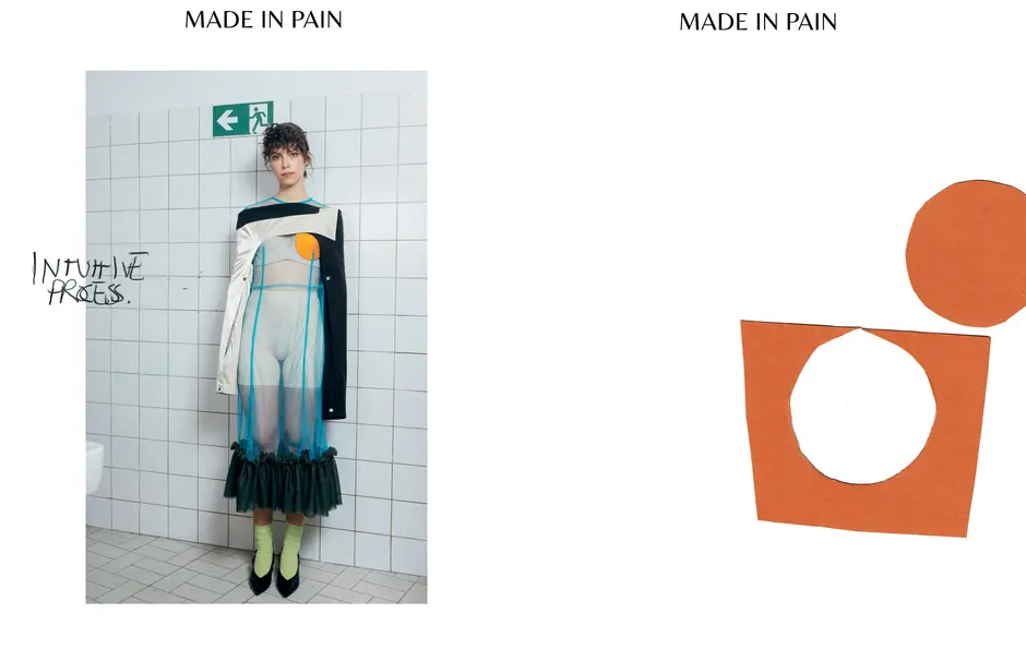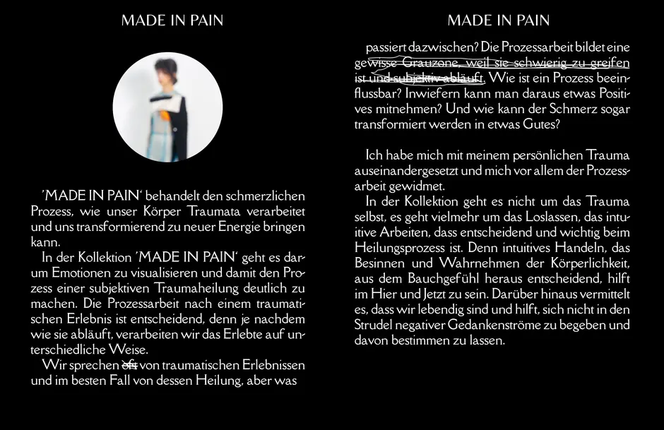 In der Kollektion "MADE IN PAIN" geht es nicht um das Trauma selbst, es geht vielmehr um das Loslassen, das intuitive Arbeiten, dass entscheidend und wichtig beim Heilungsprozess ist. Denn intuitives Handeln, das Besinnen und Wahrnehmen der Körperlichkeit, aus dem Bauchgefühl heraus entscheidend, hilft im Hier und Jetzt zu sein. Darüber hinaus vermittelt es, dass wir lebendig sind und hilft, sich nicht in den Strudel negativer Gedankenströme zu begeben und davon bestimmen zu lassen.