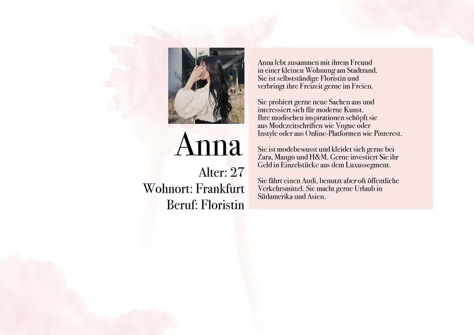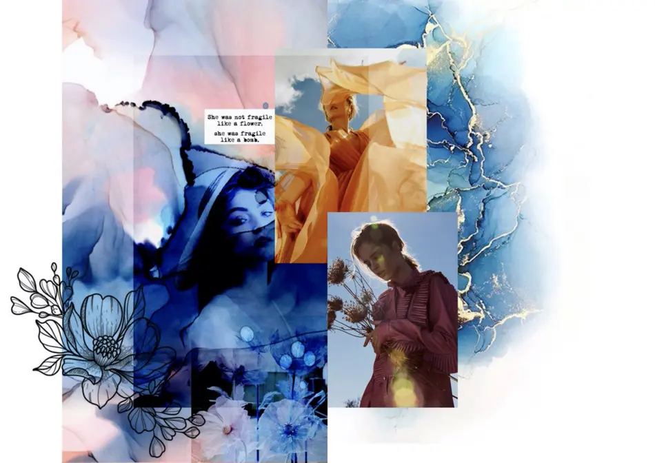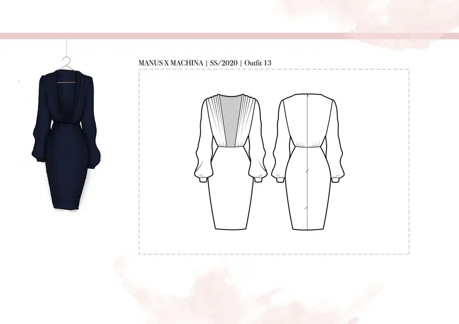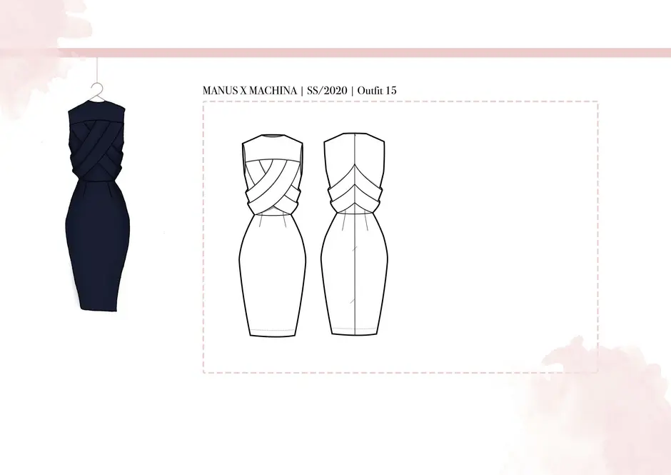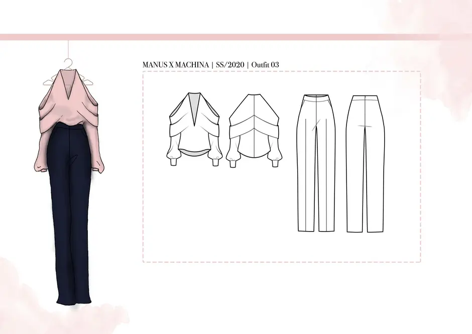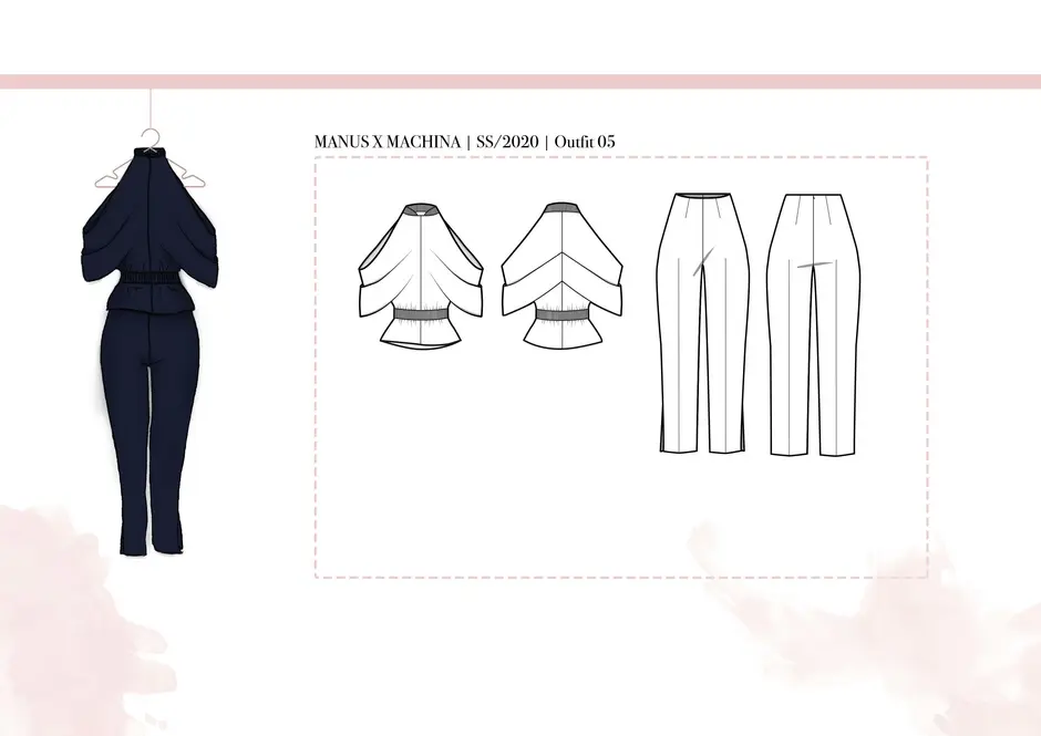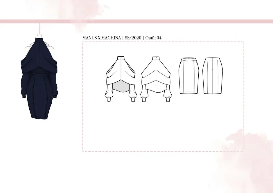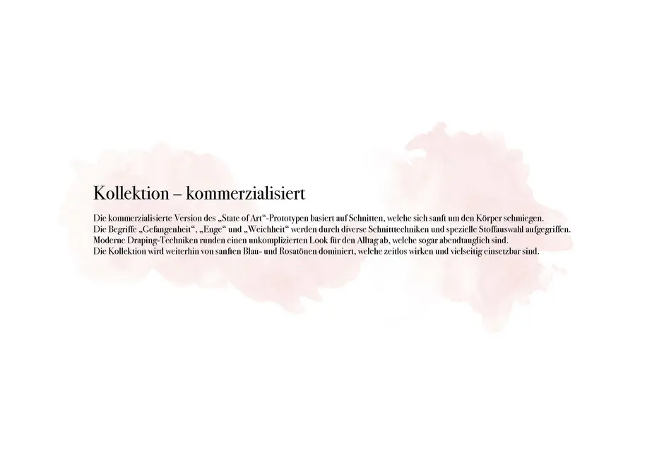 Die Stoffauswahl besteht aus weichen, transparenten und zart eingefärbten Textilien. Die Farben der Kollektion sind zurückhaltend, um die Beschaffenheit in den Fokus zu setzen. Die engen Bündchen um den Hals, die Handgelenke und den Bauch symbolisieren die Gefangenheit in der digitalen Welt. Die entgegengesetzten „Pfeilrichtungen“ am Oberteil und Rock symbolisieren das Kommunikationsproblem bzw. das auseinanderleben der Menschen, welches der Missbrauch der digitalen Medien mit sich bringen kann. Die Weichheit der Stoffe stellt unsere Empfindlichkeit nach.