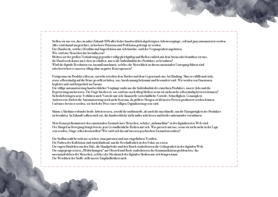 Manus x Machina verbindet beide Arbeitsweisen, sowohl die traditionelle, als auch die maschinelle, um die Einzigartigkeit des Produktes zu bewahren. In Zukunft sollten auch wir, das handwerkliche nicht außer acht lassen und beides miteinander vereinbaren. Mein Konzept thematisiert den emotionalen Zustand eines Menschen, welcher „unbrauchbar“ in der digitalisierten Welt wird. Der Mangel an Bewegung bringt bereits jetzt Gesundheitliche Risiken mit sich. Was passiert mit uns, wenn wir nicht mehr in der Lage sein werden, Dinge selbst herzustellen? Wie wird sich das auf unseren psychischen Zustand auswirken?