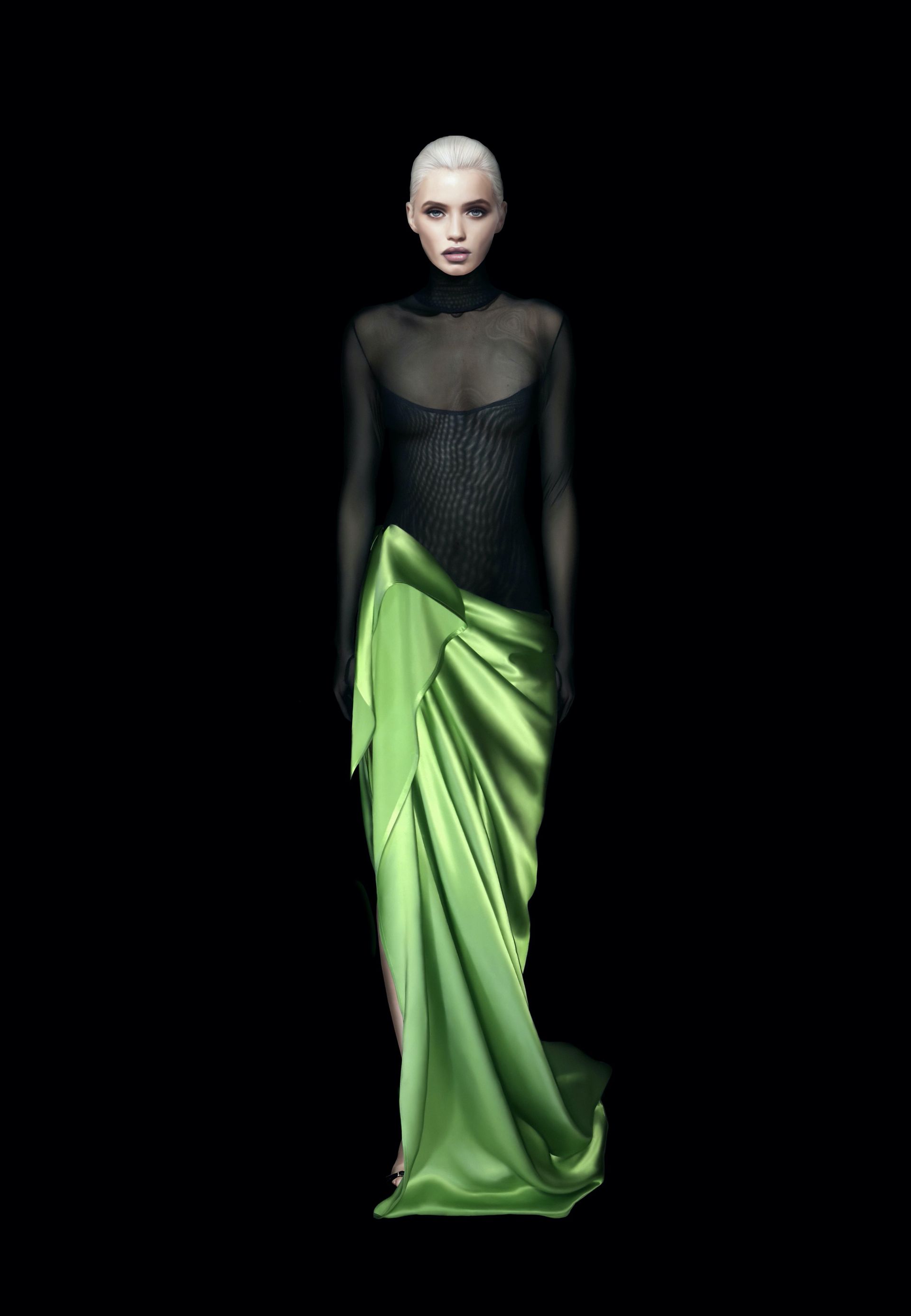 Die Kollektion betont Eros und ist eine verführerische Weiterentwicklung des triumphalen, körperpositiven Vintage-Futurismus. Mit einer neuen Dekadenz taucht es weiter in verführerische Weiblichkeit ein. Vielfältig, selbstbewusst, verführerisch, es ist eine Frau mit einer Einstellung, ein Raubtier. Sie verwöhnt ihre dunklere Seite und strahlt eine berauschende Aura aus, die niemand ignorieren kann. Eine selbstbewusste Sinnlichkeit bricht in einem Spiel des Enthüllens und Verbergens aus.