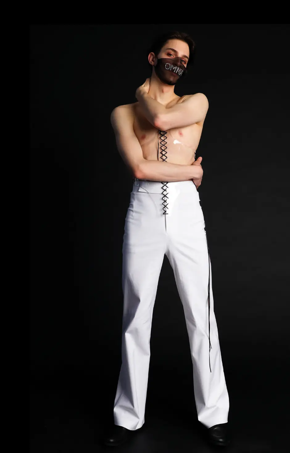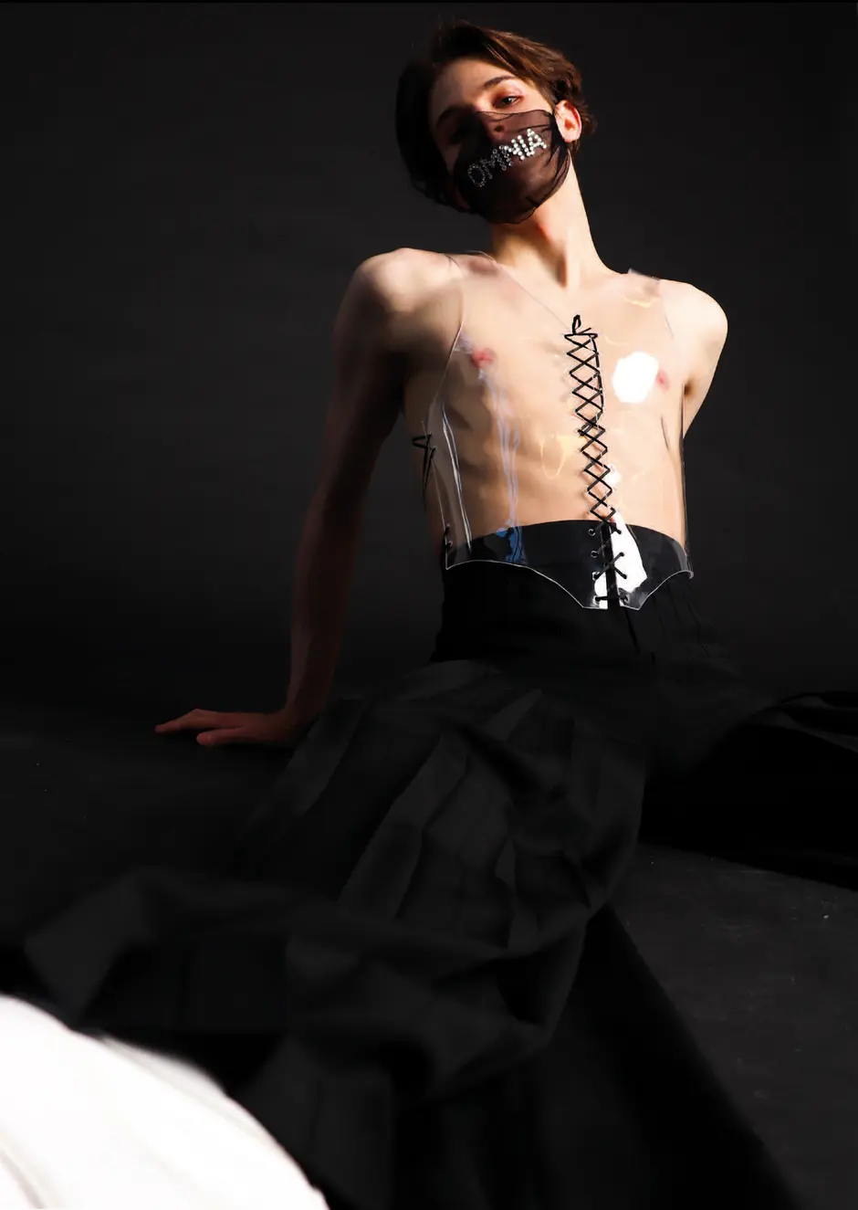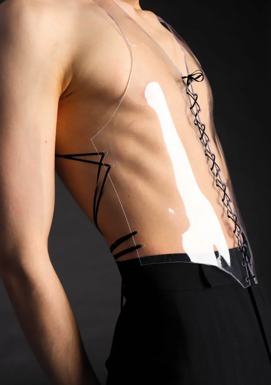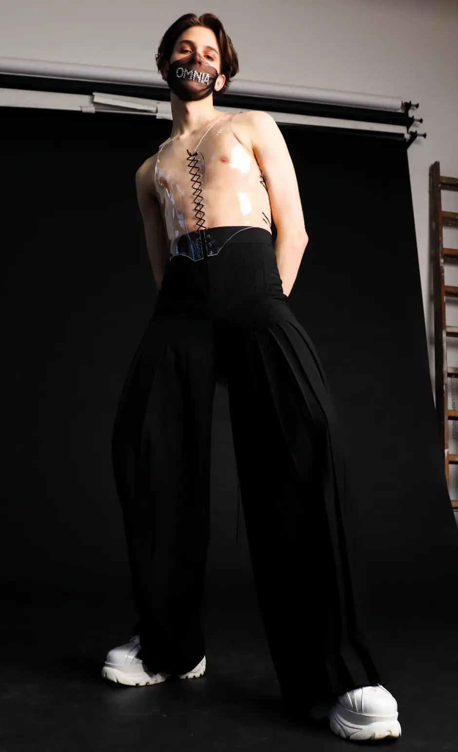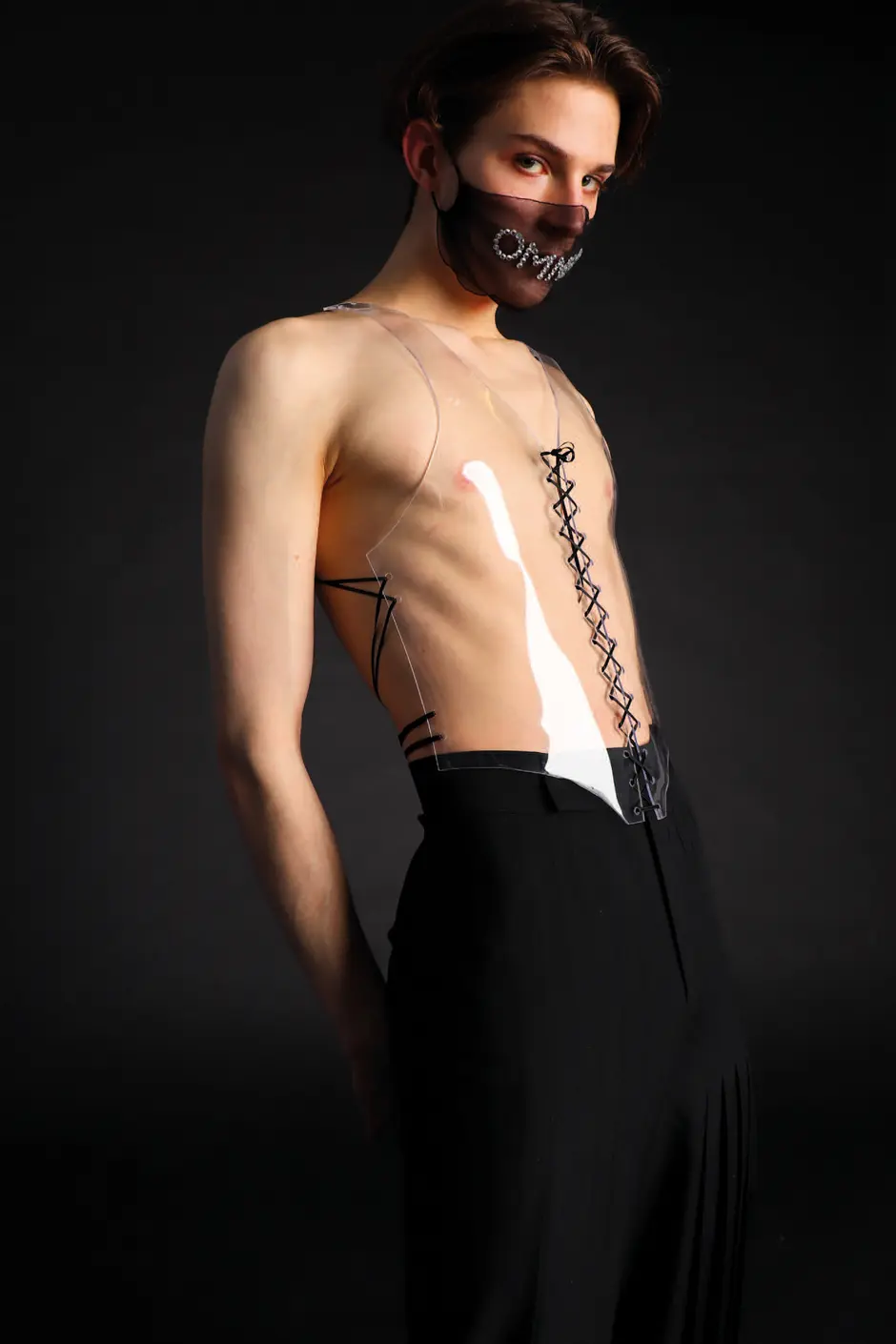 For our topic we had to combine a state-of-the-art technique with a traditional technique. Furthermore, we had to look deeper into what purpose clothes can serve besides covering our skin. My state-of-the-art technique turned out to be lasercutting and the thermoplastic molding of polystyrene glass to create the corsets. My traditional technique is displayed in the pants and mask. In the pants you find some handwork regarding the waistband (handstitching as done by tailors), the mask is hand embroidered with acrylic rhinestones. But what can these pieces do besides dress a body? They are a result of a collective opinion on gender. This collection was created with a critical view on the gendering of clothes. You set a statement of not conforming with stereotypical, social gender norms regarding clothes. Furthermore, I include tradition, such as the Marlene Dietrich pants or armors. And after all the corsets will give you protection against physical influences.