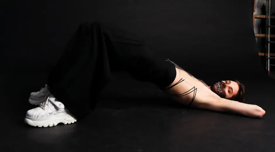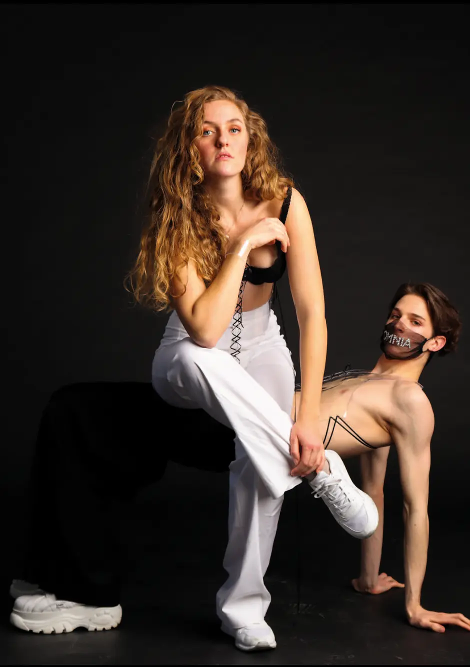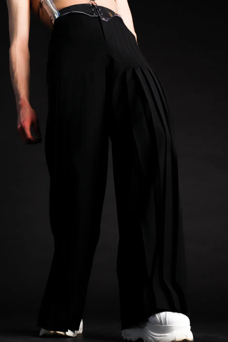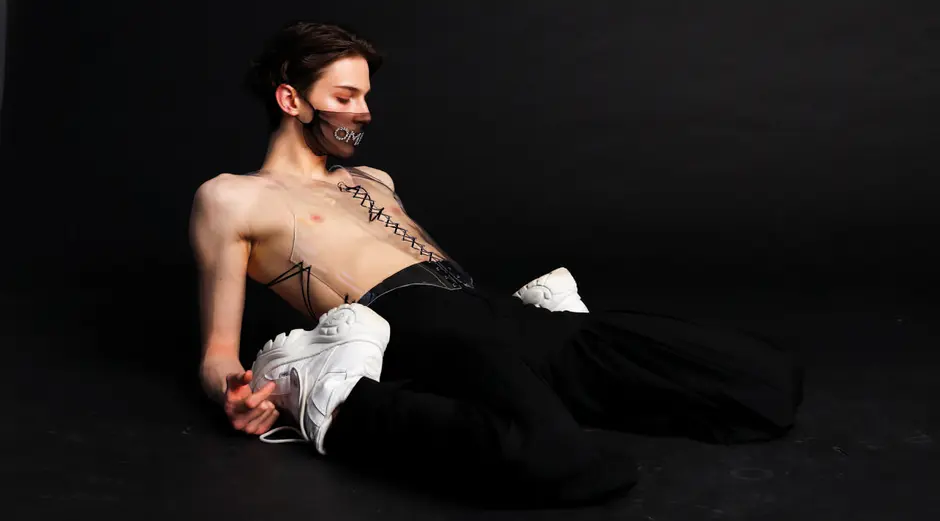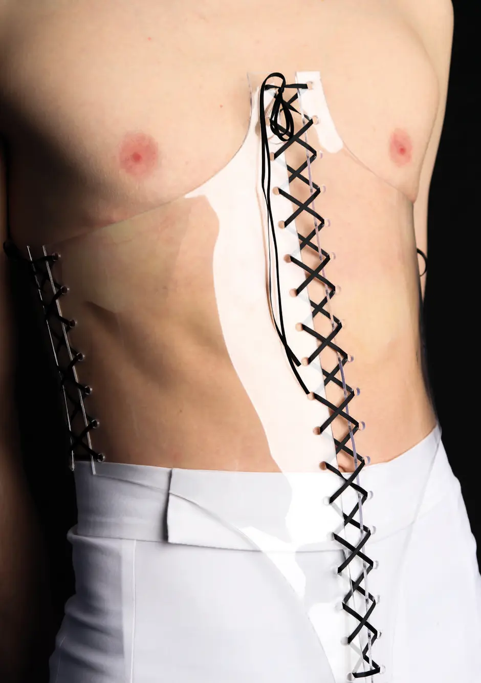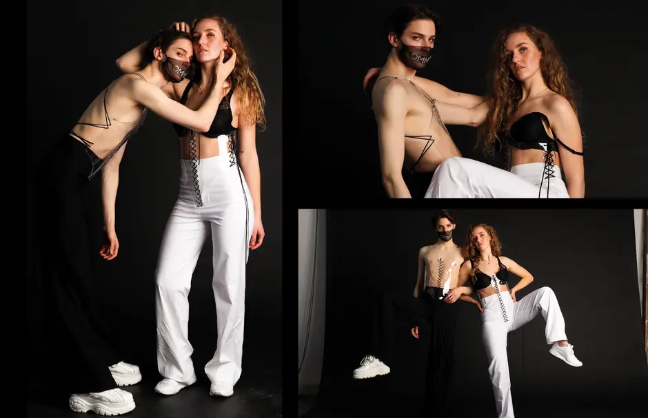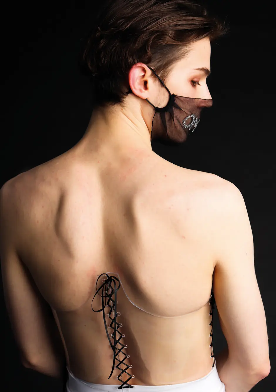 For our topic we had to combine a state-of-the-art technique with a traditional technique. Furthermore, we had to look deeper into what purpose clothes can serve besides covering our skin. My state-of-the-art technique turned out to be lasercutting and the thermoplastic molding of polystyrene glass to create the corsets. My traditional technique is displayed in the pants and mask. In the pants you find some handwork regarding the waistband (handstitching as done by tailors), the mask is hand embroidered with acrylic rhinestones. But what can these pieces do besides dress a body? They are a result of a collective opinion on gender. This collection was created with a critical view on the gendering of clothes. You set a statement of not conforming with stereotypical, social gender norms regarding clothes. Furthermore, I include tradition, such as the Marlene Dietrich pants or armors. And after all the corsets will give you protection against physical influences.
