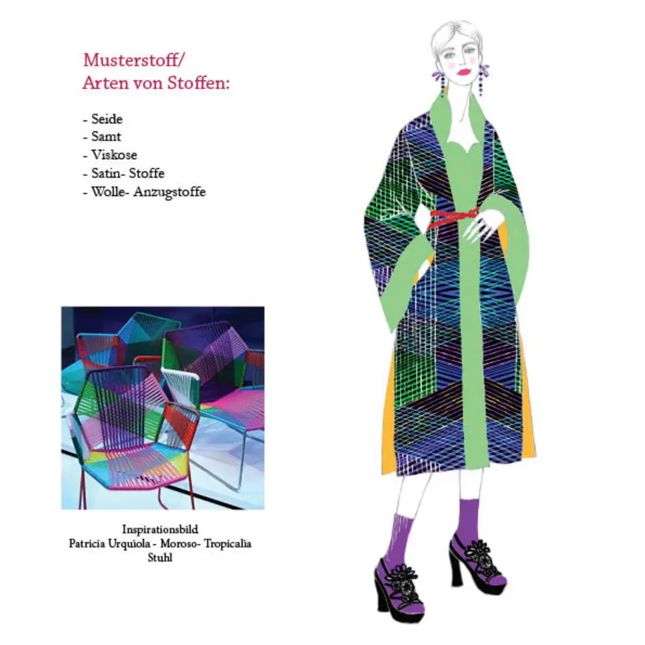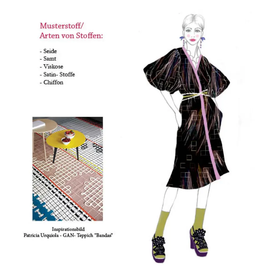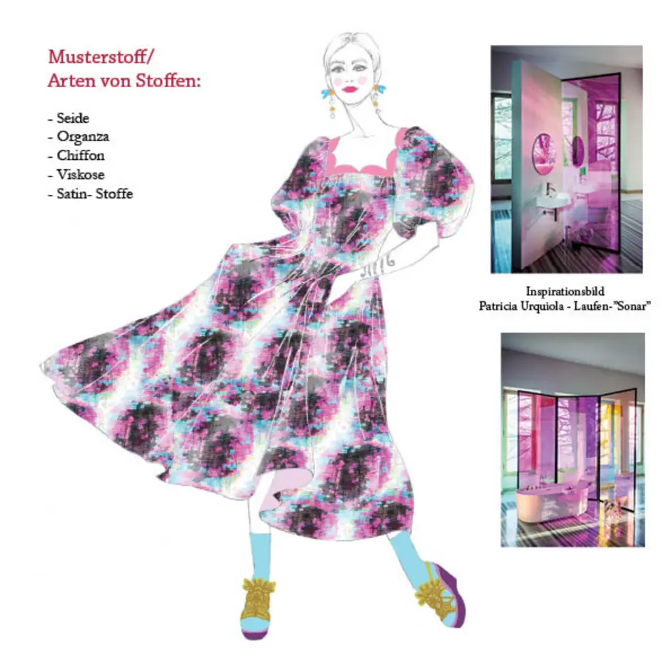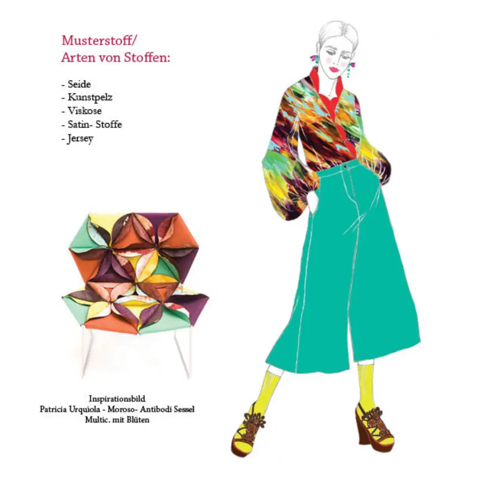 Dabei wollte ich einerseits in der "Gestaltungswelt" der Designerin bleiben, aber auch anderseits ganz eigene Ideen entwickeln und einfließen lassen. Nachdem ich für mich einige Favoriten-Entwürfe der Designerin auserwählt habe, habe ich auf deren Grundlage eigene Stoffe entwickelt. Zunächt habe ich auf Papier mit Acrylfarben das Motiv gemalt, dann wurde dieses digital bearbeitet. Aus der Printidee habe ich dann die passende Kleidungsstücke entworfen.