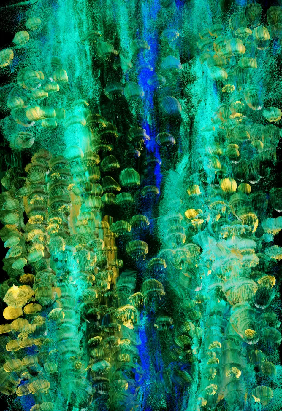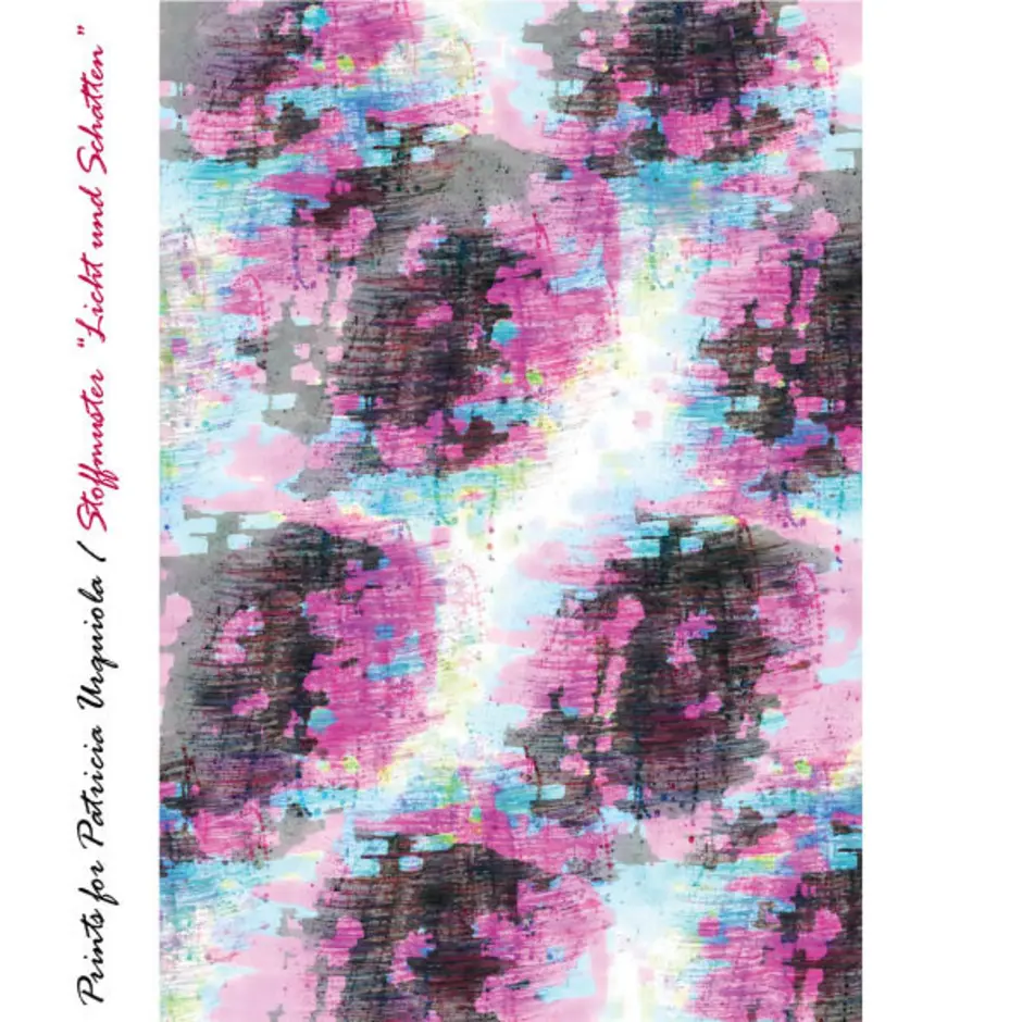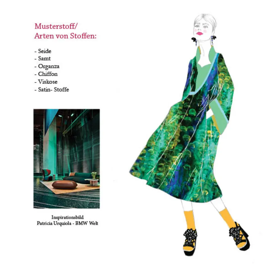 Dabei wollte ich einerseits in der "Gestaltungswelt" der Designerin bleiben, aber auch anderseits ganz eigene Ideen entwickeln und einfließen lassen. Nachdem ich für mich einige Favoriten-Entwürfe der Designerin auserwählt habe, habe ich auf deren Grundlage eigene Stoffe entwickelt. Zunächt habe ich auf Papier mit Acrylfarben das Motiv gemalt, dann wurde dieses digital bearbeitet. Aus der Printidee habe ich dann die passende Kleidungsstücke entworfen.