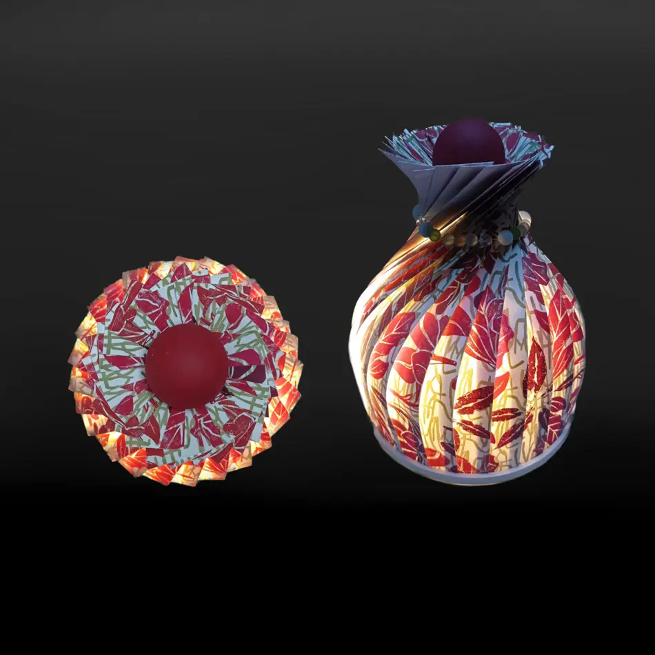Für die Nachttischlampe bedruckte ich Elfenbeinpapier mit einem der Prints und schnitt das Papier anschließend in 4cm breite Streifen, die ich innen an einem runden Holzrahmen (zb. Webrahmen) klebte. Dabei überlappten sich die Papierstreifen, sodass ich diese am oberen Ende, wie ein Fächer, übereinander schieben konnte. Um die Form der Lampe etwas runder zu bekommen und das Gesamtbild abzurunden, klebte ich eine rote Holzkugel auf das Fächerdach.