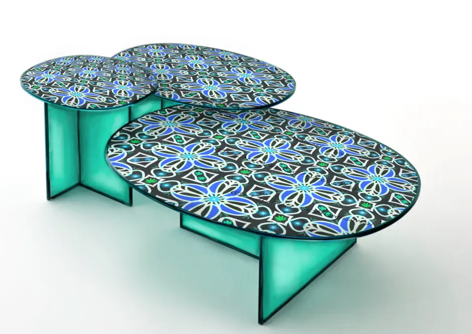 Neben der digitalen Modezeichnungen zur stofflichen Darstellung, entwickelte ich ein digitales Tischdesign, ein Stuhldesign, ein Tapetendesign und ein Design für einen Duschvorhang. Außerdem ließ ich zwei Prints auf Leinwandgewebe drucken und designte eine Nachtischlampe.