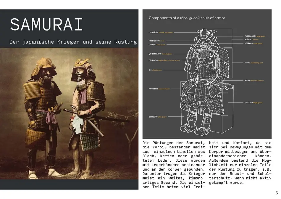Die Rüstungen der Samurai, die Yoroi, bestanden meist aus einzelnen Lamellen aus Blech, Ketten oder gehärtetem Leder. Diese wurden mit Lederbändern aneinander und an den Körper gebunden. Darunter trugen die Krieger meist ein weites, kimonoartiges Gewand. Die einzelnen Teile boten viel Freiheit und Komfort, da sie sich bei Bewegungen mit dem Körper mitbewegen und übereinanderschieben können. Außerdem bestand die Möglichkeit nur einzelne Teile der Rüstung zu tragen, z.B. nur den Brust- und Schulterschutz, wenn nicht aktiv gekämpft wurde.