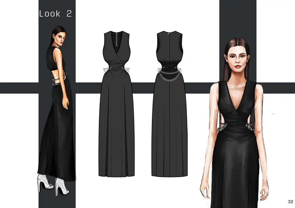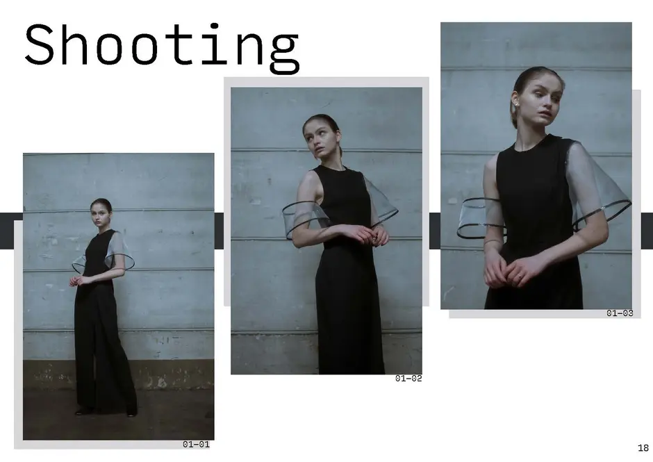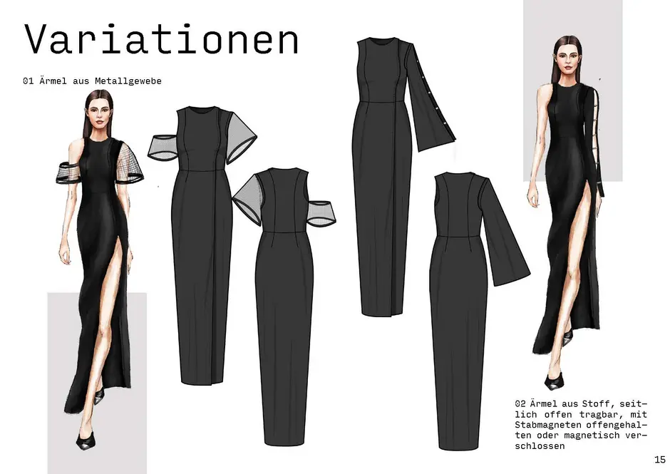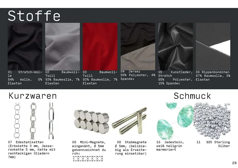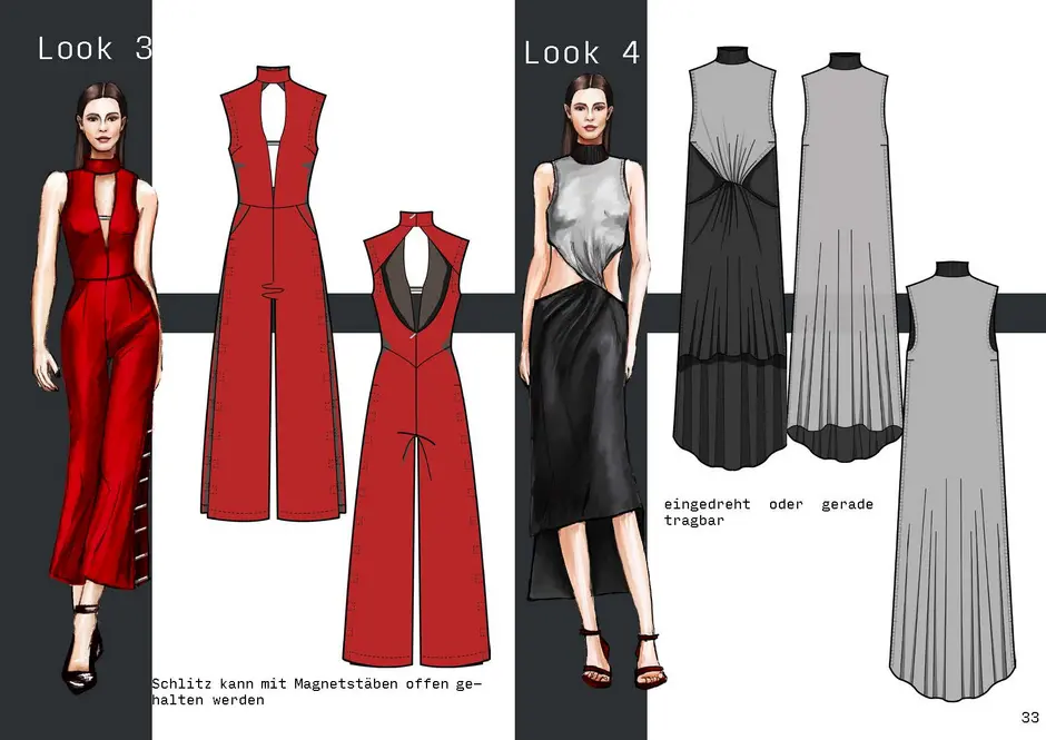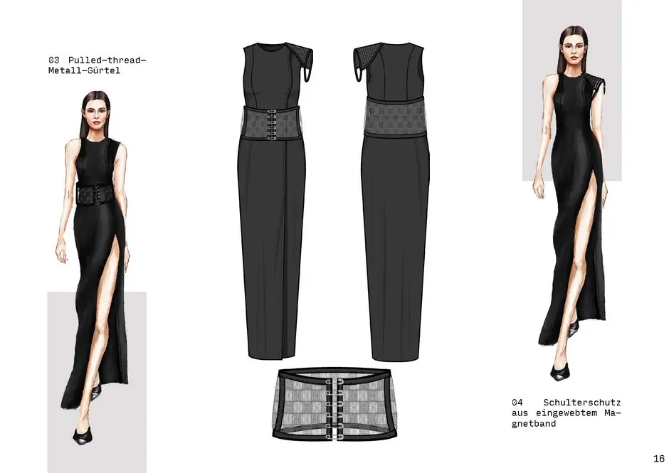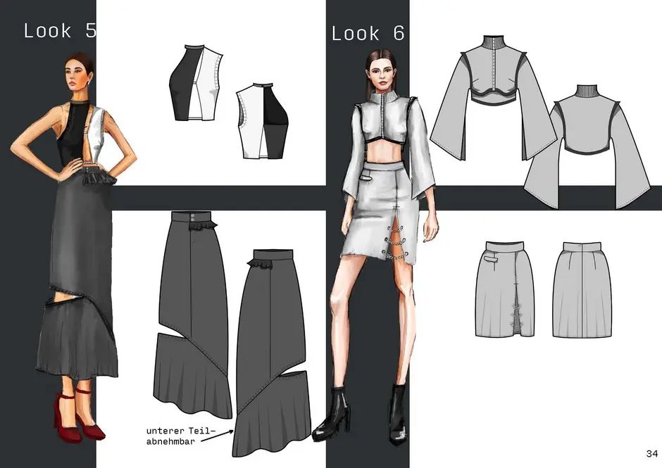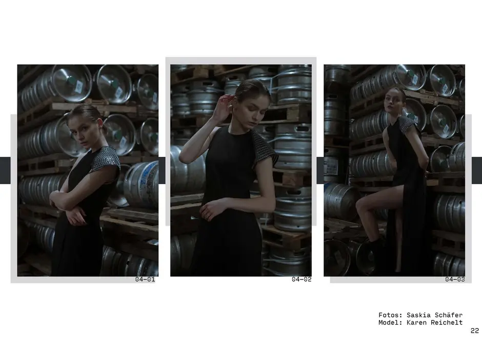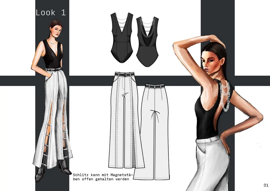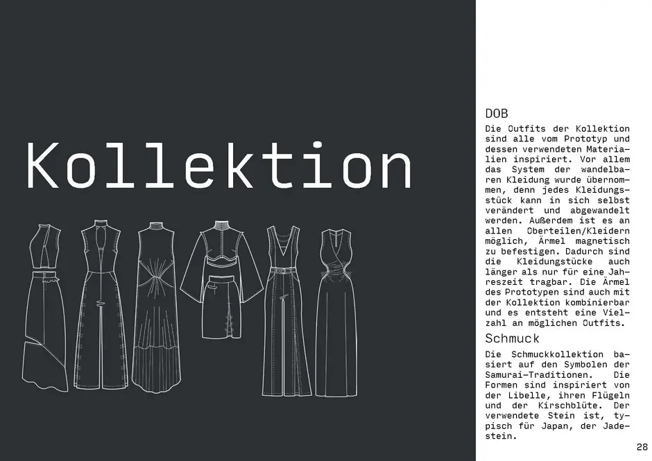 Prototyp: Das Design ist einerseits in Hinsicht der gewählten Materialien stark inspiriert von den Rüstungen der Samurai, da ich versucht habe das Metall auf eine neue Art und Weise in Bekleidung zu integrieren. Das Metall dient nun nur noch der Ästhetik und nicht mehr wie in der Rüstung, dem Schutz. Außerdem habe ich versucht die Idee der vielen einzelnen Teile aufzugreifen, so wie man sie auch bei den Samurai finden kann. Bei dem entwickelten Prototypen können diverse Teile ausgetauscht und weggelassen werden. So kann ein einfaches Kleidungsstück auf mehrere verschiedene Arten getragen werden und neue Looks erzeugt werden.