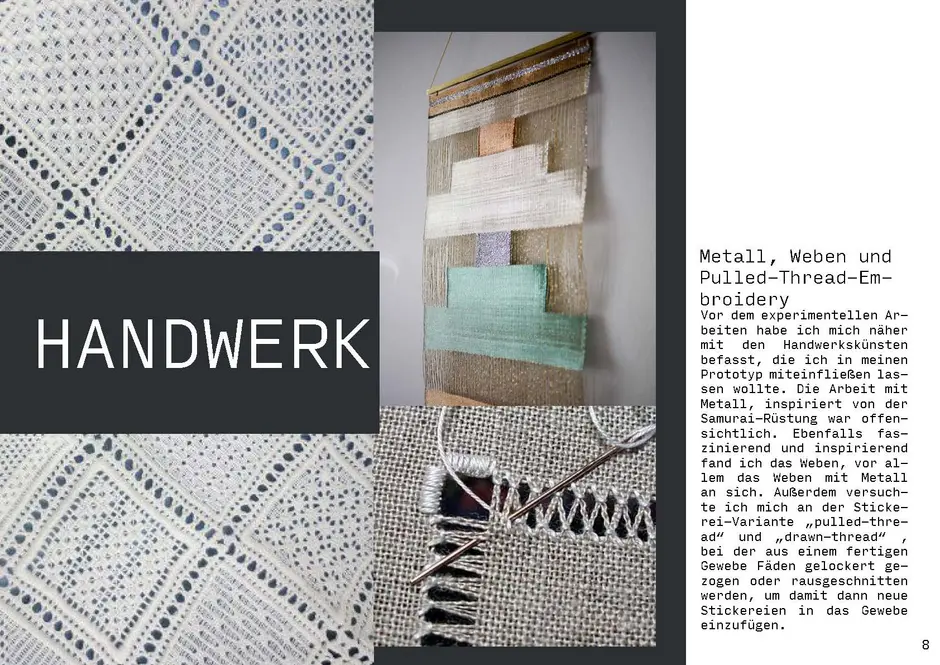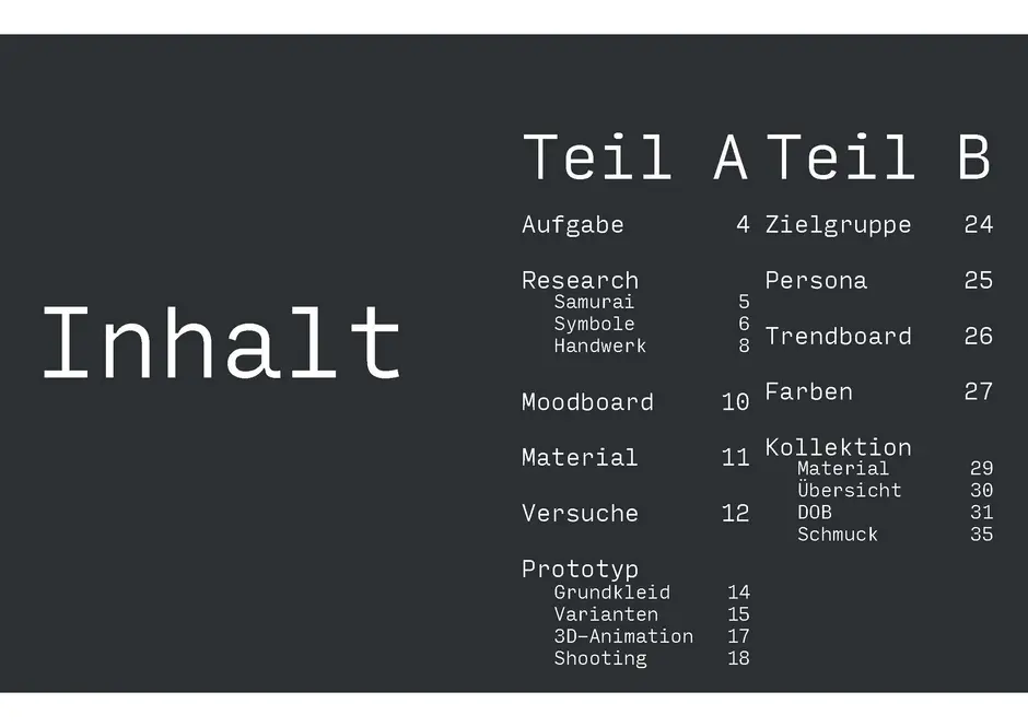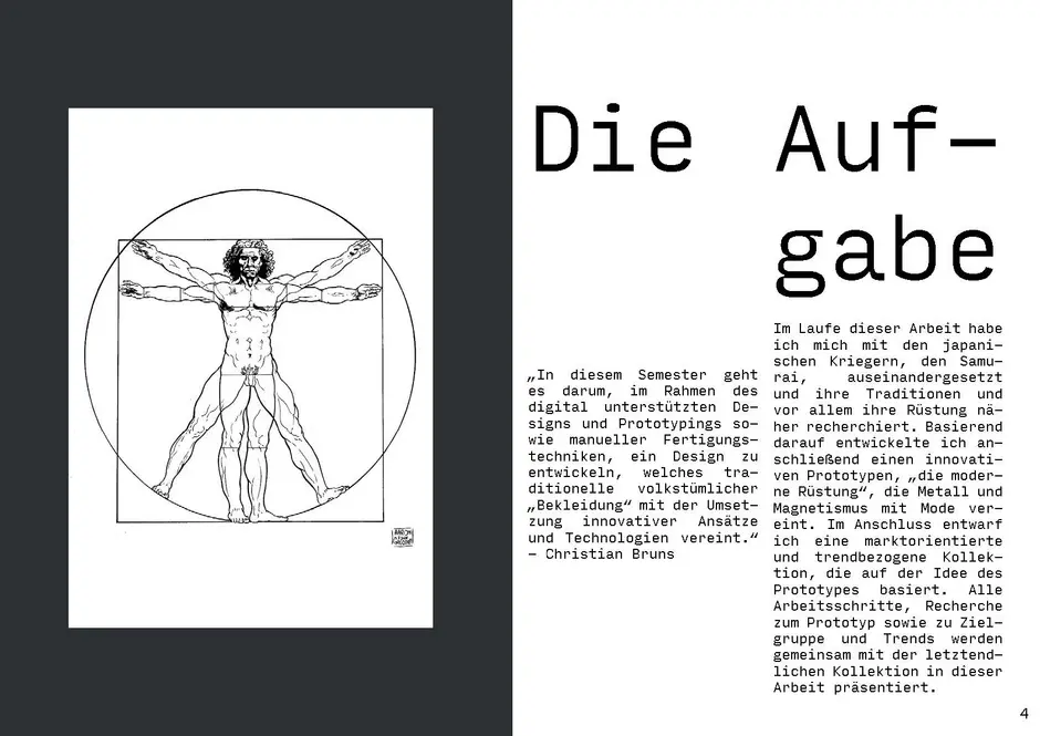 Im Laufe dieser Arbeit habe ich mich mit den japanischen Kriegern, den Samurai auseinandergesetzt und ihre Traditionen und vor allem ihre Rüstung näher recherchiert. Basierend darauf entwickelte ich anschließend einen innovativen Prototypen, „die moderne Rüstung“, die Metall und Magnetismus mit Mode vereint. Im Anschluss entwarf ich eine marktorientierte und trendbezogene Kollektion, die auf der Idee des Prototypens basiert. Alle Arbeitsschritte, Recherche zum Prototyp sowie zu Zielgruppe und Trends werden gemeinsam mit der letztendlichen Kollektion in dieser Arbeit präsentiert.