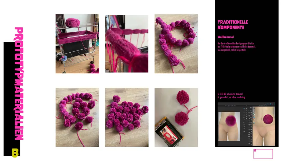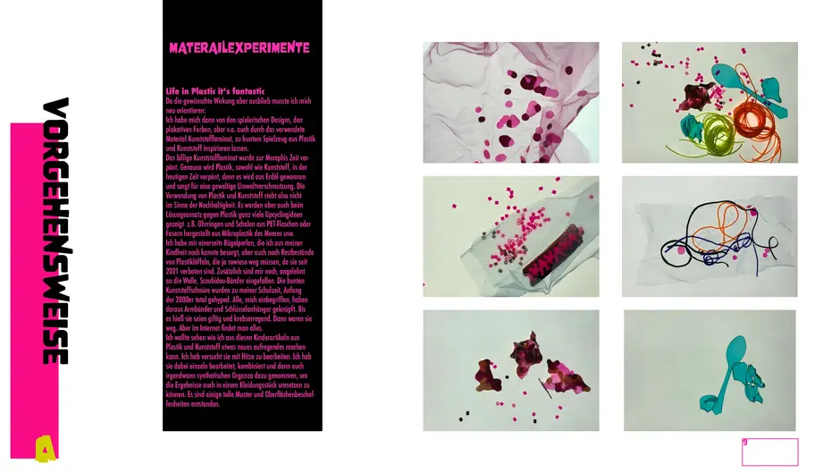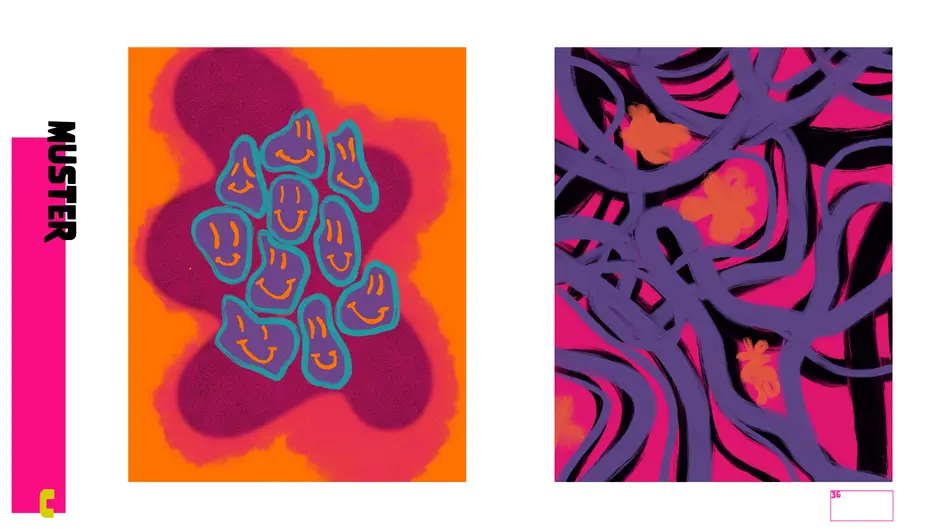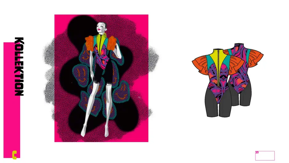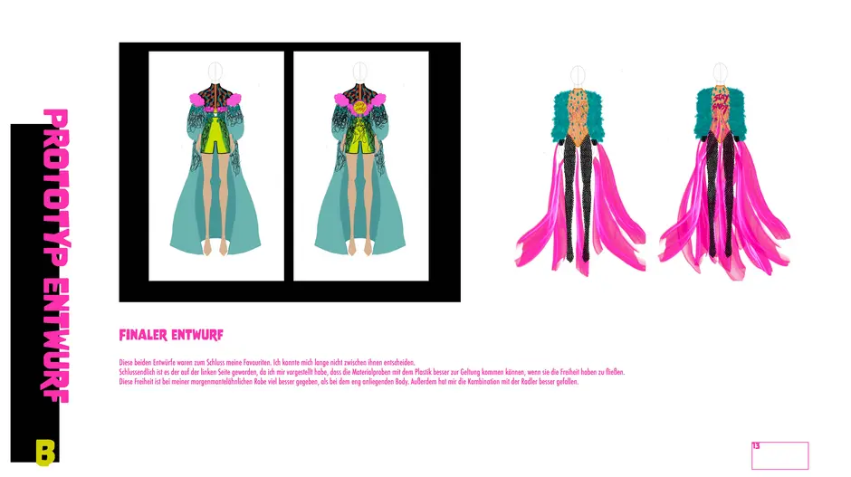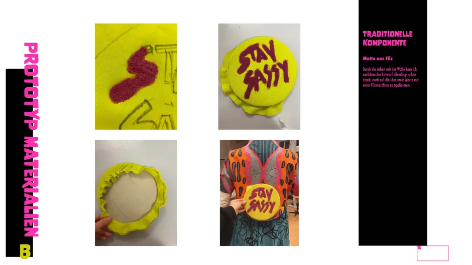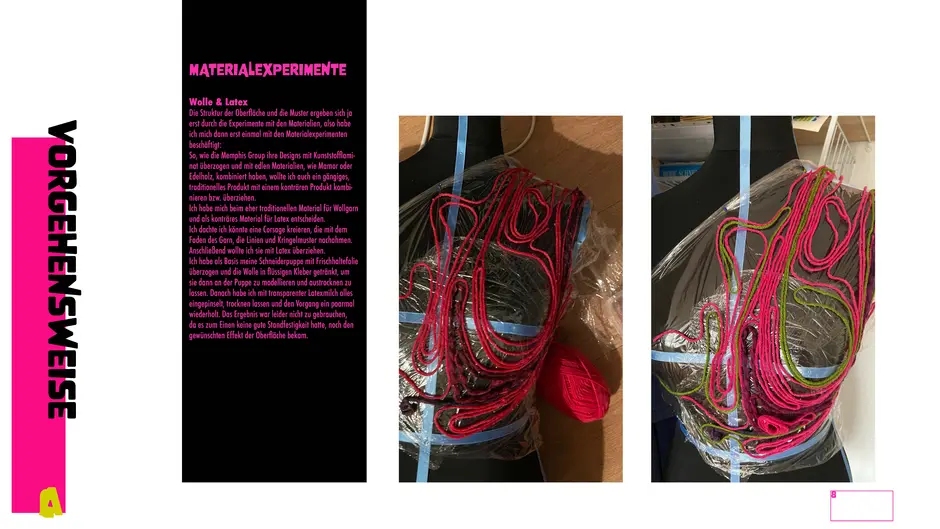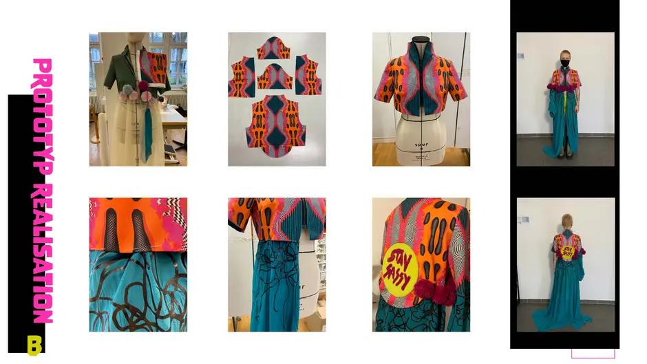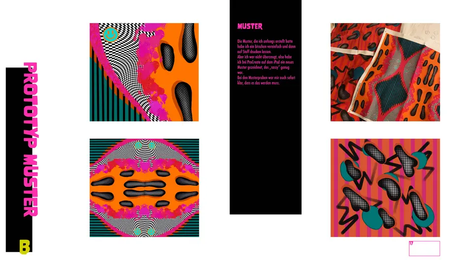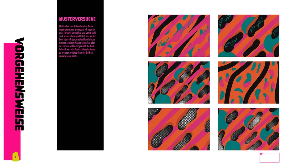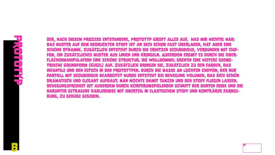Genau dieses Gefühl wollte ich aufgreifen. Ich finde es toll mich von dem Gedanken lösen zu können, dass ich etwas machen muss, dass von der Gesellschaft im allgemeinen als „schön“ angesehen wird, ob das, was ich kreiere meinem Umfeld gefällt. Ich wollte etwas machen, was mir Freude bereitet und die Designs von Memphis treffen genau meinen Geschmack: die knalligen Farben, der verrücktenMustermix, die Proportionen, die aus grundlegenden Formen entstehen und den Mix von sehr verschiedenen Materialien und wie alles zusammen überladen, aber trotzdem harmonisch und dynamisch wirkt. Ich wollte genau diese Stimmung und Emotion, die Memphis in mir auslöst auf meinen Prototypen übertragen. Er sollte einfach Spaß machenund am liebsten auch „over the top“ sein. Er soll mit knalligen Farben und Mustern auffallen und gesehen werden, bunt gemixt, voluminös und massig, aber auch auch irgendwie spielerisch leicht und fließend in Bewegung sein. Im Grunde einfach frech. Frech im Sinne von sich nicht einschränkten lassen, ausbrechen und sich nicht um die Meinung anderer zu kümmern. Einfach, auf liebenswerte Weise, sein Ding durchziehen und das Leben auf seine Art genießen.