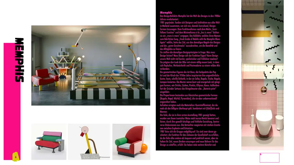 Die Memphis Group hat sich von nichts und niemandem einschränken lassen. Sie sind komplett aus den damaligen Regeln, des Designprinzis des Funktionalismus, ausgebrochen. Sie haben das, was Design in unserer Welt zu etwas Essentiellem macht wieder hervorgeholt, nämlich den Spaß daran und an Produkten, zu denen man Emotionen aufbauen kann. Karl Lagerfeld hat sich sein Apartment in Monaco bestimmt nicht mit Möbeln von Memphis eingerichtet, weil sie bequem und praktisch sind, sondern wahrscheinlich eher, weil er von den bunten Farben, den Muster und den verrückten Proportionen emotional bewegt wurde und schlicht und einfach Freude daran hatte.