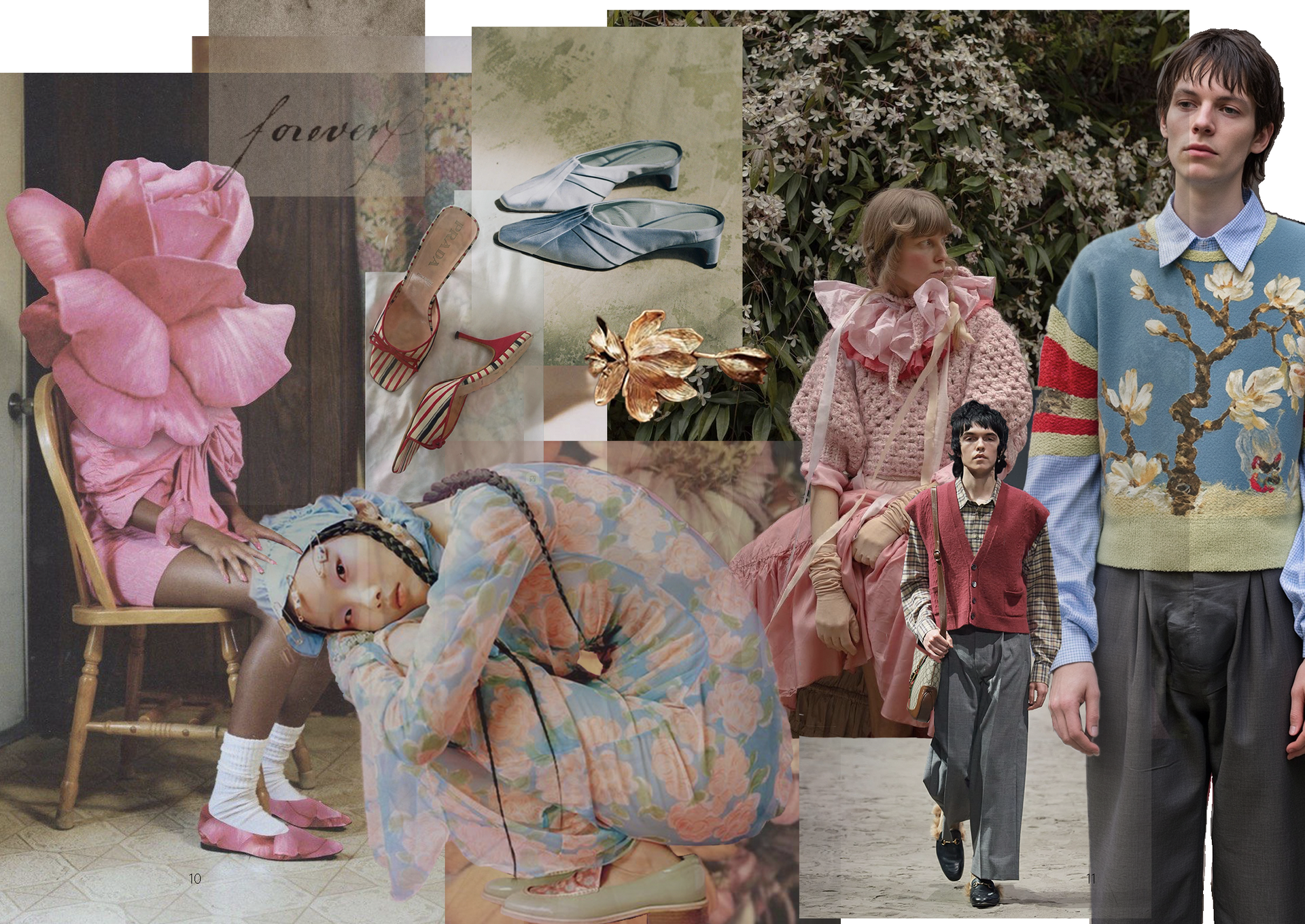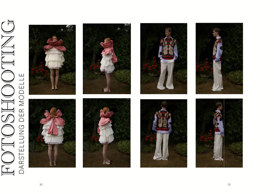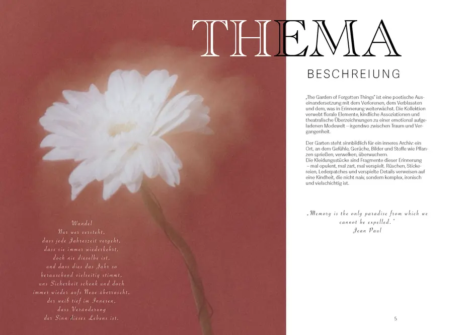 Der Garten steht sinnbildlich für ein inneres Archiv: ein Ort, an dem Gefühle, Gerüche, Bilder und Stoffe wie Pflanzen sprießen, verwelken, überwuchern. Die Kleidungsstücke sind Fragmente dieser Erinnerung – mal opulent, mal zart, mal verspielt. Rüschen, Stickereien, Lederpatches und verspielte Details verweisen auf eine Kindheit, die nicht naiv, sondern komplex, ironisch und vielschichtig ist.