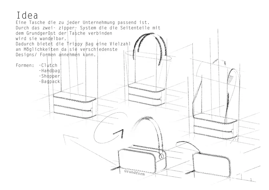 Eine Tasche die zu jeder Unternehmung passend ist. Durch das zwei- zipper- System die die Seitenteile mit dem Grundgerüst der Tasche verbinden wird sie wandelbar. Dadurch bietet die Trippy Bag eine Vielzahl an Möglichkeiten da sie verschiedenste Designs/ Formen annehmen kann.
