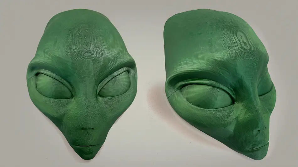 Halbmaske im Alienlook für FotoshootingsVerfahren: FDMMaterial: PLA, grünDruckzeit: 12 Stunden