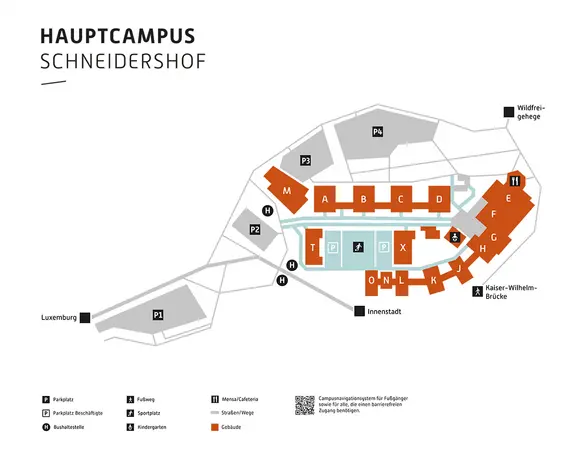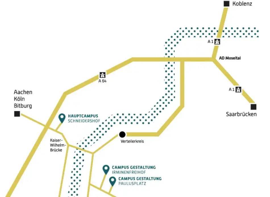 Mit dem Bus fahren Sie bis zur Haltestelle Hochschule Trier, Schneidershof (Hauptcampus). Während der Vorlesungszeit fährt zusätzlich die Linie 14 direkt bis zum Hauptcampus.