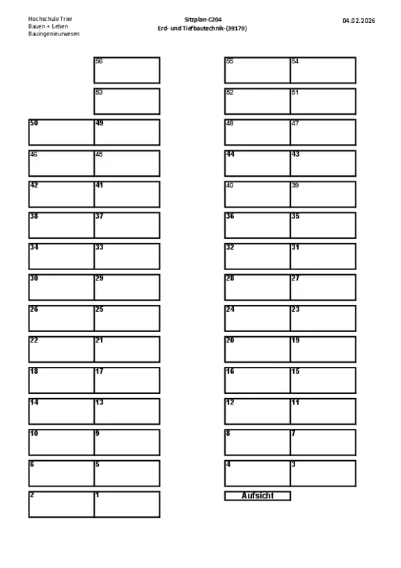 Die Platzvergabe erfolgt auch dieses Semester im Voraus und wird spätestens zwei Tage vor der Klausur auf dieser Seite veröffentlicht. Bitte informieren Sie sich bereits im Vorfeld über Ihren Sitzplatz.