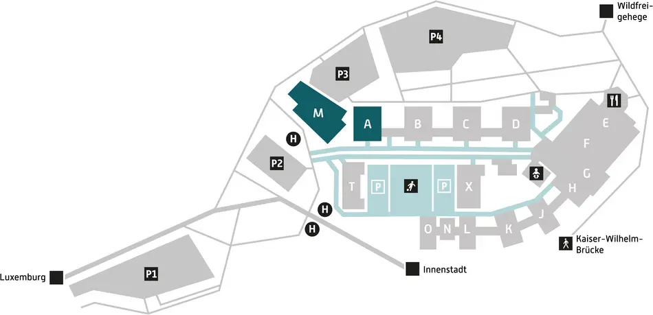 Gebäude A: Vorlesungsräume, Büroräume Professor*innen und Mitarbeiter*innen der Verwaltung, Fachschaft