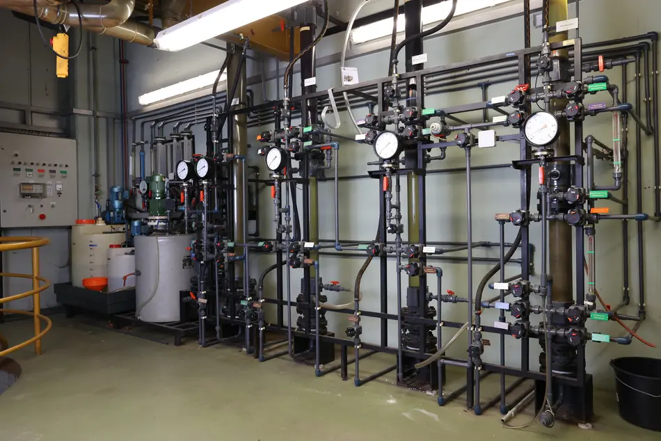 Im Labor lernen die Studierenden die Funktionsweise dieser Wasseraufbereitungsanlage und ihrer Komponenten kennen. Sie führen eine Regeneration der Ionenaustauscher durch.