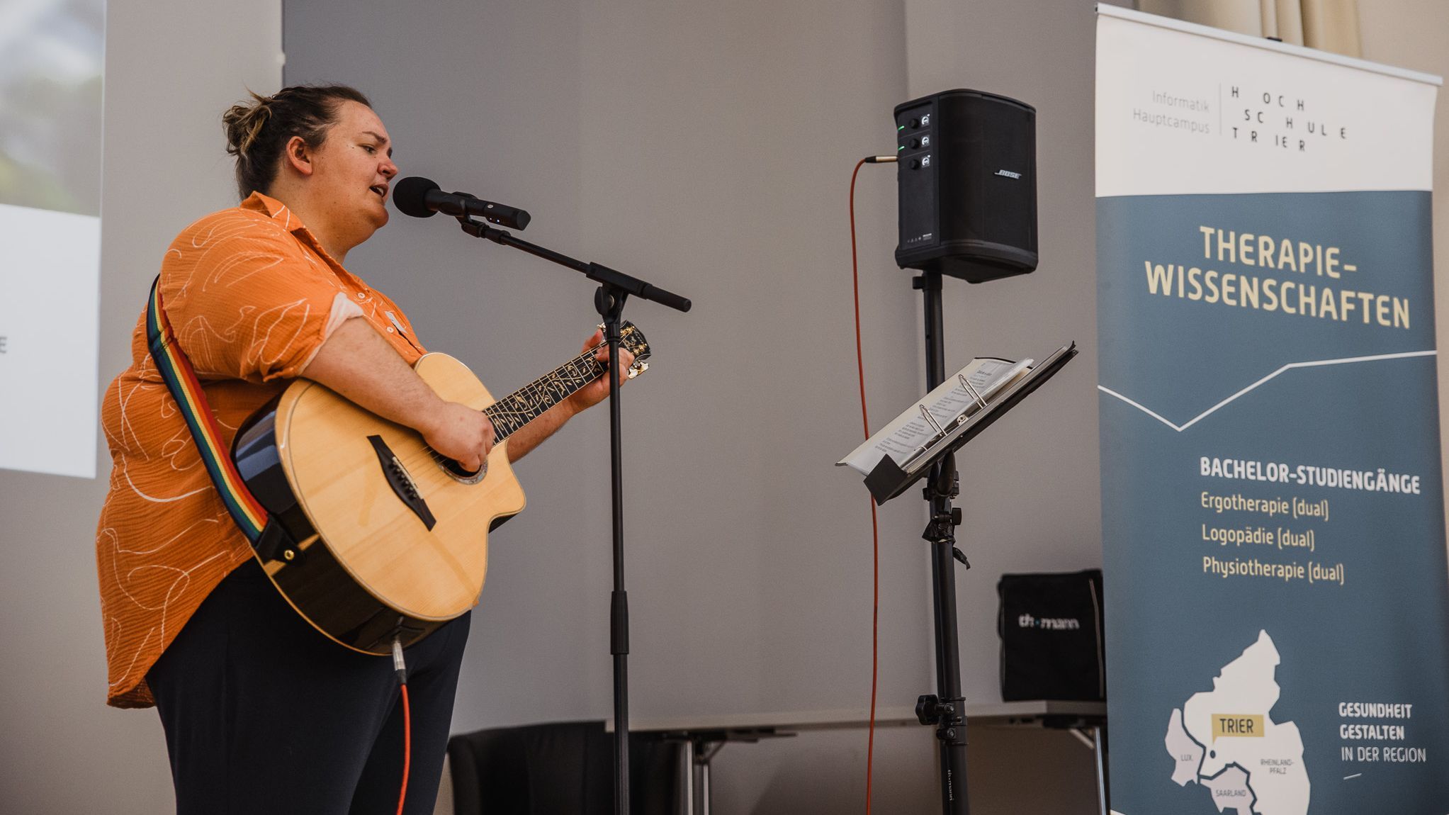 Den Ausklang der Veranstaltung bildete ein geselliges Beisammensein mit Wegbereiterinnen und Wegbereitern, Kooperationspartnern, Studierenden und Alumni, das von musikalischen Beiträgen der Ergotherapie-Studierenden Tamara Köcher umrahmt wurde. Mit ihren Liedern setzt sie sich eindrucksvoll für die Inklusion von Menschen mit unterschiedlichen Benachteiligungen ein. Ein stimmiger Ausklang, ganz im Sinne dieses Jubiläums.