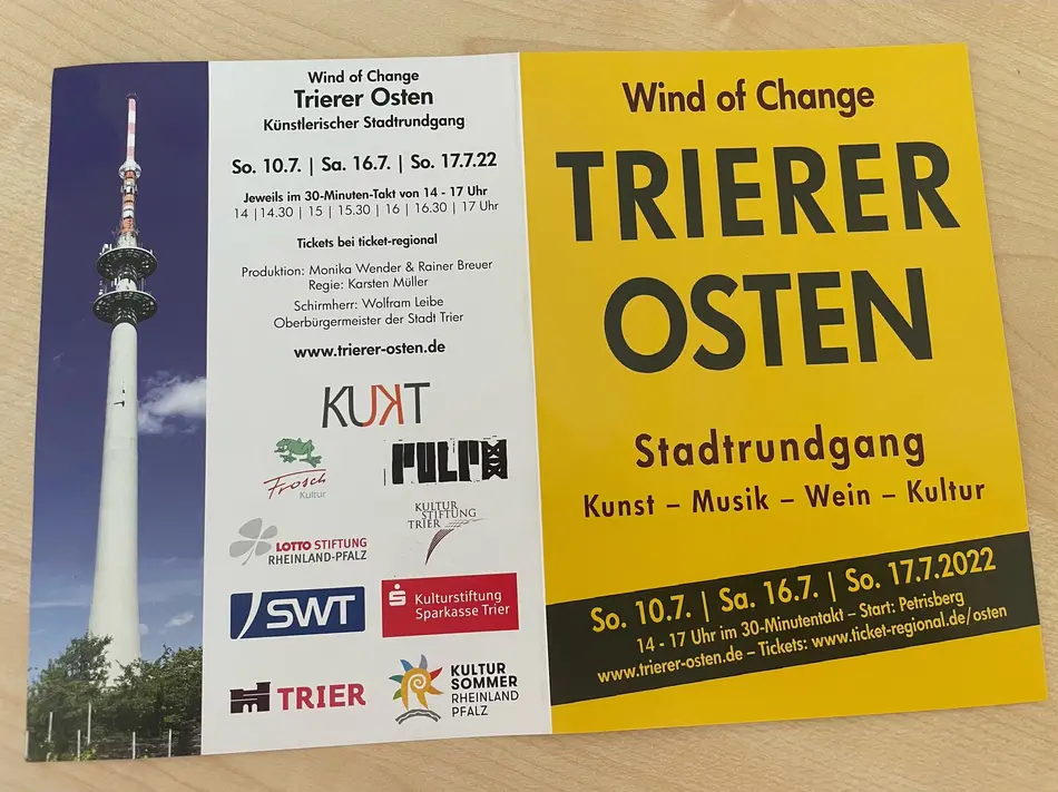 Der Kunst- und Kulturverein Trier e.V. präsentiert in Kooperation mit Frosch Kultur e.V. und PulpXIX e.V. einen theatralen Stadtrundgang. Wohlbekannte Orte mit unerwarteten künstlerischen Darbietungen stehen genauso im Mittelpunkt wie eher unbekannte Örtlichkeiten in einem großen Trierer Stadtgebiet: Eine Entdeckungsreise durch Zeit und Kultur im Trierer Osten, zwischen Historie/Tradition und Moderne.