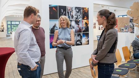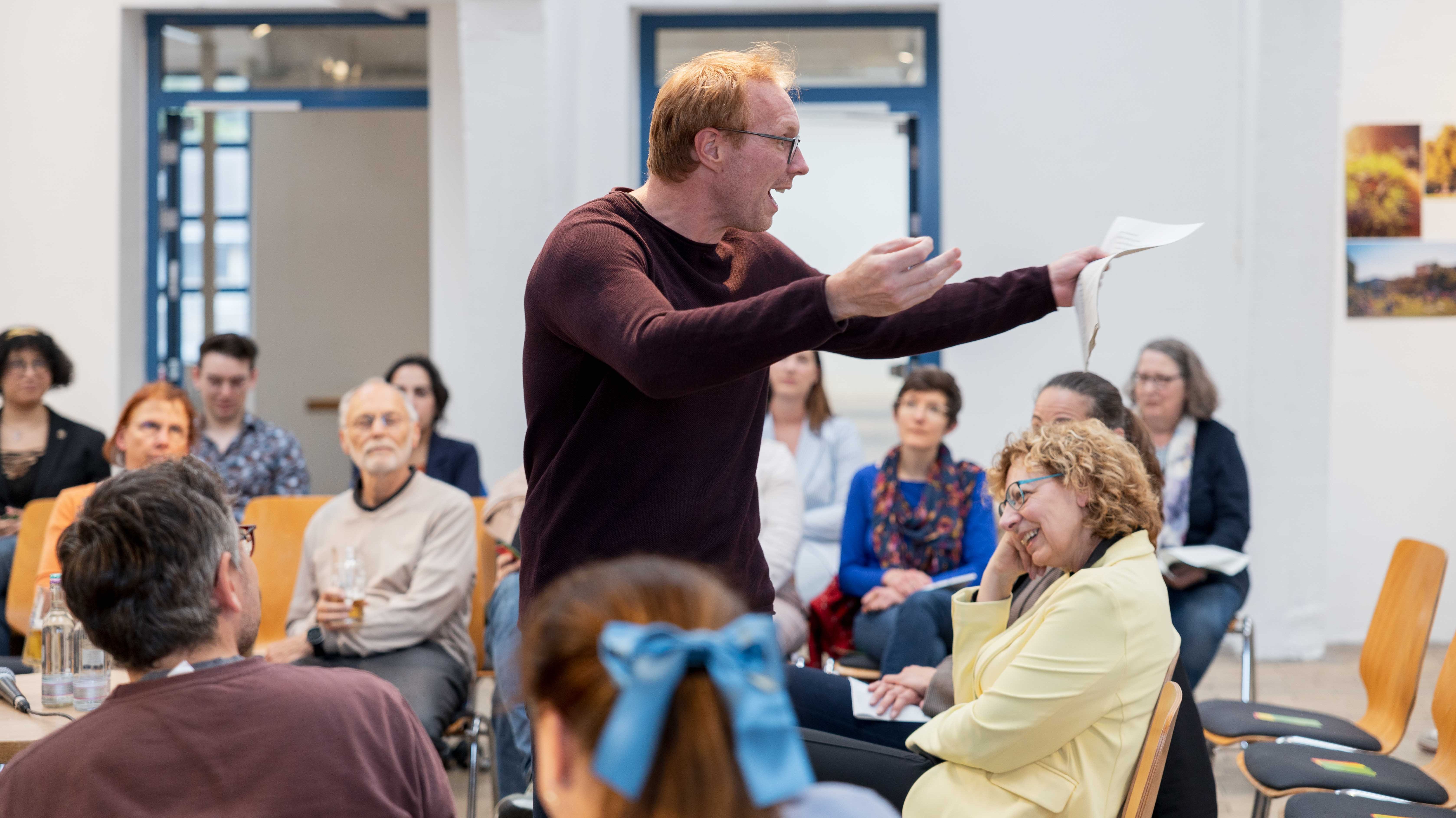 Passend zum künstlerischen Profil der Veranstaltungs-Location läutete eine kritische schauspielerische Darbietung von Alexander Ourth den Abend ein. In überspitzter Manier wurden Erwartungshaltungen von Unternehmen an Arbeitnehmende, aber auch gesellschaftliche und soziale Risiken der modernen Arbeitswelt pointiert herausgestellt.