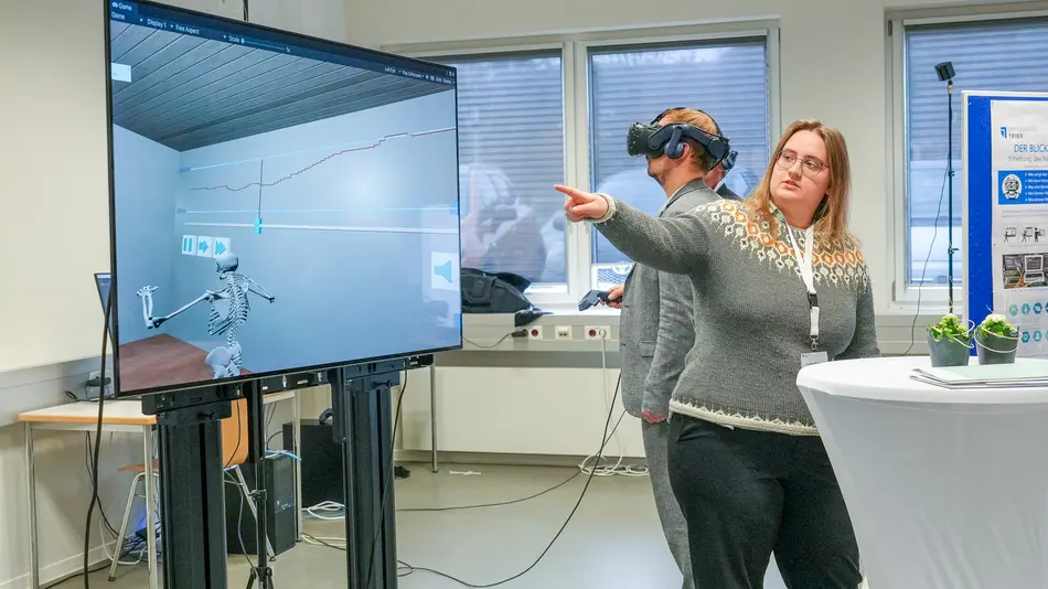 Ein Highlight der Veranstaltung waren die im Rahmen des Kollegs entwickelten, interaktiven Demonstratoren, die von den Doktorandinnen und Doktoranden präsentiert wurden. Gäste hatten die Möglichkeit, die Ergebnisse des Forschungskollegs selbst zu erleben. Von immersiven Bewegungsübungen für Rückenschmerzen über spielerische VR-Trainings für Herzpatienten bis hin zu virtuellen Kooperationsumgebungen: Die Anwendungen zeigten anschaulich, wie XR-Technologien zukünftig in Therapien eingesetzt werden können.