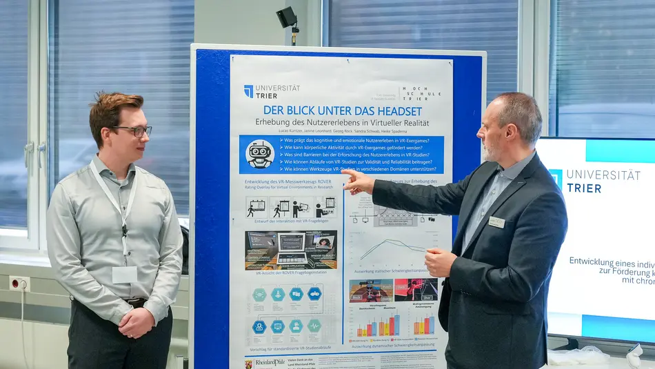 In seiner Eröffnungsrede erläuterte der wissenschaftliche Sprecher des Kollegs und Studiengangsleiter der Medizinformatik der Hochschule Trier, Prof. Dr. Jörg Lohscheller, die Ziele und die interdisziplinäre Struktur von XR-PATH. Das Kolleg widmet sich drei eng verknüpften Forschungsbereichen: Der Entwicklung XR-basierter Therapieansätze für die Behandlung von Rückenschmerzen, dem VR-gestütztem Training für Patienten mit Herzinsuffizienz sowie der Integration sozialer Interaktionen in virtuelle Umgebungen.