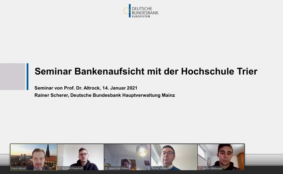 In einem zweiten Baustein referierten im Dezember 2020 Herr Rainer Scherer, Regionalbereichsleiter Banken und Finanzaufsicht, und Herr Achim Altschäffl, Leiter des Referats Laufende Aufsicht, von der Hauptverwaltung der Deutschen Bundesbank in Rheinland-Pfalz und dem Saarland zum Thema ‚Eckpunkte der regulatorischen Eigenmittelanforderungen‘. Nicht zuletzt aufgrund der langjährigen Erfahrung der Referenten gelang es diesen, die Hinter- und Beweggründe der sich entwickelnden Regulierung den Studierenden plausibel zu machen. Außerdem informierten sie über praktische Aspekte der Aufsicht über die Banken in Deutschland und in der Region.