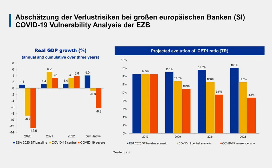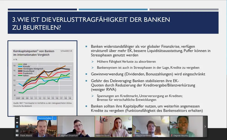 In einem dritten Baustein erforschten die Studierenden auf Basis von aktuellen Analysen der Aufsicht und von Studien der Forschungs-institute den möglichen Einfluss der COVID-19-Krise auf das europäische Bankensystem (Phasen der Pandemie, Einfluss auf den Unternehmenssektor, betroffene Geschäfts-felder der Banken, besonders betroffene Bankensektoren, Verlusttragfähigkeit, regula-torische Maßnahmen, geld- und fiskal-politische Maßnahmen).