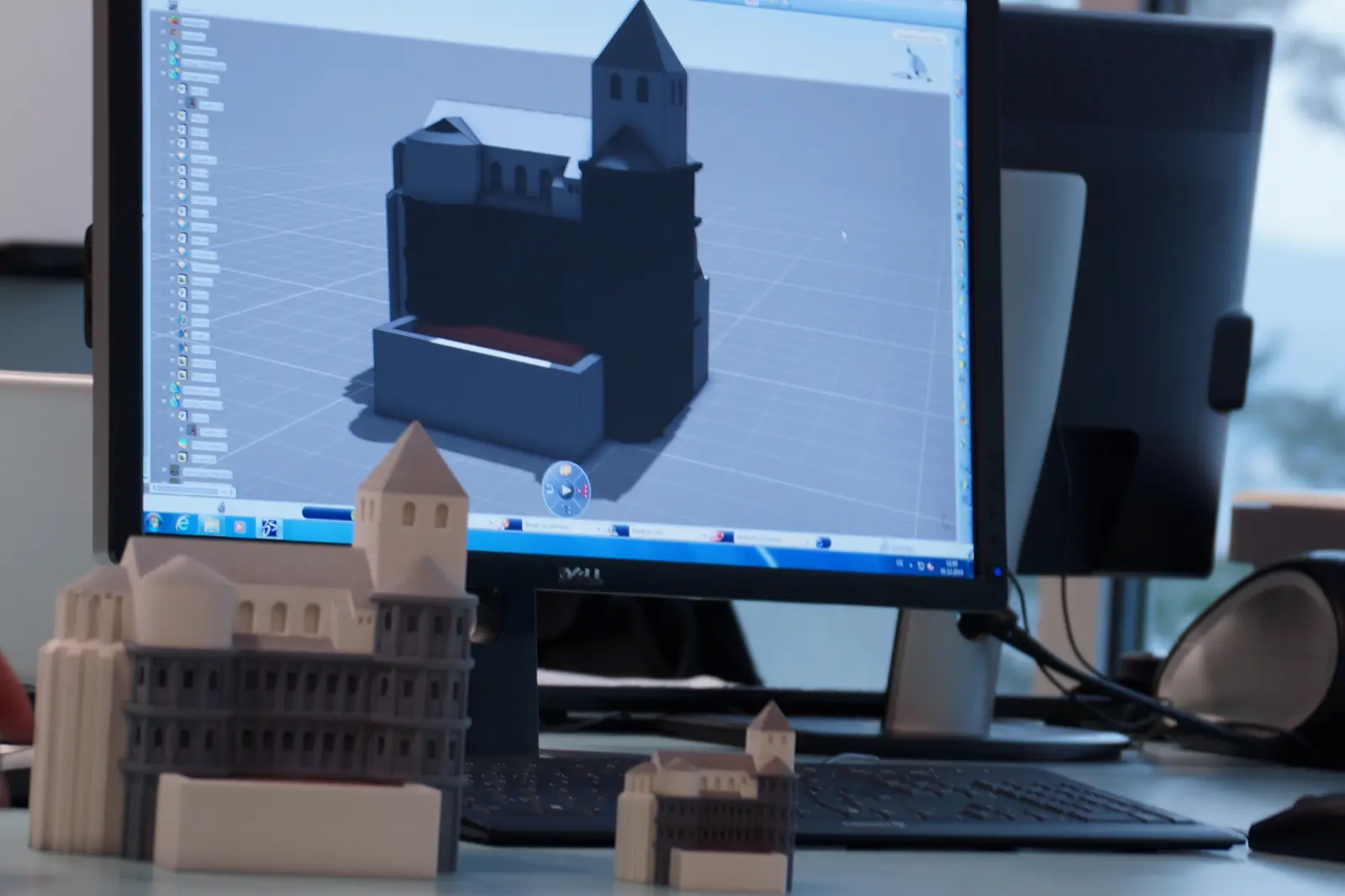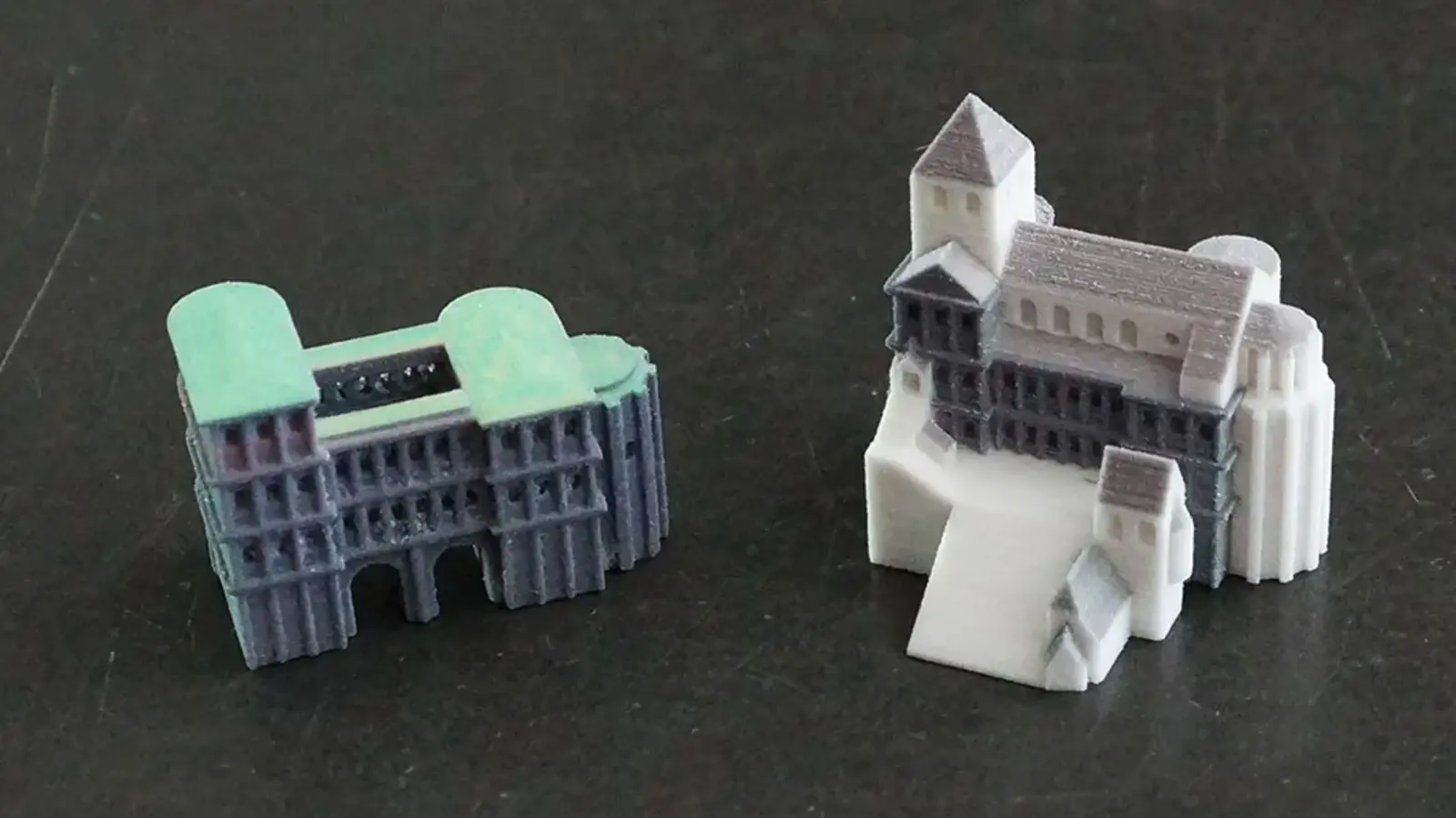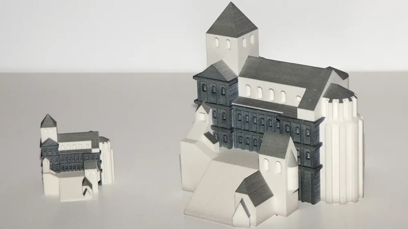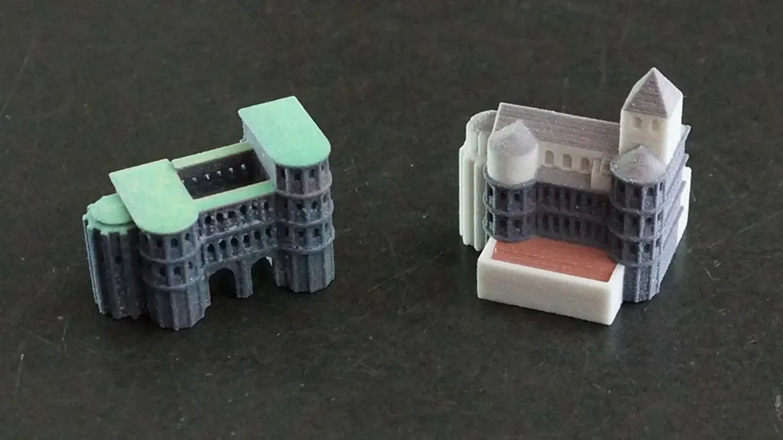 Das für den 3D-Druck optimierte Modell des Stadttors wurde sowohl in einer großen Ausfertigung (Höhe von ca. 21 cm) und in einer kleinen Version (Höhe von ca. 5 cm) mit Hilfe des Pulverdrucks (3DP-Verfahren) realisiert.