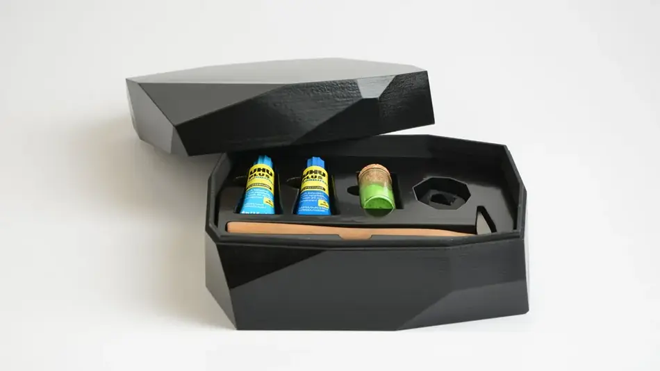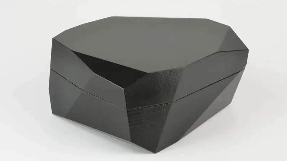 Diese Arbeit der Studentin Katrin Münsch wurde mit dem Pulververfahren gedruckt und anschließend in Eigenarbeit schwarz lackiert. Die Box ist größer als es auf den Bildern zunächst erscheint und hat mit einer Grundfläche von 220 x 190 mm nahezu den kompletten Bauraum ausgefüllt.