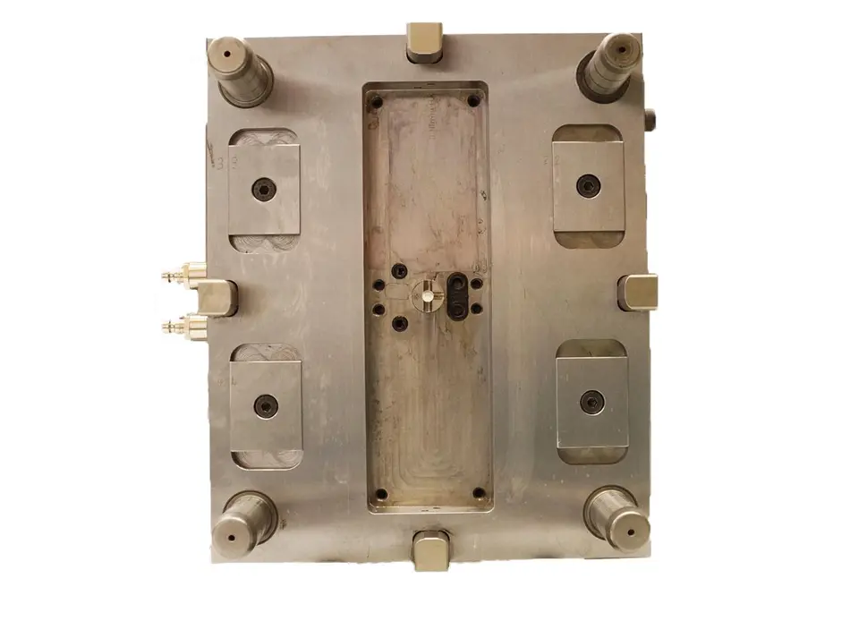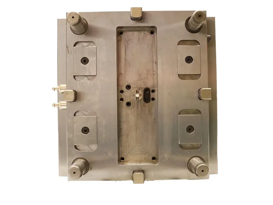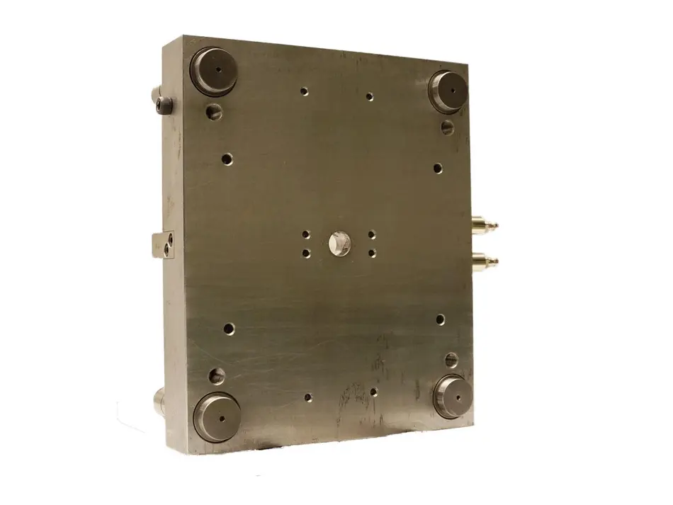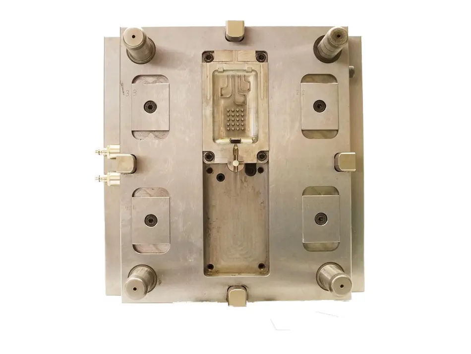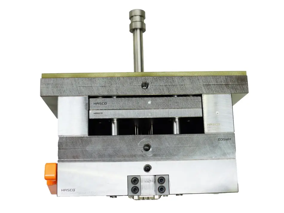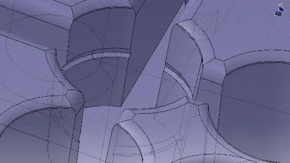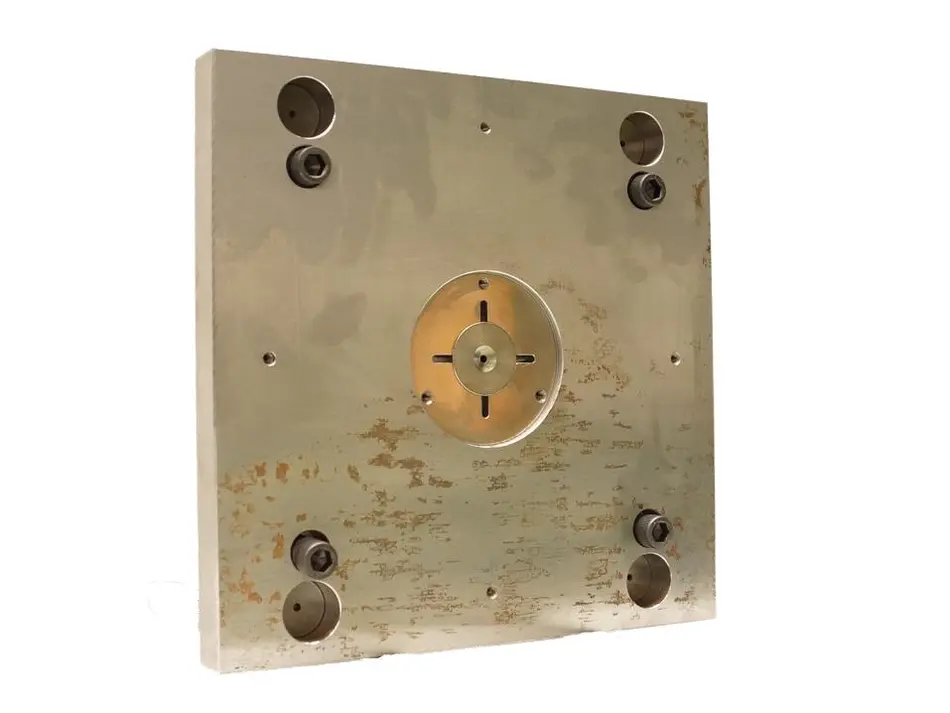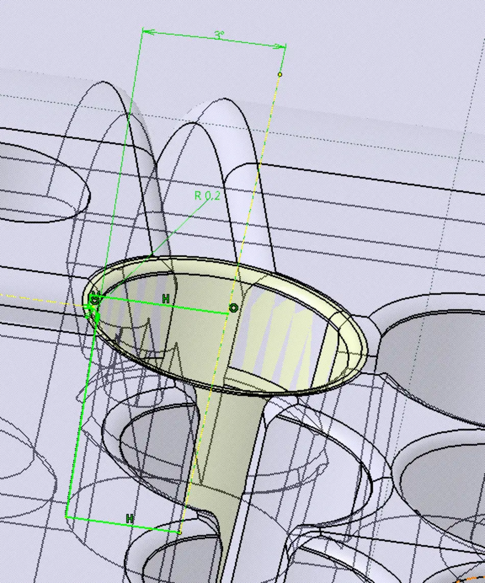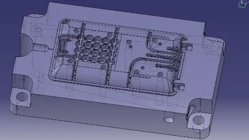 Anfangs stelle sich das Problem dar, dass das Material auf den 20 Kegelstümpfen der Angussseite aufschrumpfte und stecken blieb. Daraufhin versuchten wir mit einem Luftschleifer kleine Nuten (Bump-Off) an der Gegenseite vom Gehäuse anzubringen, um die Abhebekraft zu vergrößern. Dies stellte sich als sehr erfolgreiche Methode heraus. Um diesen Effekt zu verstärken brachten wir an der Auswerferseite und an den vier Eckbohrungen Hinterschneidungen an. Dies bewirkt, dass die Abhebekraft besonders in dem Bereich der Hinterschneidungen vergrößert wird. Leider wurde hierdurch jedoch beim Ausstoßen ein sauberes lösen der Gehäusehälfte aus der Form behindert.