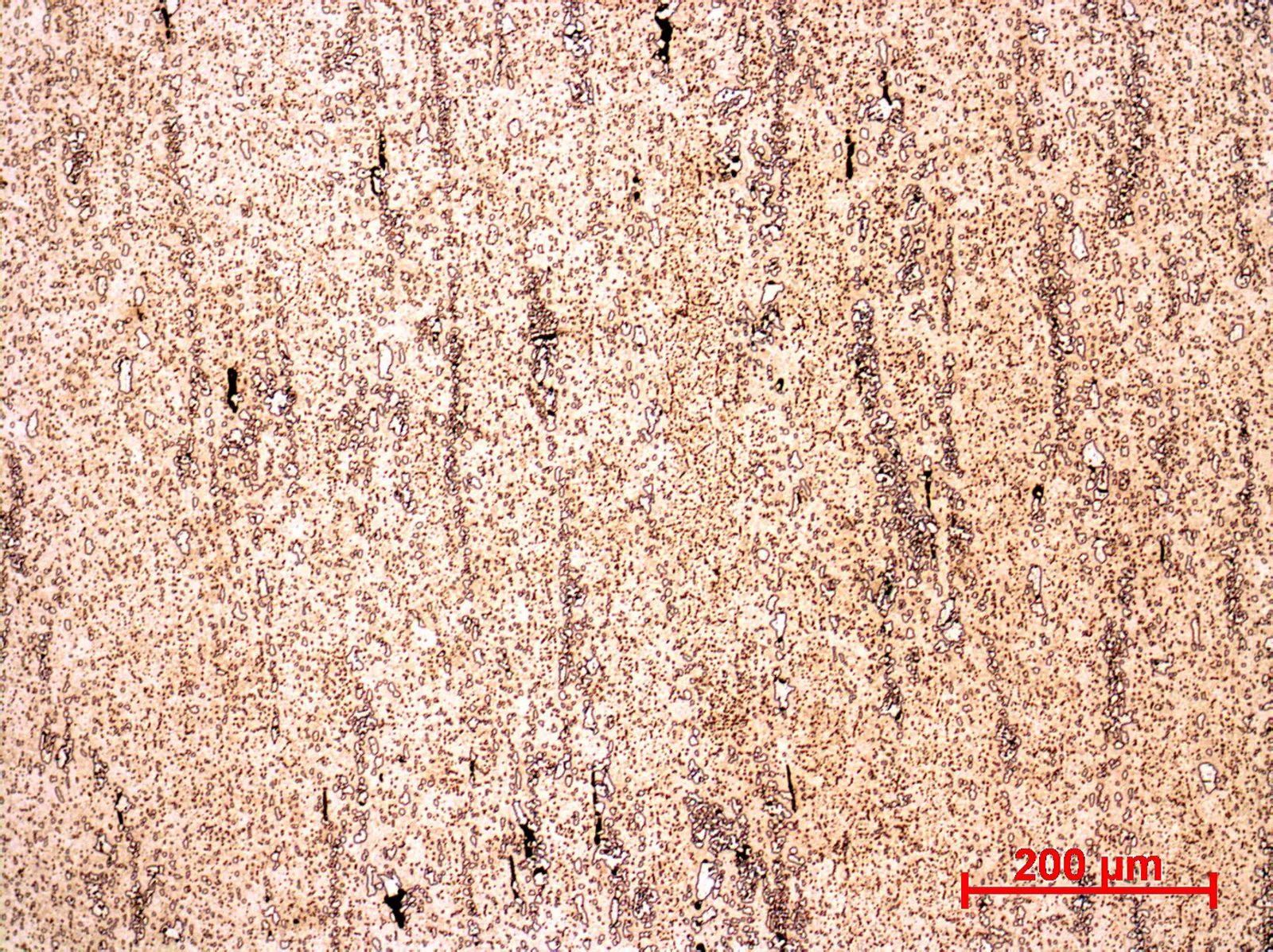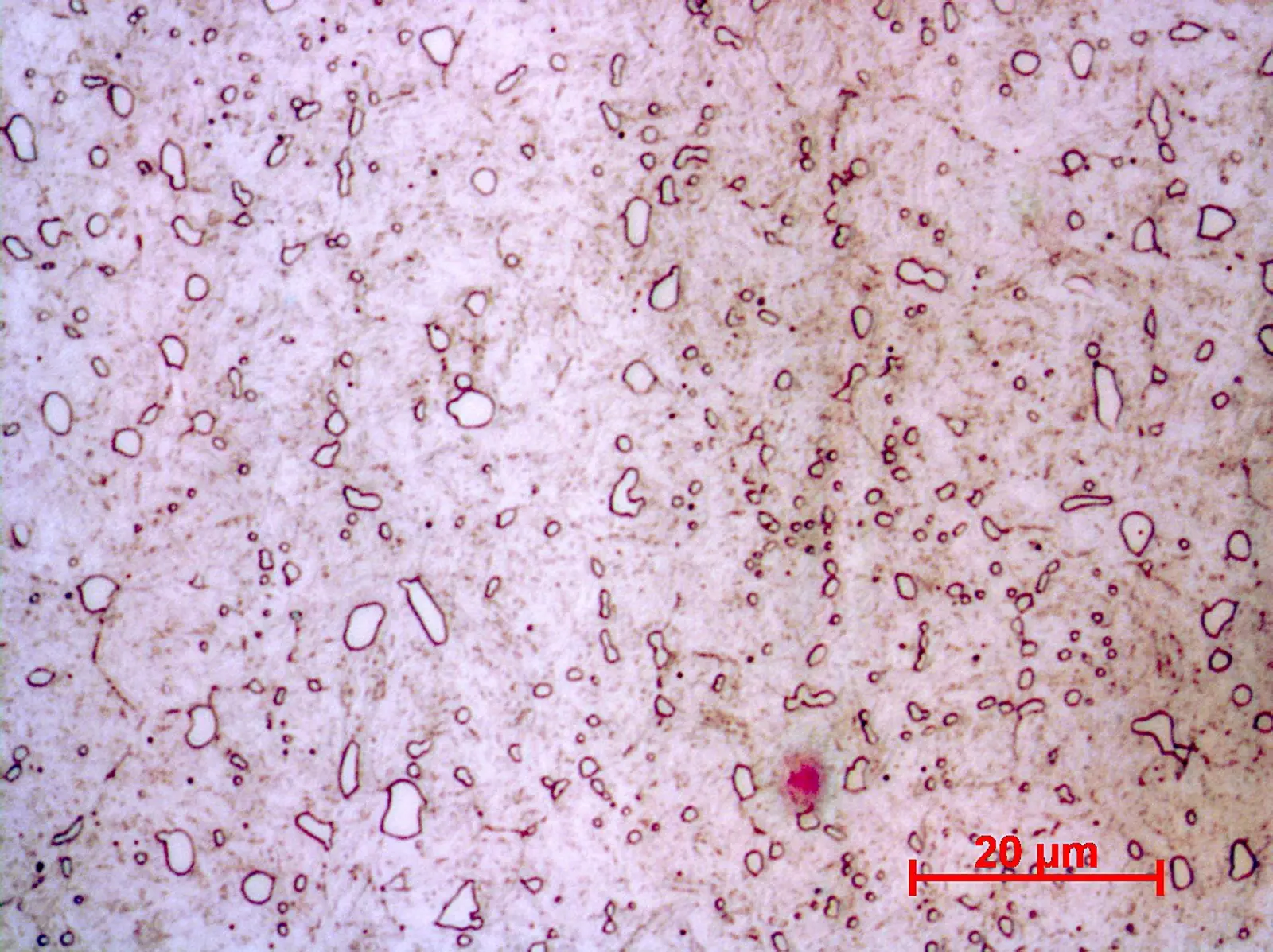 Im martensitischen Gefüge sind Ausscheidungen der primären Chromkarbide erkennbar.