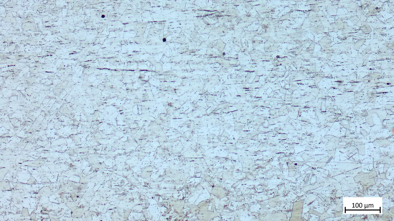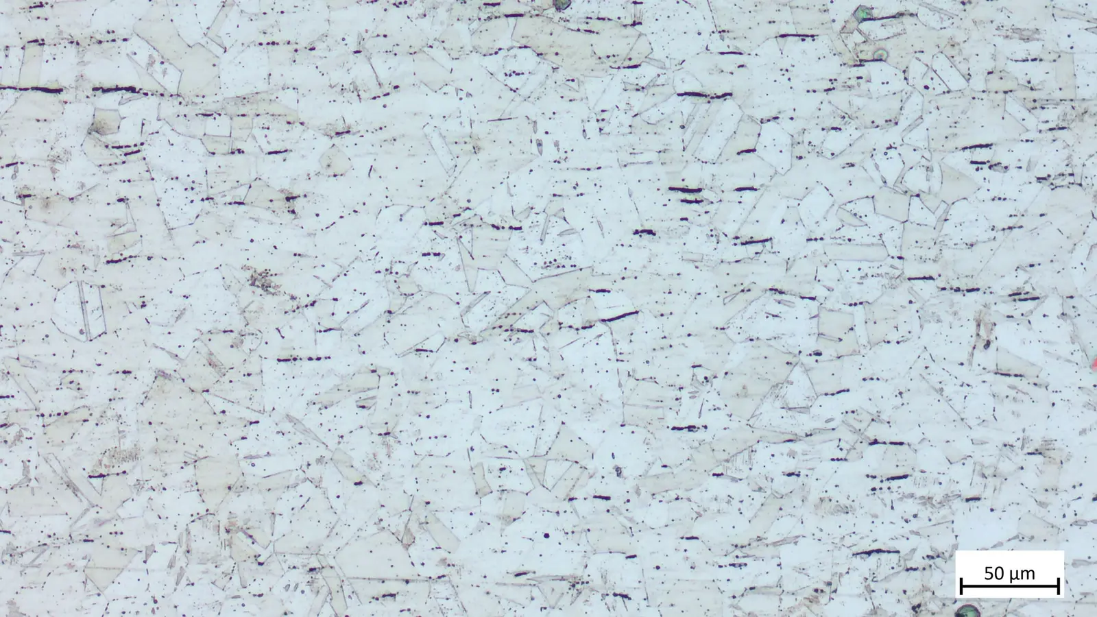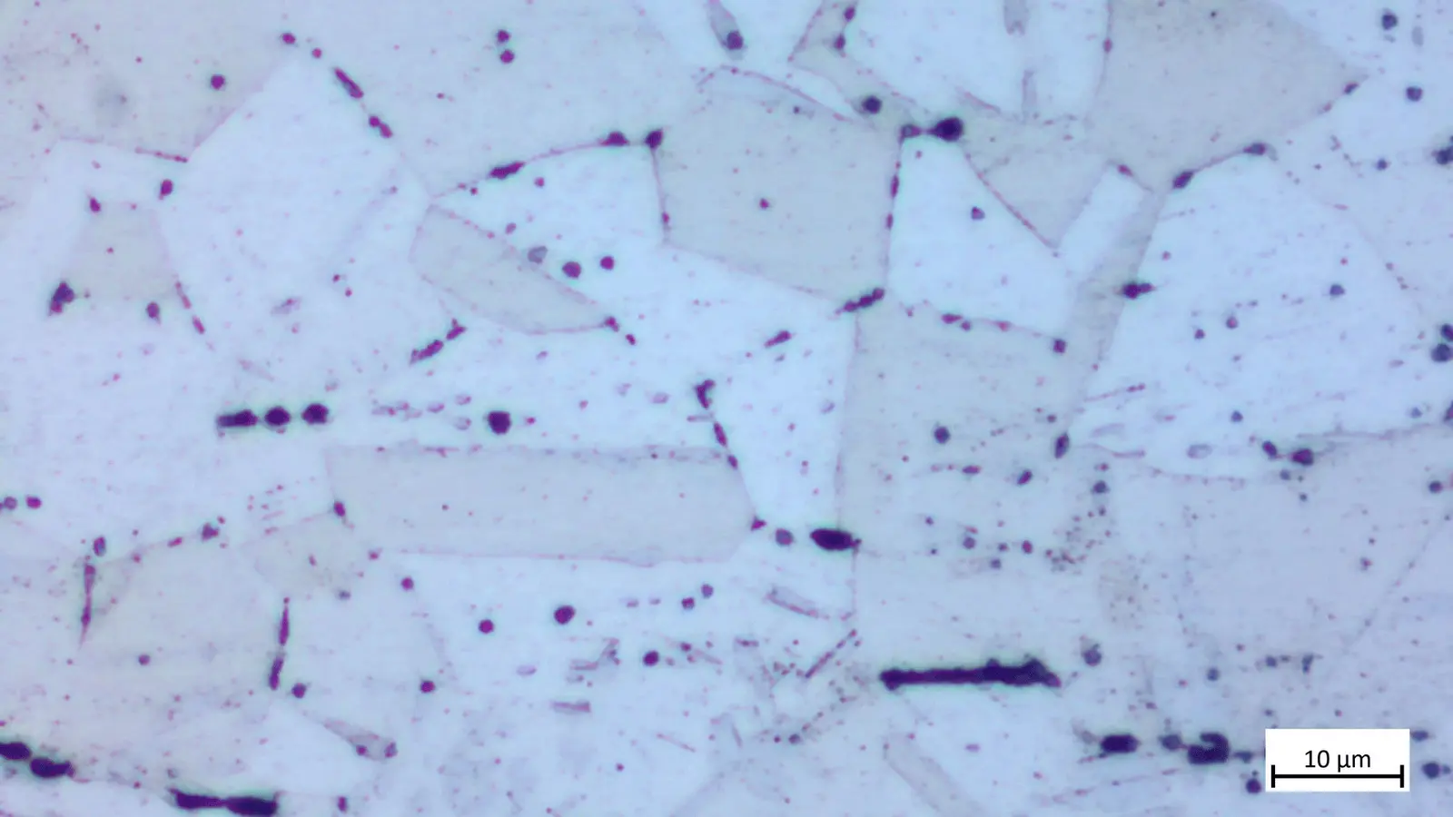 Das kubisch-flächenzentrierte Gitteraufbau des austenitischen Stahls weist die für ihn typischen Zwillingskorngrenzen auf.