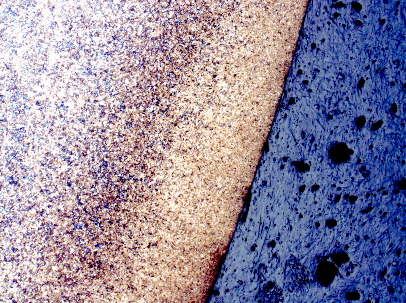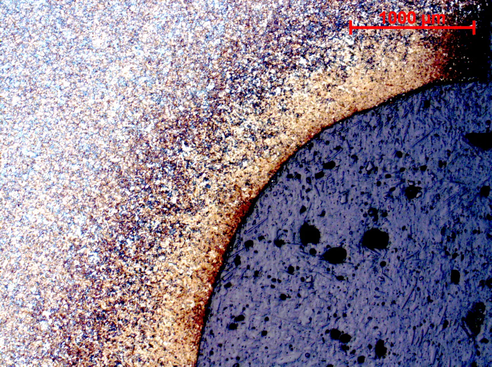 Das Gefüge besteht aus Martensit mit steigendem Anteil an Kohlenstoff im aufgekohlten Randbereich.