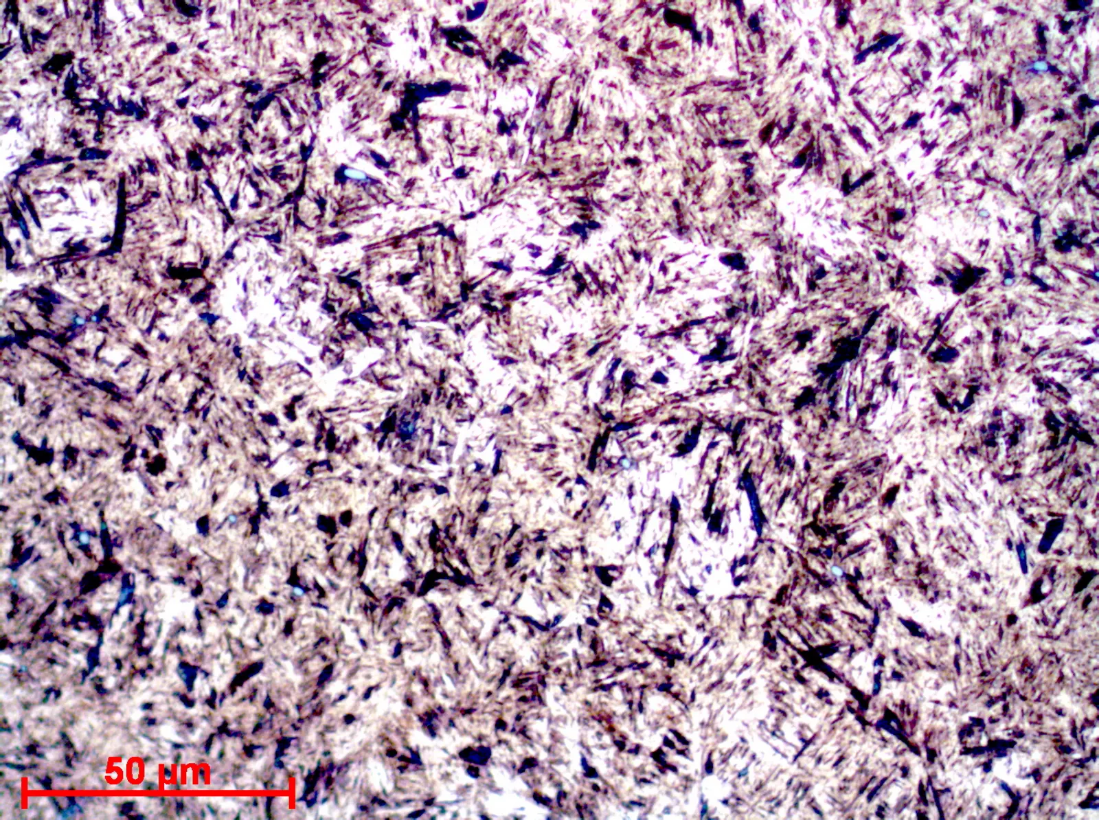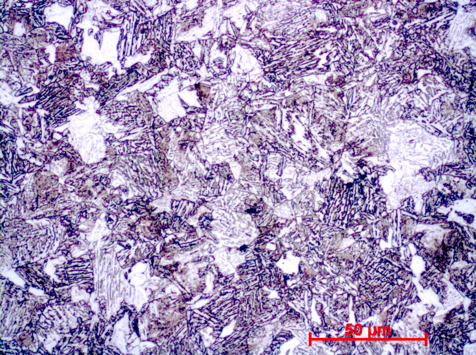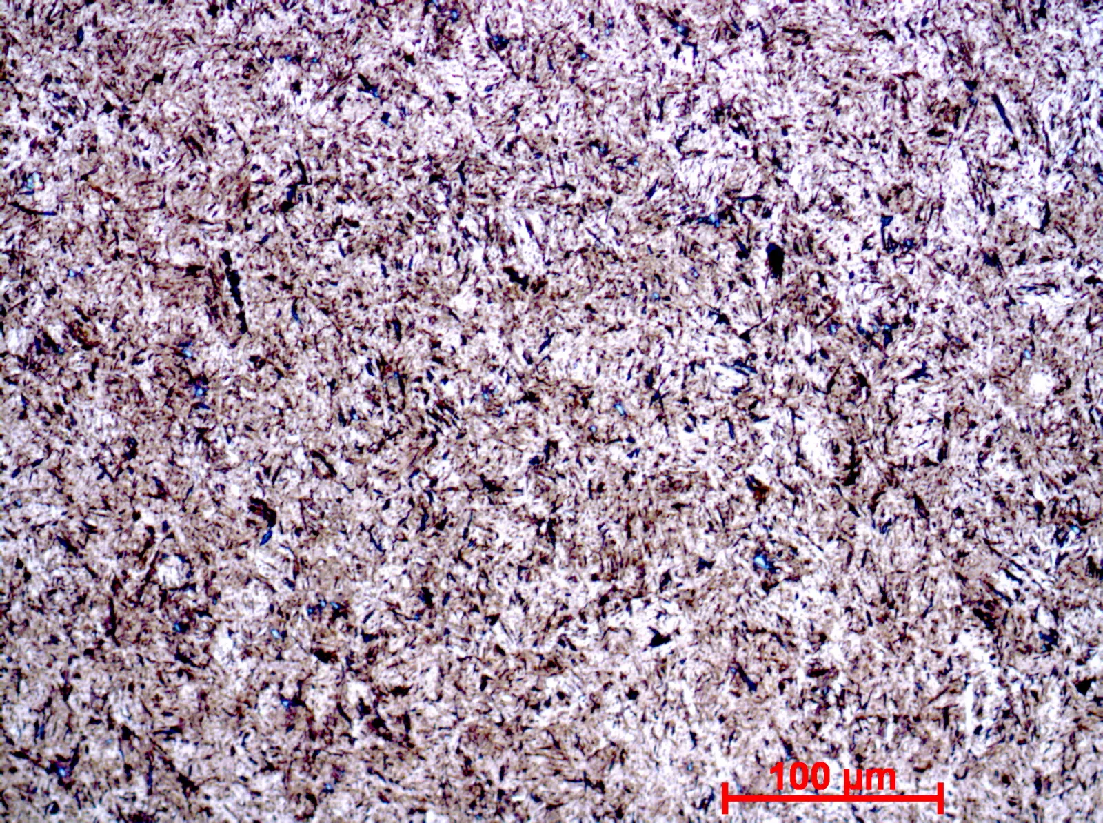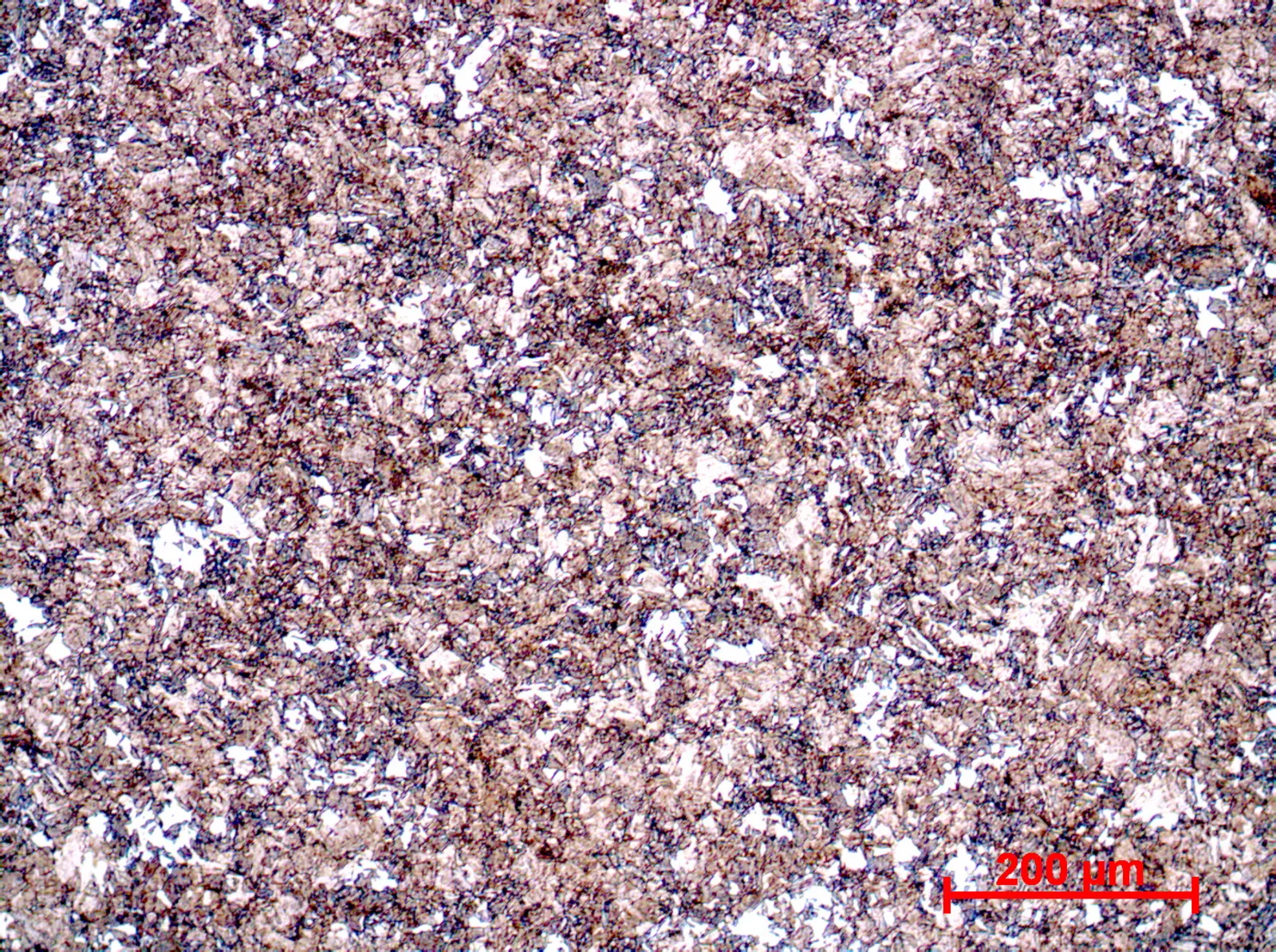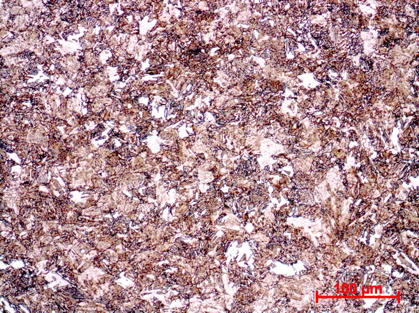 Er besitzt ein martensitisches Grundgefüge in dem Bainitinseln eingelagert sind.