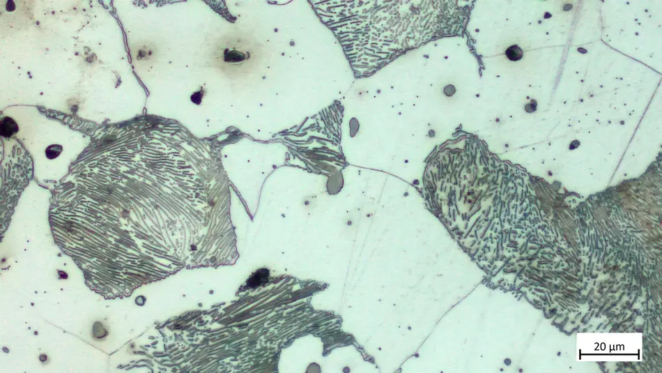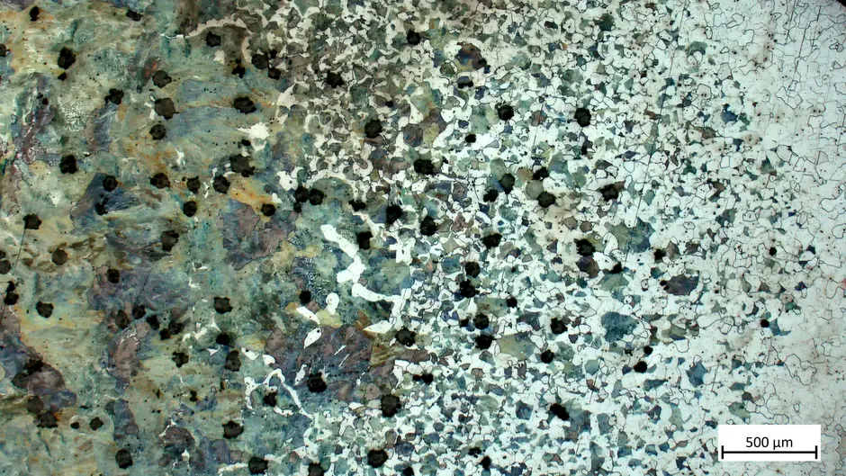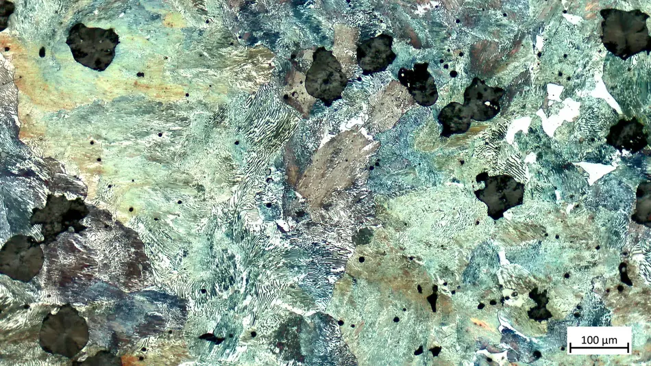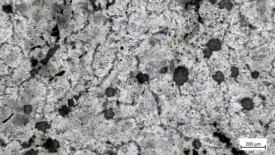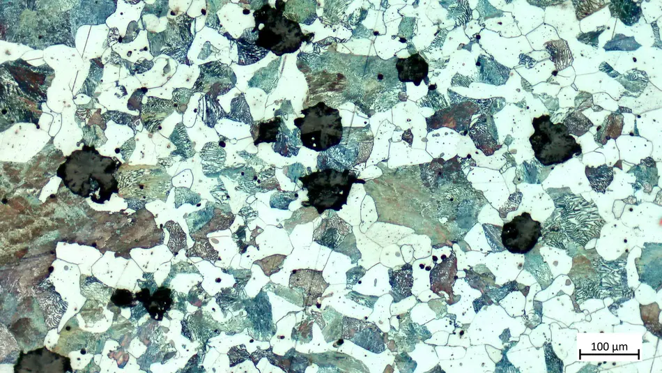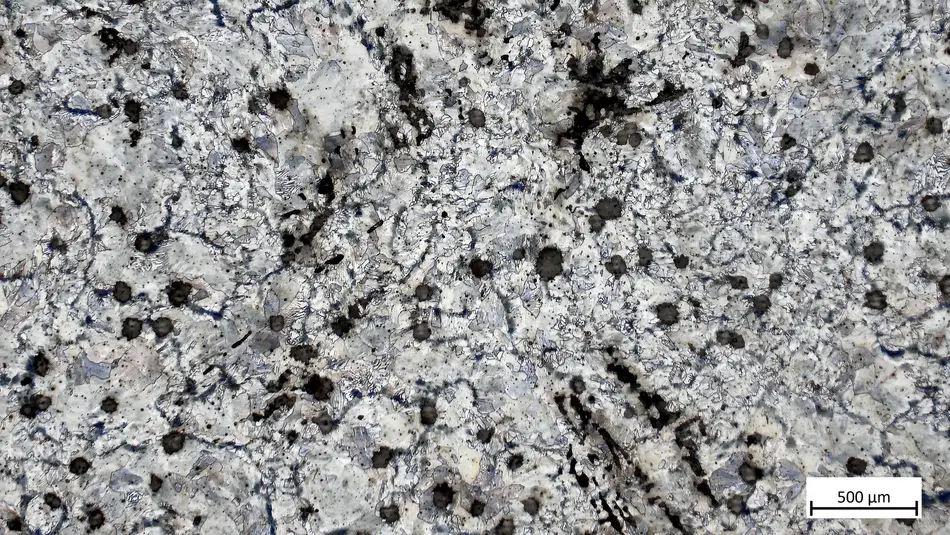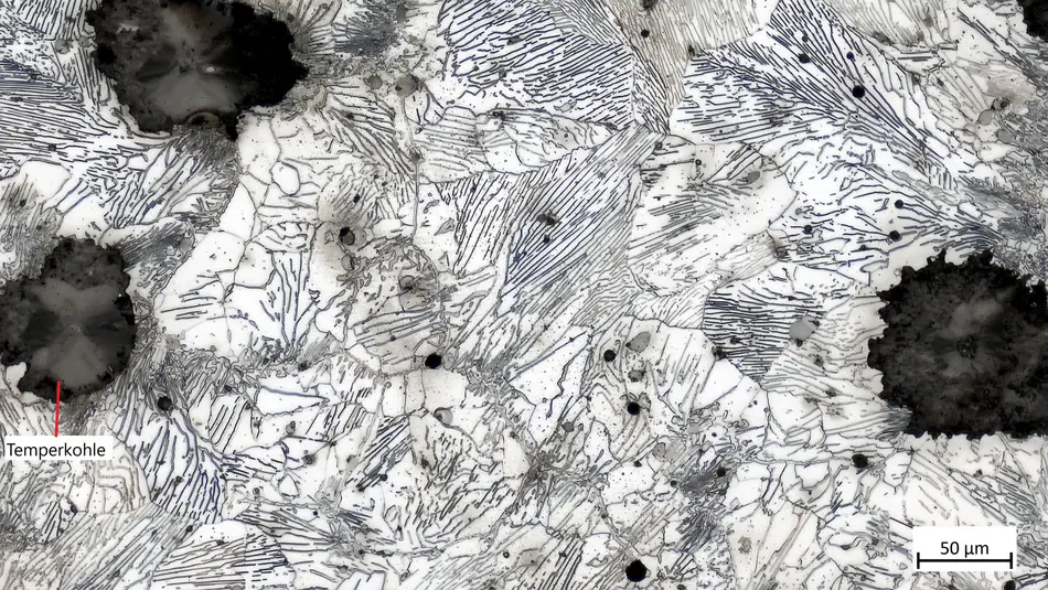 Das Gefüge besteht aus streifigem Perlit, Ferrit, Temperkohle und Sulfideinschlüssen.