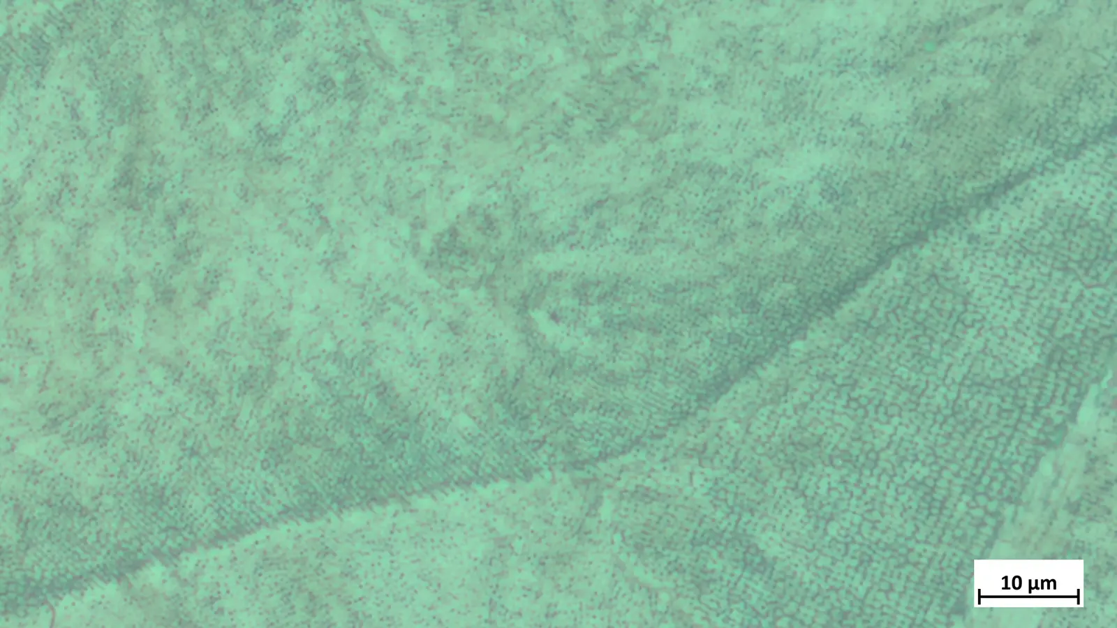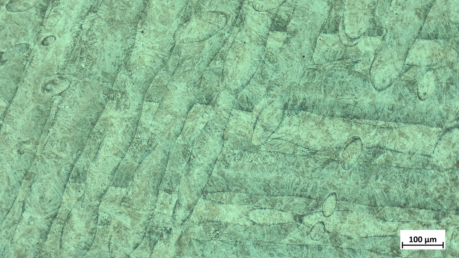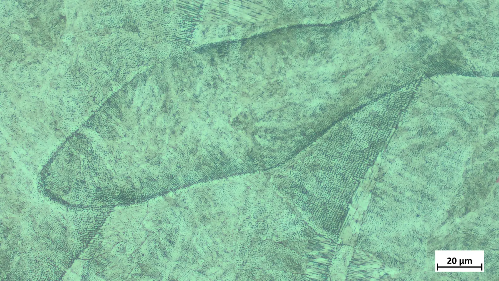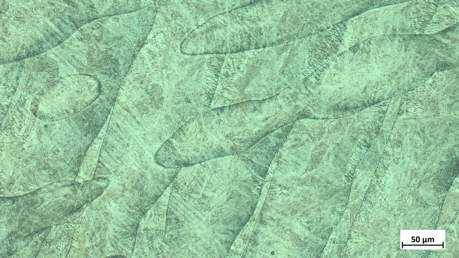 Das vorliegende Gefüge entstand durch additive Fertigung. Die einzelnen Laserbahnen sind gut erkennbar. Durch den Herstellungsprozess hat sich ein sehr fein gefiedertes, martensitisches Gefüge gebildet.