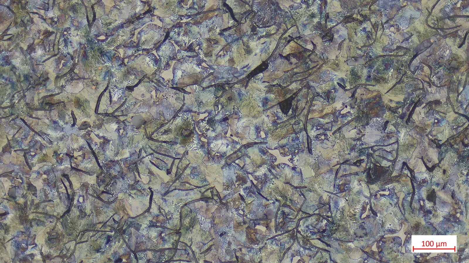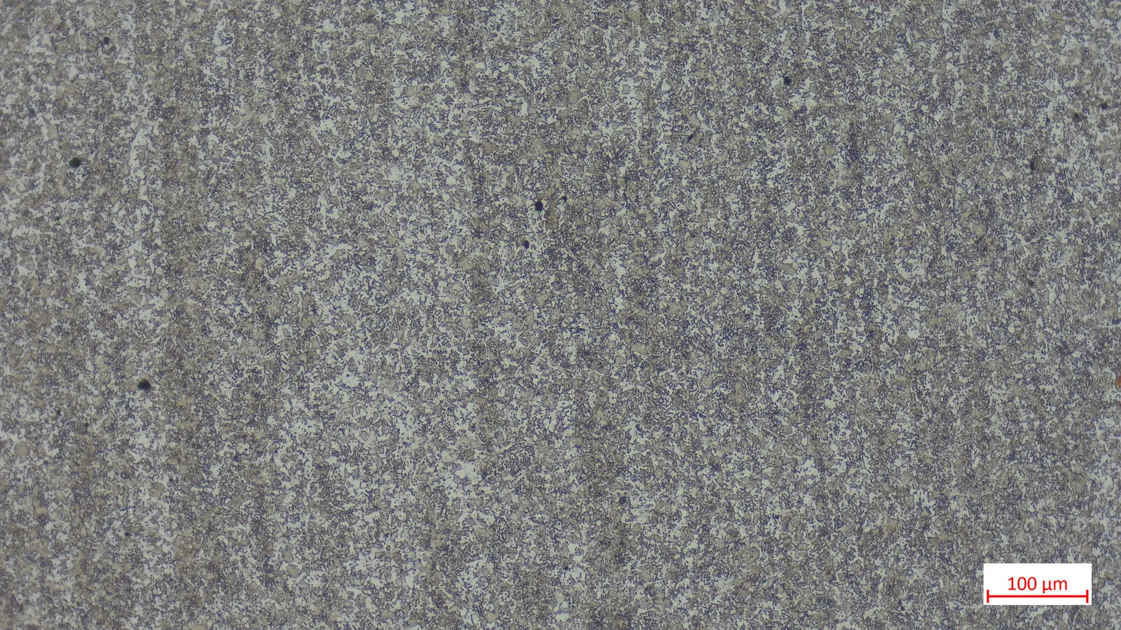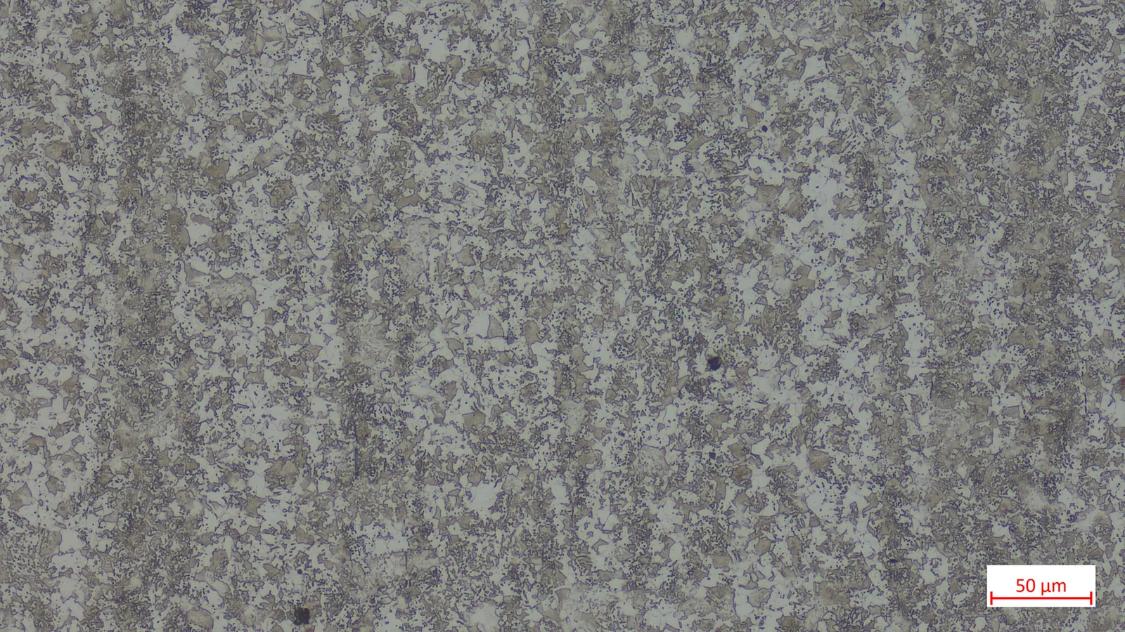Das Gefüge besteht aus Ferrit, Perlit, Primär Karbiden und geringen teilen Martensit. Der Stahl wurde mit Salpetersäure(5%) geätzt.